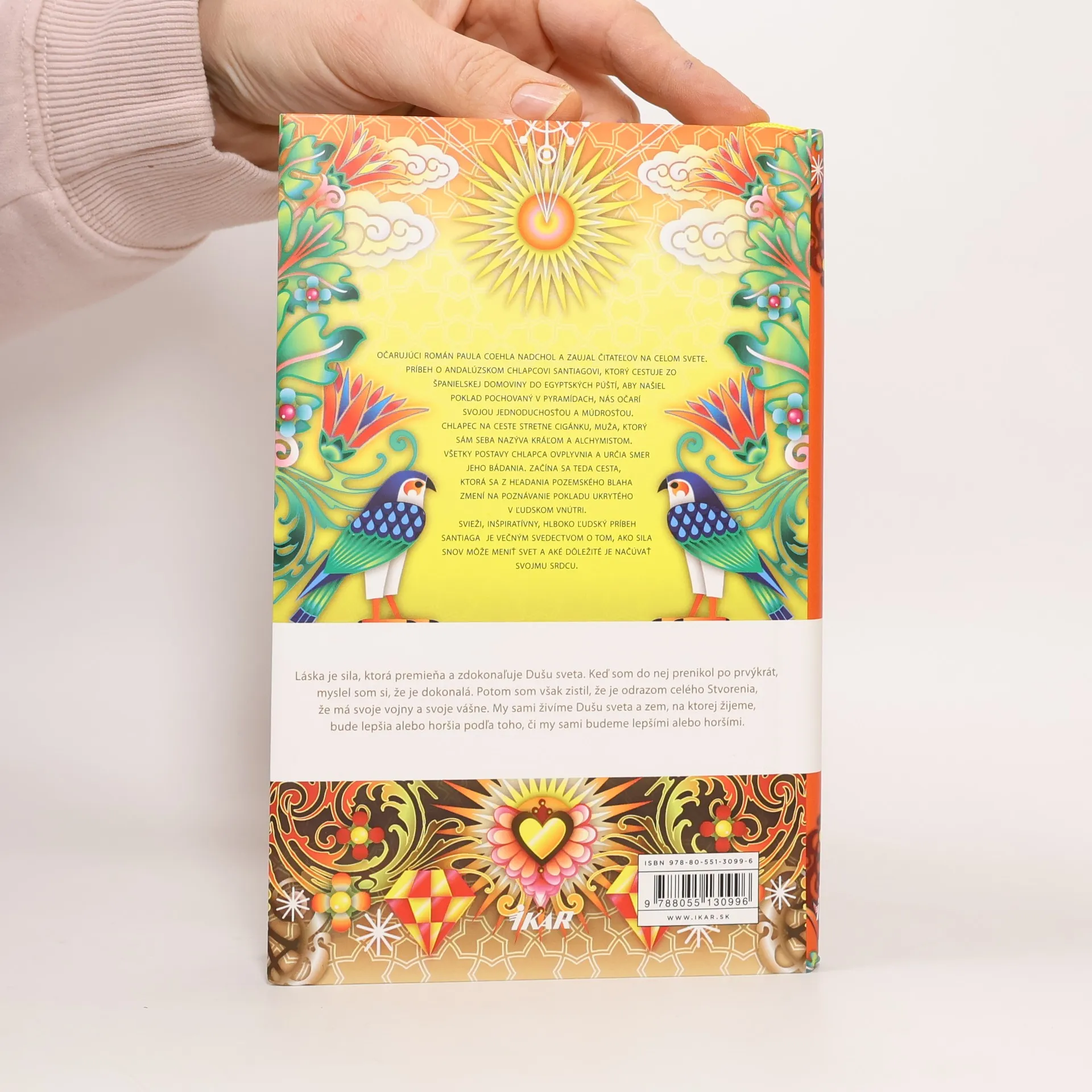 Príbeh o pastierovi Santiagovi, ktorý cestuje zo španielskej domoviny do egyptských púští, aby našiel poklad pochovaný v pyramídach, očarí svojou jednoduchosťou a múdrosťou. Svieži, inšpiratívny, hlboko ľudský príbeh Santiaga je večným svedectvom o tom, ako sila snov môže meniť svet a aké dôležité je načúvať svojmu srdcu. Lebo nezabúdajte: Tvoje srdce je tam, kde je tvoj poklad.
