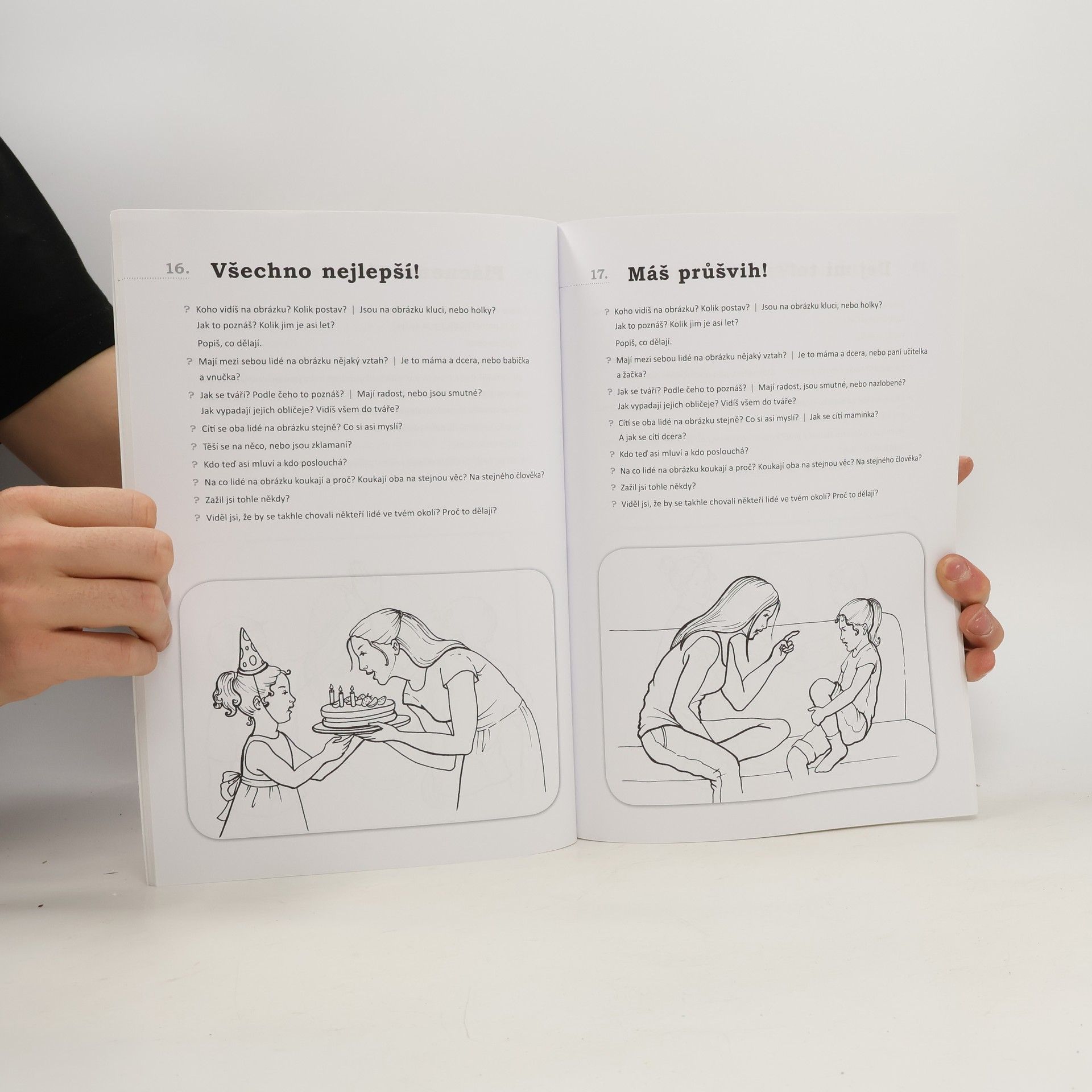 Pracovní sešit se zaměřuje na rozvoj sociálních kompetencí, schopnost číst emoce, rozumět jim, správně je interpretovat. Vede děti k porozumění svým vlastním pocitům, ke schopnosti je adekvátně verbalizovat, vcítit se do pocitů druhých a učí děti hledat tyto pocity kolem sebe v reálných situacích. Rozvíjí u dětí také schopnost pocity interpretovat různě, aby si děti uvědomovaly, že jedna situace může v lidech vzbuzovat různé, někdy dokonce protichůdné emoce. A v neposlední řadě vede děti k rozvoji „teorie mysli“, která je v životě ve skupině jednou z klíčových dovedností. Sešit je určen předškolním dětem a žákům na počátku prvního stupně. Každý pracovní list obsahuje obrázek a k němu připojených několik návodných otázek, které slouží k navázání rozhovoru s dítětem a otevírá široké pole možností, jak může dospělý průvodce s dítětem nad listem pracovat a kam lze dítě vhodnými otázkami směřovat. Na začátku pracovního sešitu jsou uvedeny hlavní emoce, následují jednodušší a přehlednější situace a na závěr pracovního listu jsou pak zařazeny komplexní situace, které jsou emočně velmi pestré.