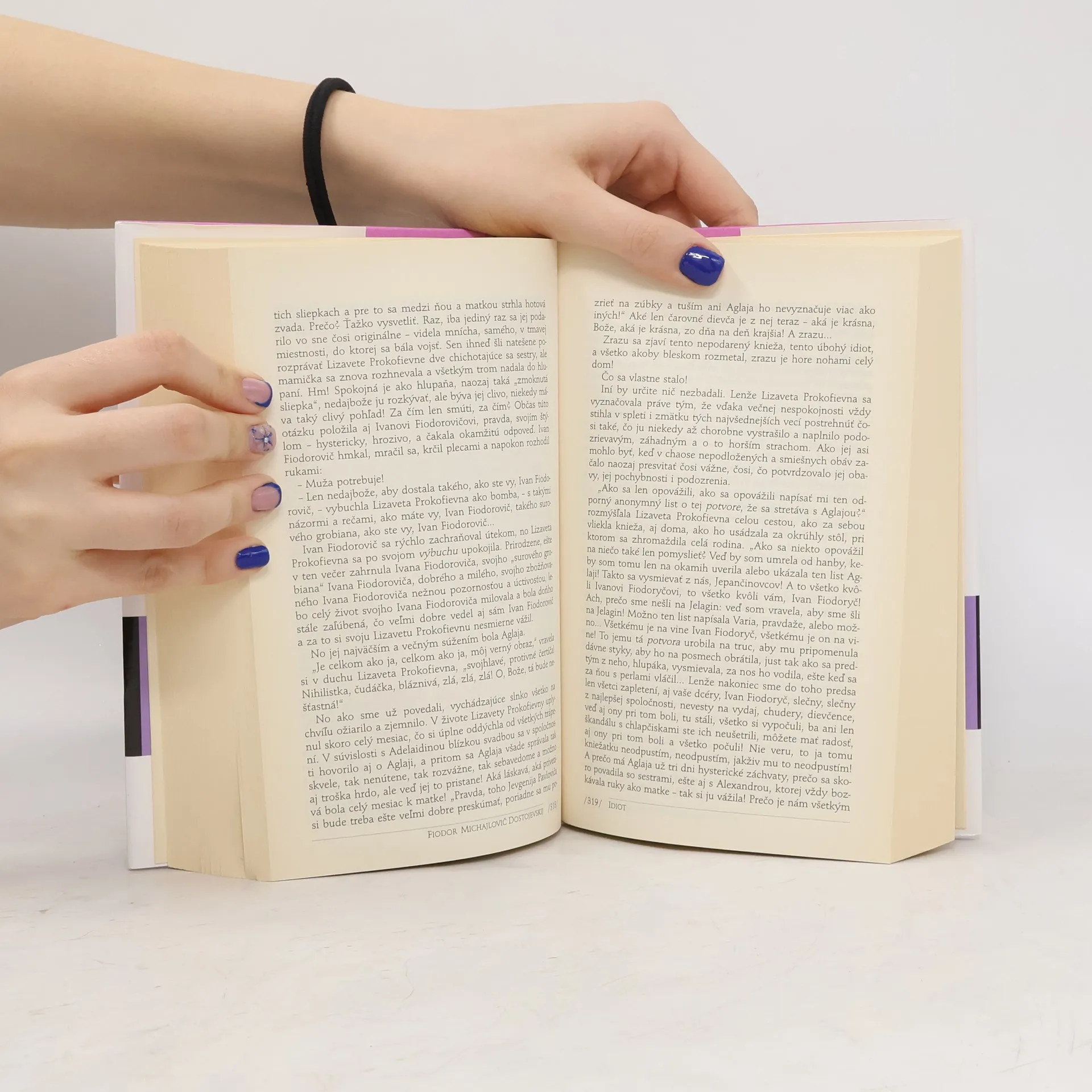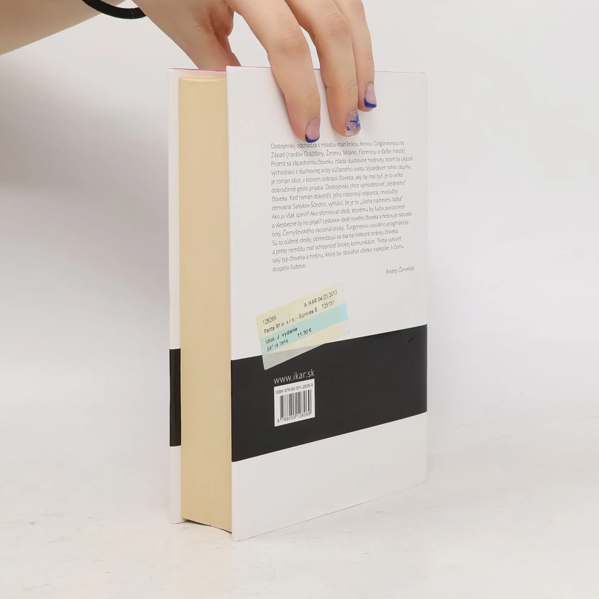 F. M. Dostojevskij privádza svojho hrdinu, knieža Leva Myškina, do sveta plného zloby, falše a nečestnosti. Myškin, stvárnený ako ideálne krásny človek, s detskou dôverčivosťou otvára srdce každému, no často sa stretáva s výsmechom. Jeho povaha pôsobí ako magnet, burcuje cynikov a znepokojuje okolie. Knieža sa snaží pochopiť konanie druhých a prežíva ich emócie, pričom nesie zodpovednosť za krutosti života. Postupne sa stáva obeťou vášní, do ktorých je vťahovaný. Dostojevskij sa s Myškinom hlboko spriazňuje, pričom mu pripisuje aj vlastnú chorobu. Spojuje ju s názorom, že medzi čudáctvom a genialitou epileptikov je len krok. Myškinova genialita spočíva v oblasti ľudskej prirodzenosti a vzťahov, čo je najťažšia výzva. V románe sa ozývajú hrdinovia národných eposov a literárne zápasy v hľadaní ideálov pravdy, dobra a krásy. Toto dielo, piate rozsiahle dielo Dostojevského, sa stalo jedným z najčítanejších v svetovej literatúre. Preložili ho Felix a Hana Kostolanskí z ruského originálu vydaného v Leningrade v roku 1973.
