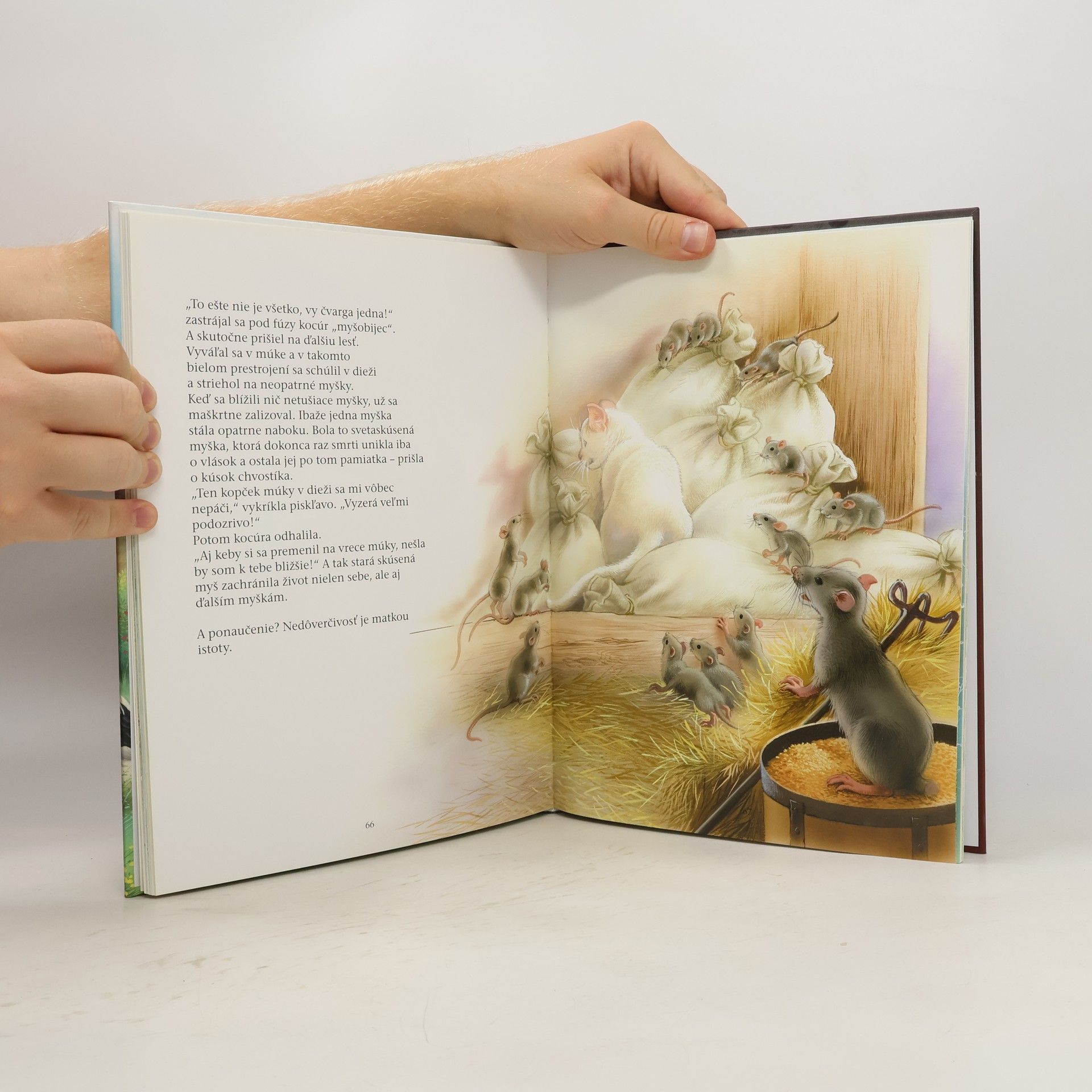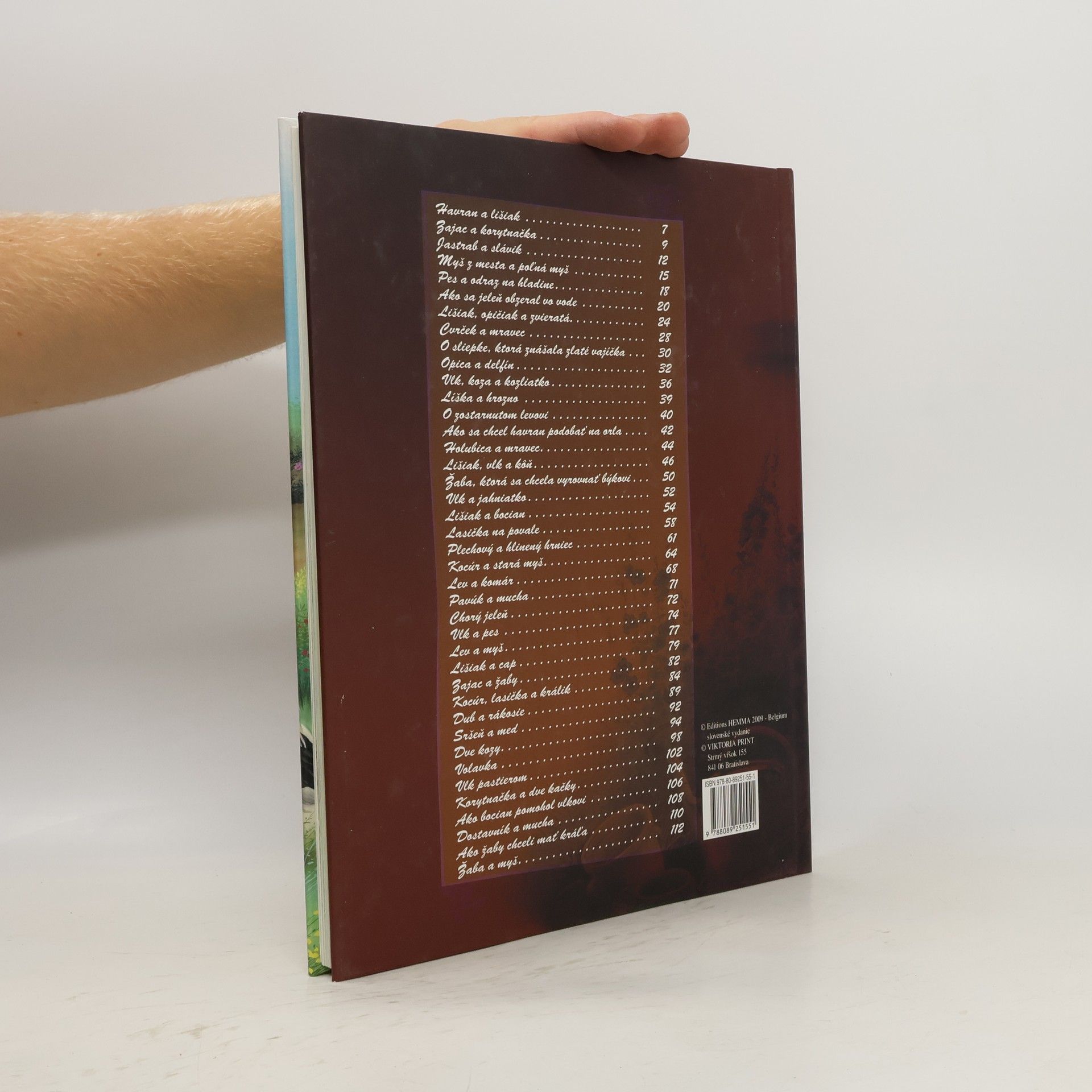 Bájky: Havran a lišiak, Zajac a korytnačka, Jastrab a slávik, Myš z mesta a poľná myš, Pes a odraz na hladine, Ako sa jeleň obzeral vo vode, Lišiak, opičiak a zvieratá, Cvrček a mravec, O sliepke, ktorá znášala zlaté vajíčka, Opica a delfín, Vlk, koza a kozliatko, Lišiak a hrozno, Zostarnutý lev, Ako sa chcel havran podobať orlovi, Holubica a mravec, Lišiak, vlk a kôň, Žaba, ktorá sa chcela vyrovnať býkovi, Vlk a jahniatko, Líška a bocian, Lasička na povale, Železný a hlinený hrniec, Kocúr a stará myš, Lev a komár, Pavúk a lastovička, Chorý jeleň, Vlk a pes, Lev a myš, Lišiak a cap, Zajac a žaby, Kocúr, lasička a králik, Dub a rákosie, Sršeň a med, Dve kozy, Volavka, Vlk pastierom, Korytnačka a dve kačice, Ako bocian pomohol vlkovi, Dostavník a mucha, Ako žaby chceli mať kráľa, Žaba a myš.