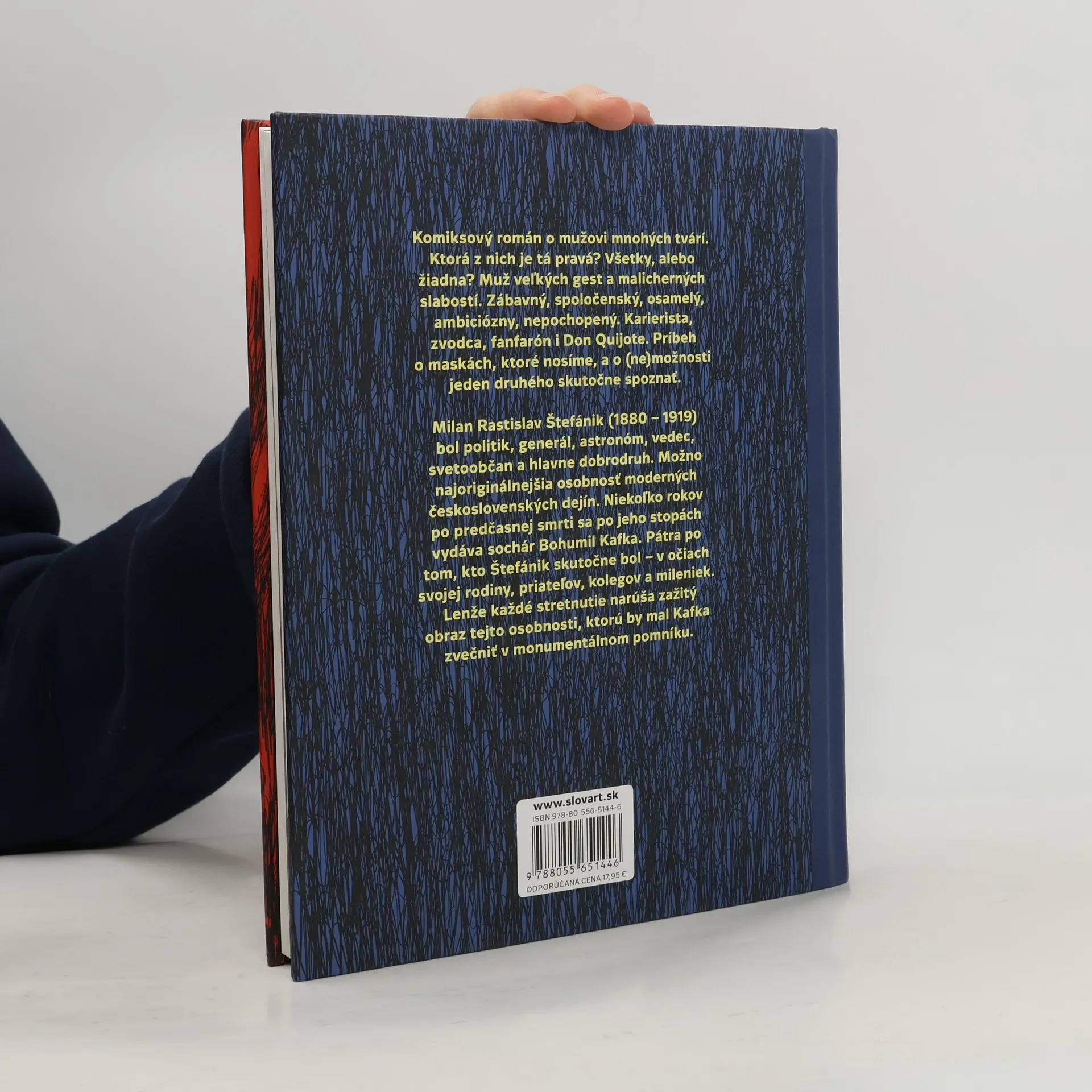 Komiksový román o mužovi mnohých tvárí. Ktorá z nich je tá pravá? Všetky alebo žiadna? Muž veľkých gest a malicherných slabostí. Zábavný, spoločenský, osamelý, ambiciózny, nepochopený. Karierista, zvodca, fanfarón aj Don Quijote. Príbeh o maskách, ktoré nosíme, a o (ne)možnosti jeden druhého skutočne poznať. Milan Rastislav Štefánik (1880 - 1919) bol politik, generál, astronóm, vedec, svetoobčan a predovšetkým dobrodruh. Možno najoriginálnejšia osobnosť moderných československých dejín. Niekoľko rokov po predčasnej smrti sa po jeho stopách vyberie sochár Bohumil Kafka. Pátra po tom, kým Štefánik v skutočnosti bol - v očiach svojej rodiny, priateľov, kolegov, mileniek. Lenže každé stretnutie narúša zaužívaný obraz tejto osobnosti, ktorú by mal Kafka zvečniť v monumentálnom pomníku.