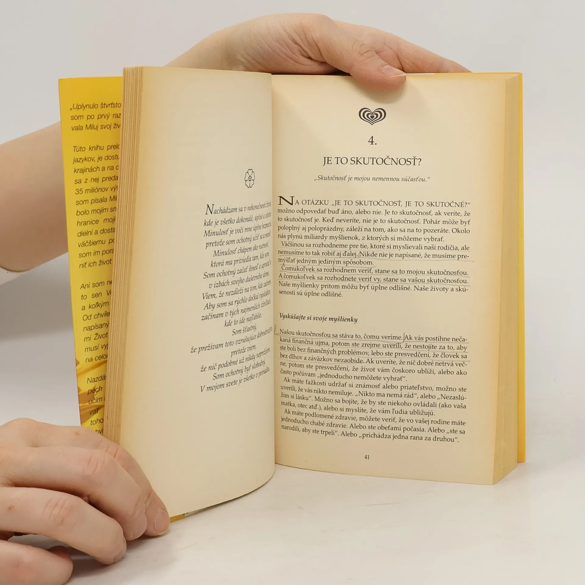 Musím z celého srdce říct, že je to nejúžasnější kniha a autor(ka) světa. Plná lásky, optimismu, pozitivního přístupu k životu a leckomu může i zachránit nebo prodloužit život. Například někomu koho ohrožuje rakovina. Jenom škoda že uplatnění těchto technik a zásad které obsahuje, vyžaduje léta usilovné práce na sobě a velké duševní úsilí. Přesně podle lidového rčení, bez práce nejsou koláče. Může se to zdát průměrnému profánnímu člověku ze střední Evropy také dost nekritické vůči tvrdé realitě. Ale to je právě to co mě na té knížce už v necelých osmnácti letech nejvíce okouzlilo. ❤️☀️