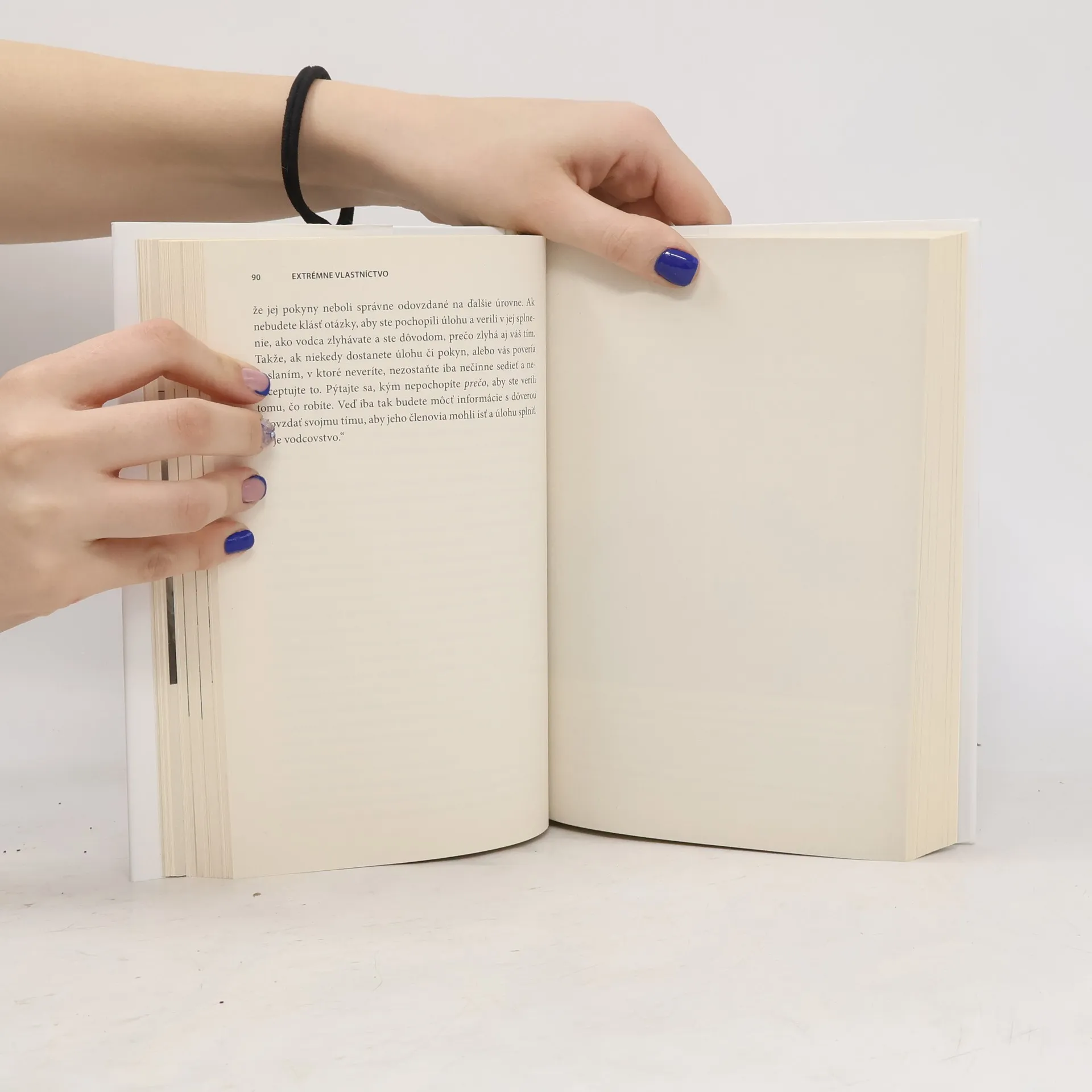 Vodcovstvo a víťazstvo v SEALs, elitných jednotkách amerického námorníctva. Extrémne vlastníctvo – strhujúce rozprávanie s presvedčivou inštruktážou a možnosťou priamej aplikácie núka priam prevratne nový spôsob vedenia podnikov a súčasne vyzýva vedúcich pracovníkov na všetkých postoch, aby naplnili svoje poslanie: viedli a víťazili. Dvaja v bojoch ostrieľaní dôstojníci z tímov U. S. NAVY SEAL, ktorí počas vojny v Iraku viedli tými najvyššími vyznamenaniami dekorovanú špeciálnu bojovú jednotku, ukazujú, ako sa princípy vodcovstva uplatňované v tímoch SEAL dajú vhodne aplikovať v podnikaní a aj v bežnom živote. Autori podrobne opisujú spôsoby myslenia aj princípy, ktoré jednotkám SEAL umožňujú plniť tie najťažšie bojové úlohy, ale aj to, ako sa tie isté princípy a spôsoby myslenia dajú aplikovať vo všetkých tímoch či organizáciách. Každá kapitola je venovaná inej téme, napríklad ako sa kryť a pritom postupovať vpred, ako uplatňovať decentralizované velenie či ako viesť zdola nahor v reťazci vedenia, vysvetľuje daný princíp, prečo je dôležitý aj ako ho zaviesť do praxe v ľubovoľnom prostredí, v ktorom treba ľudí viesť.