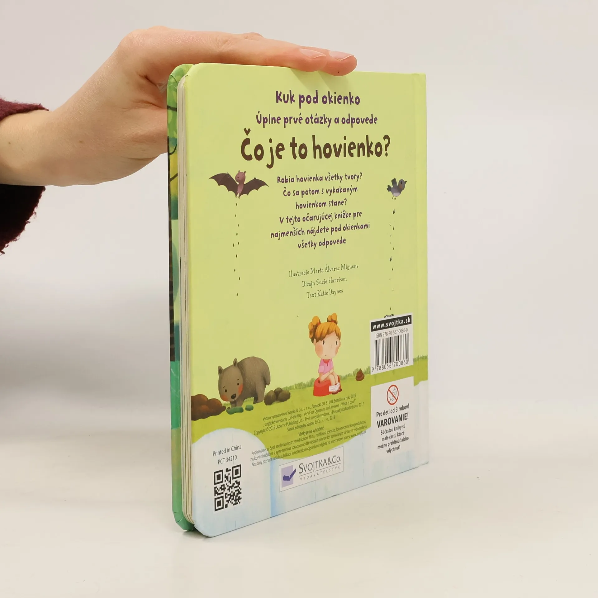 Kakajú všetci. Ale čo sa potom s vykakaným hovienkom stane? Odpovede nájdete pod okienkami v tejto očarujúcej knižke pre najmenších. Hovienka sa robia do plienky, splachujú sa do záchoda, zvieratká robia svoje hovienka vonku... Ale čo to vlastne hovienko je? Vieš, že sú chrobáky, ktoré si robia z hovienok guľôčky, a že králik svoje hovienka dokonca je? Na všetky zvedavé otázky detí na tému „Čo je to hovienko?“ nájdu bezradní rodičia odpovede v tejto úžasnej knižke s odklápacími okienkami.