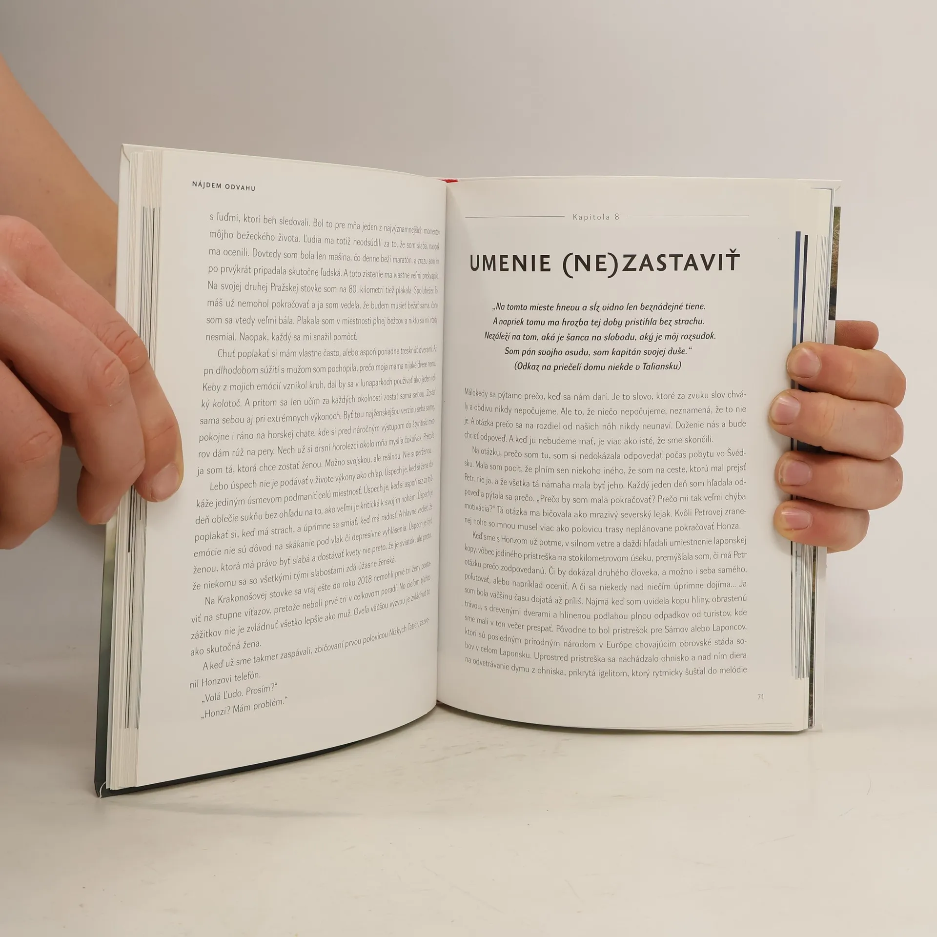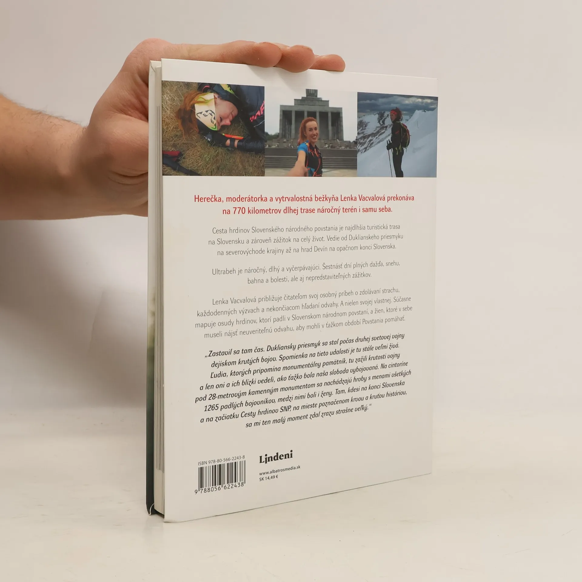 Herečka, moderátorka a vytrvalostná bežkyňa Lenka Vacvalová prekonáva na 770 kilometrov dlhej trase náročný terén i samu seba. Cesta hrdinov Slovenského národného povstania je najdlhšia turistická trasa na Slovensku a zároveň zážitok na celý život. Vedie od Duklianskeho priesmyku na severo-východe krajiny až na hrad Devín na opačnom konci Slovenska. Ultrabeh je náročný, dlhý a vyčerpávajúci. Šestnásť dní plných dažďa, snehu, bahna a bolesti, ale aj nepredstaviteľných zážitkov. Lenka Vacvalová približuje čitateľom svoj osobný príbeh o zdolávaní strachu, každodenných výzvach a nekončiacom hľadaní odvahy. A nie len svojej vlastnej. Súčasne mapuje osudy hrdinov, ktorí padli v Slovenskom národnom povstaní. A žien, ktoré v sebe museli nájsť neuveriteľnú odvahu, aby mohli v ťažkom období povstania pomáhať. „Zastavil sa tam čas. Dukliansky priesmyk sa stal počas druhej svetovej vojny dejiskom krutých bojov. Spomienka na tieto udalosti je tu stále veľmi živá. Ľudia, ktorých pripomína monumentálny pamätník, tu zažili krutosti vojny a len oni a ich blízki vedeli, ako ťažko bola naša sloboda vybojovaná. Na cintoríne pod 28-metrovým kamenným monumentom sa nachádzajú hroby s menami všetkých 1265 padlých bojovníkov, medzi nimi boli i ženy. Tam, kdesi na konci Slovenska a na začiatku Cesty hrdinov SNP, na mieste poznačenom krvou a krutou históriou, sa mi ten malý moment zdal zrazu strašne veľký.“