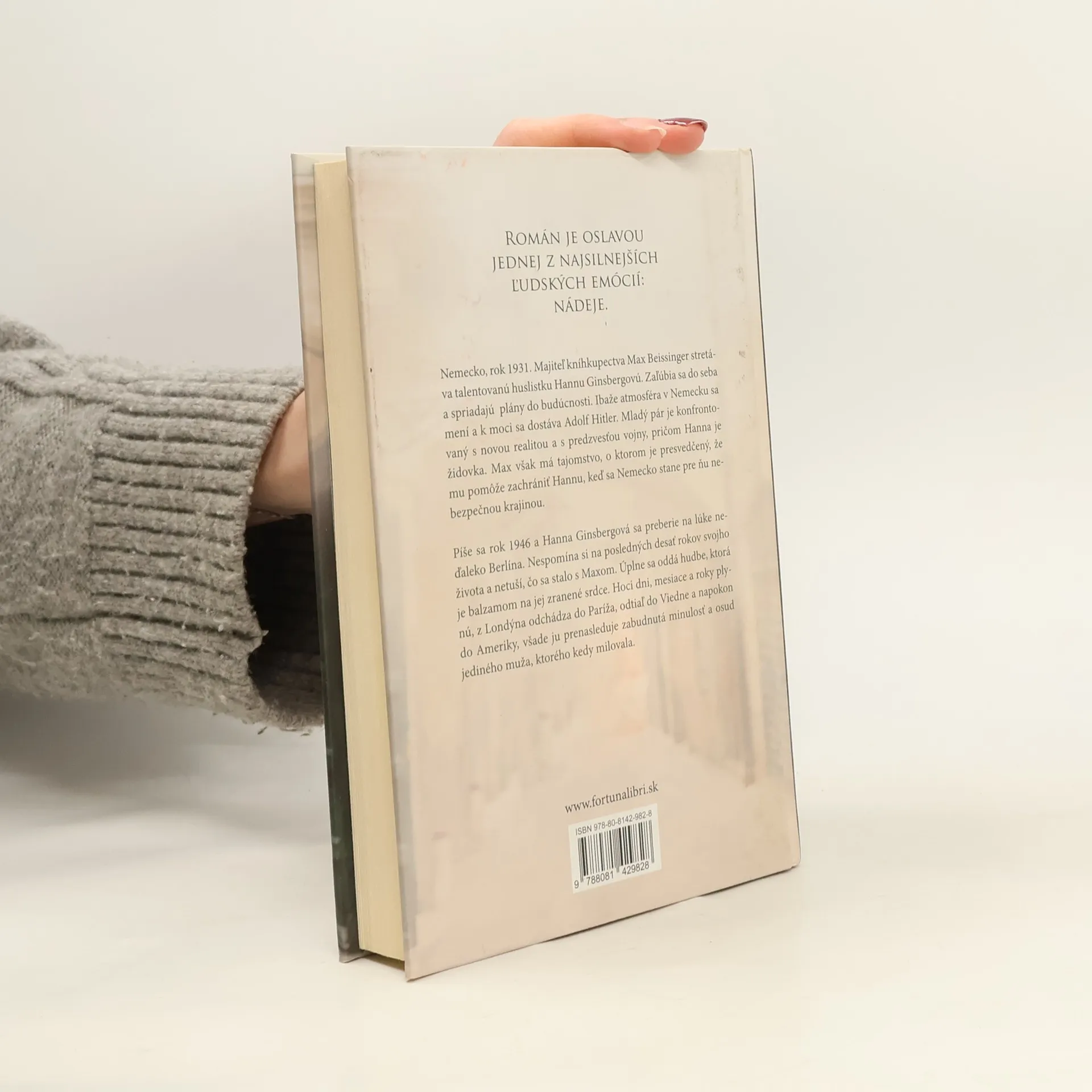 Román je oslavou jednej z najsilnejších ľudských emócií: nádeje. Nemecko, rok 1931. Majiteľ kníhkupectva Max Beissinger stretáva talentovanú huslistku Hannu Ginsbergovú. Zaľúbia sa do seba spriadajú plány do budúcnosti. Ibaže atmosféra v Nemecku sa mení a k moci sa dostáva Adolf Hitler. Mladý pár je konfrontovaný s novou realitou a s predzvesťou vojny, pričom Hanna je židovka. Max však má tajomstvo, o ktorom je presved-čený, že mu pomôže zachrániť Hannu, keď sa Nemecko stane pre ňu nebezpečnou krajinou. Píše sa rok 1946 a Hanna Ginsbergová sa preberie na lúke neďaleko Berlína. Nespomína si na posledných desať rokov svojho života a netuší, čo sa stalo s Maxom. Úplne sa oddá hudbe, ktorá je balzamom na jej zranené srdce. Hoci dni, mesiace a roky plynú, z Londýna odchádza do Paríža, odtiaľ do Viedne a napokon do Ameriky, všade ju prenasleduje zabudnutá minulosť a osud jediného muža, ktorého kedy milovala.