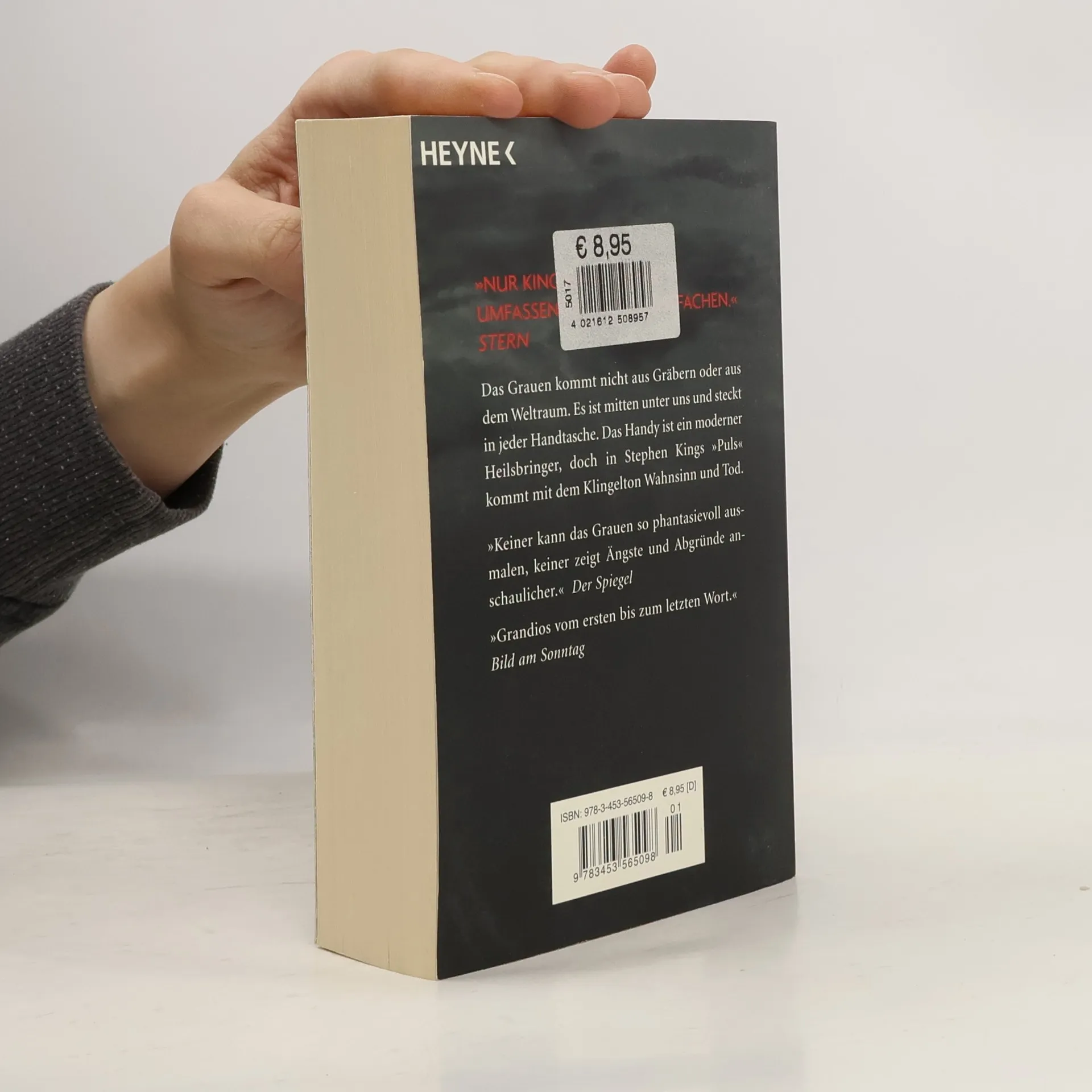 Der Horror hat eine neue Dimension Das Grauen kommt nicht aus Gräbern oder aus dem Weltraum. Es ist mitten unter uns und steckt in jeder Handtasche. Das Handy ist ein moderner Heilsbringer, doch in Stephen Kings „Puls“ kommen mit dem Klingelton Wahnsinn und Tod.Clayton Riddell ist geschäftlich in Boston, hat schon Geschenke für seine Familie besorgt und möchte sich vor der Heimfahrt gerade bei einem Straßenhändler ein Eis kaufen, als die Welt untergeht. Geschäftsleute, Schüler, Busfahrer, alle Menschen, die in diesem Moment ein Handy am Ohr haben, laufen wie auf einen geheimen Befehl hin Amok, fallen übereinander her, schlachten sich gegenseitig ab, stürzen sich ins Verderben. Irgendwie können Clay, ein kleiner Mann mit Schnurrbart und ein junges Mädchen, das beinahe von ihrer Mutter umgebracht worden wäre, sich in ein Hotel retten. Sie sind völlig abgeschnitten von der Außenwelt. Clay will unbedingt herausfinden, wie es um seine Frau und vor allem um seinen Sohn Johnny steht, der gerade in der Schule war, als der mörderische Irrsinn losging. Zu ihm muss Clay Kontakt aufnehmen, bevor ein anderer es per Handy tut. Die Suche nach Johnny wird zur Schreckensmission durch eine apokalyptische Welt.