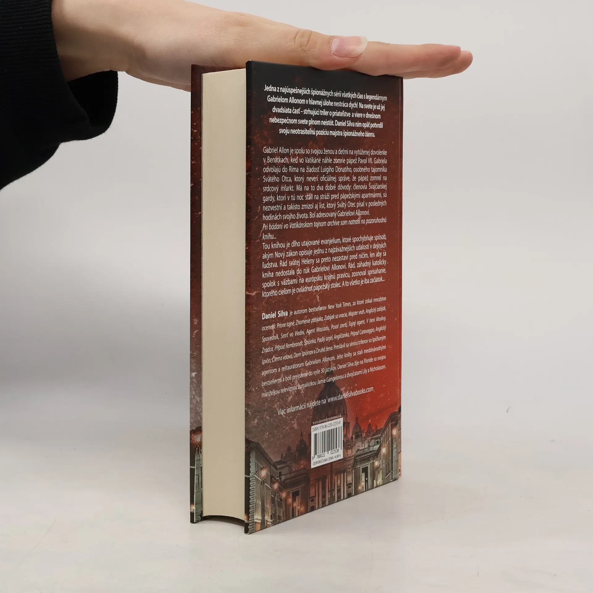 Jedna z najúspešnejších špionážnych sérií všetkých čias s legendárnym Gabrielom Allonom v hlavnej úlohe nestráca dych! Na svete je už jej dvadsiata časť – strhujúci triler o priateľstve a viere v dnešnom nebezpečnom svete plnom neistôt. Daniel Silva ním opäť potvrdil svoju neotrasiteľnú pozíciu majstra špionážneho žánru. Gabriel Allon je spolu so svojou ženou a deťmi na vytúženej dovolenke v Benátkach, keď vo Vatikáne náhle zomrie pápež Pavol VII. Gabriela odvolajú do Ríma na žiadosť Luigiho Donatiho, osobného tajomníka Svätého Otca, ktorý neverí oficiálnej správe, že pápež zomrel na srdcový infarkt. Má na to dva dobré dôvody: členovia Švajčiarskej gardy, ktorí v tú noc stáli na stráži pred pápežskými apartmánmi, sú nezvestní a takisto zmizol aj list, ktorý Svätý Otec písal v posledných hodinách svojho života. Bol adresovaný Gabrielovi Allonovi. Pri bádaní vo Vatikánskom tajnom archíve som natrafil na pozoruhodnú knihu... Tou knihou je dlho utajované evanjelium, ktoré spochybňuje spôsob, akým Nový zákon opisuje jednu z najzávažnejších udalostí v dejinách ľudstva. Rád svätej Heleny sa preto nezastaví pred ničím, len aby sa kniha nedostane do rúk Gabrielovi Allonovi. Rád, záhadný katolícky spolok s väzbami na európsku krajnú pravicu, zosnoval sprisahanie, ktorého cieľom je ovládnuť pápežský stolec. A to všetko je iba začiatok...
