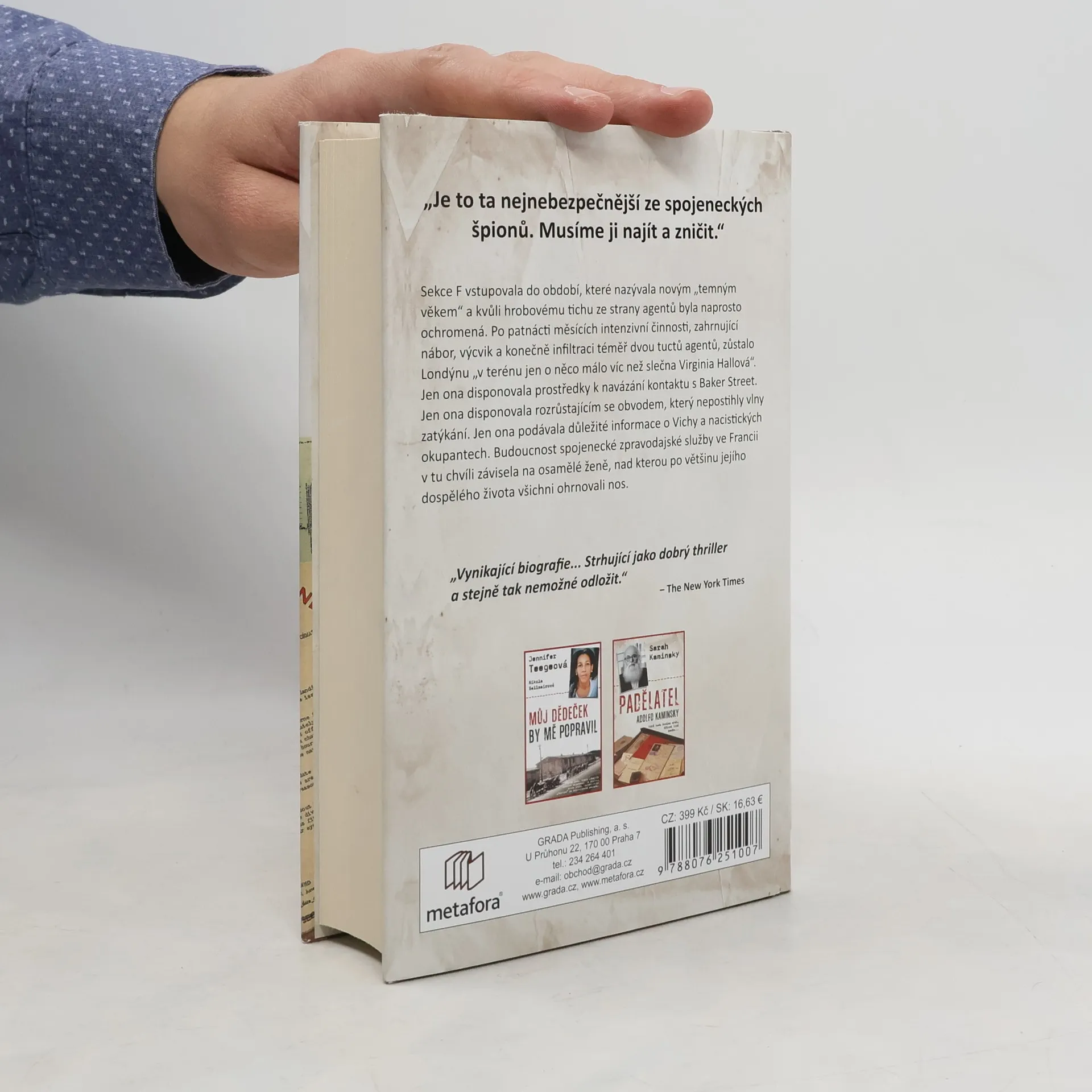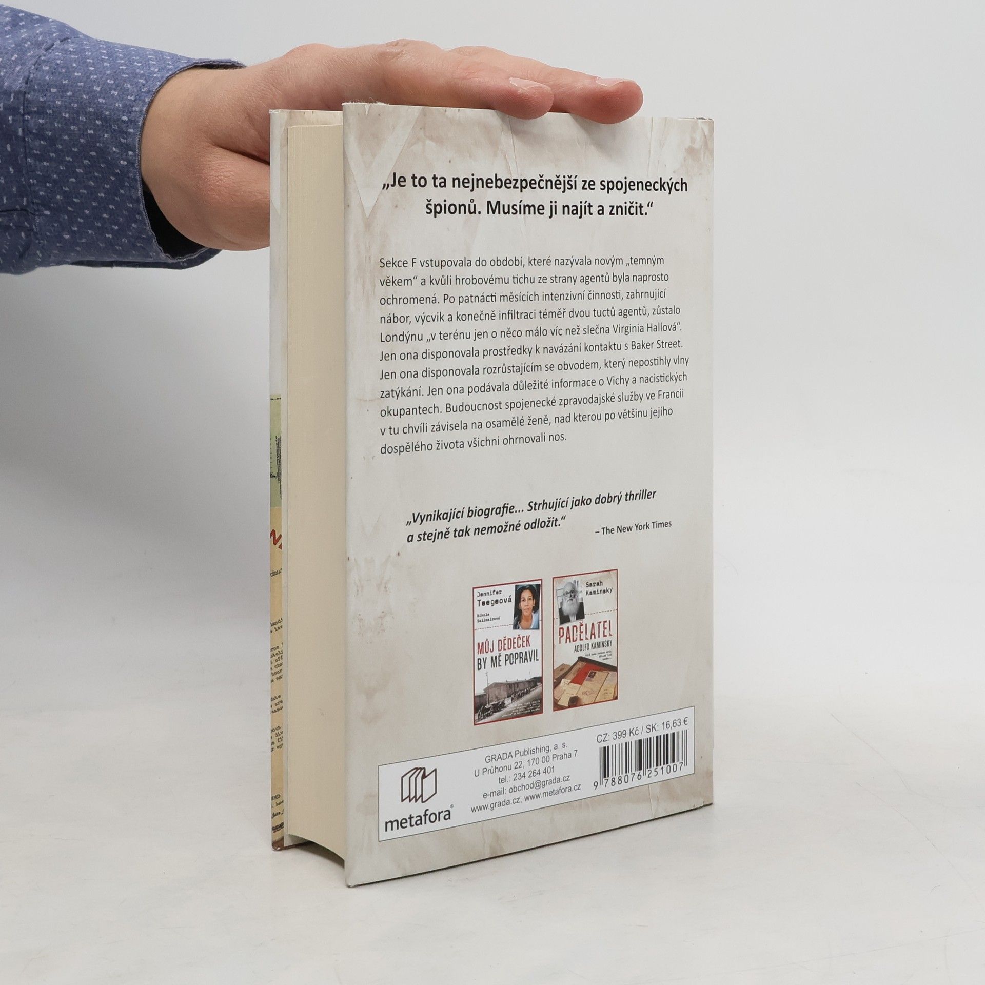 Dosud nezveřejněný příběh špionky, ze které mělo strach i samotné gestapo, přináší fascinující pohled na život Virginie Hallové. Pocházela z majetné rodiny z Baltimoru, kde studovala jazyky a ekonomii. Pracovala na americké ambasádě ve Varšavě a snila o kariéře na Ministerstvu zahraničí, ale po nehodě při lovu v roce 1932 přišla o nohu, což její ambice zkomplikovalo. Přesto se dokázala prosadit ve službách britské rozvědky, stala se první ženou nasazenou za nepřátelskou linií, kde vybudovala rozsáhlé špionážní sítě ve Francii. Byla klíčovou osobou odboje, organizovala shozy zbraní a výbušnin a stala se průkopnicí tajného bojiště. Gestapo po ní neúnavně pátralo, plakáty s její podobiznou visely téměř všude a byla na ni vypsaná odměna, ale ona odmítala z Francie odejít. Až po odhalení uprchla přes Pyreneje do Španělska, ale brzy se vrátila, aby vedla úspěšnou partyzánskou válku proti nacistům během invaze v Normandii. Sonia Purnellová na základě nových informací a rozsáhlého výzkumu odhaluje tajný život Virginie Hallové v inspirativním příběhu o hrdinství a osobním vítězství nad nepřízní osudu, ukazujícím, jak vytrvalost jedné ženy pomohla vyhrát nejdůležitější válku v historii.