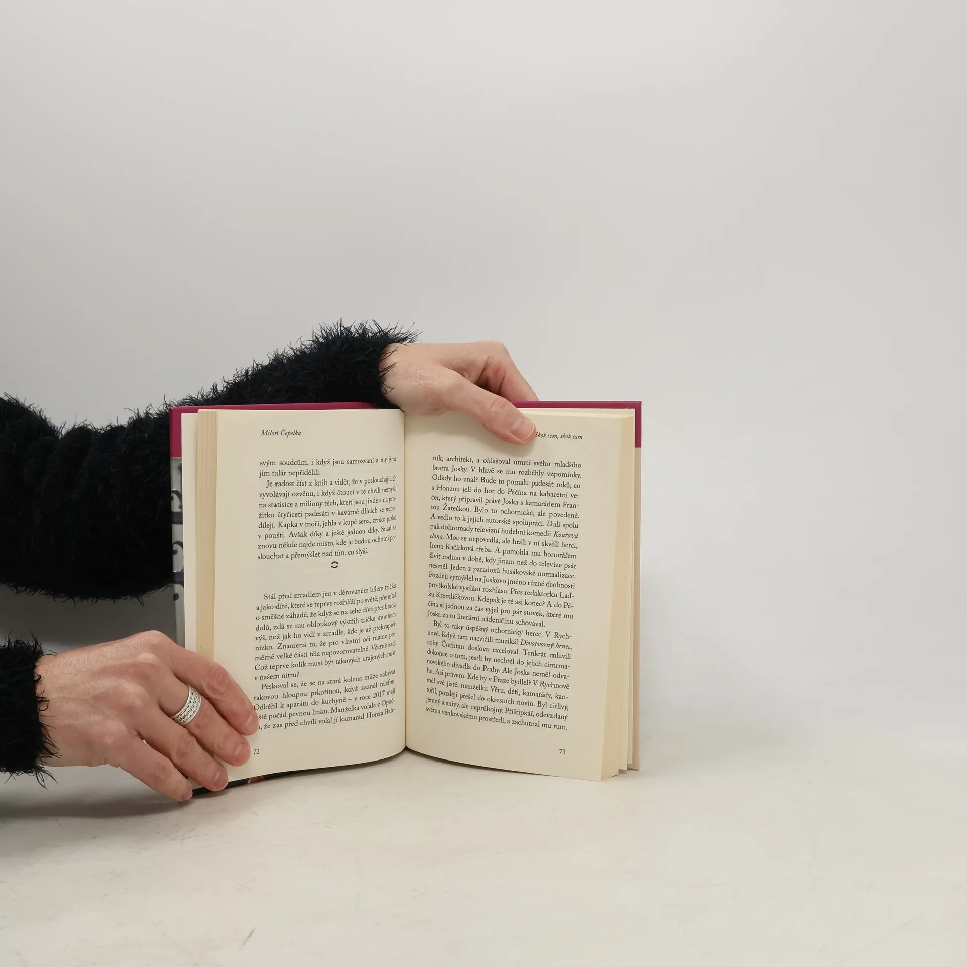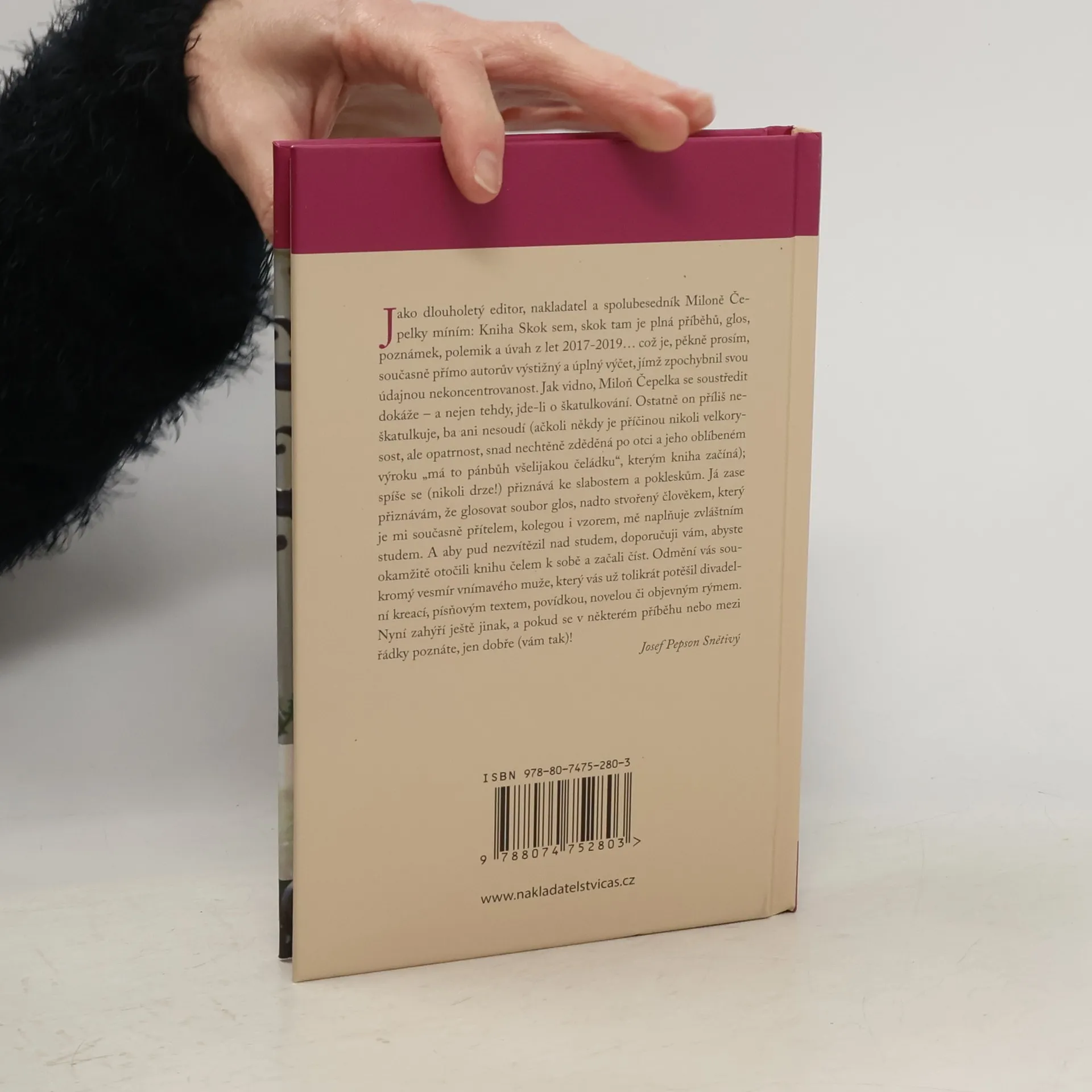 Dlouholetý editor, nakladatel a spolubesedník Miloně Čepelky Josef Pepson Snětivý říká o této publikaci, která vychází k třiaosmdesátým narozeninám všestranného umělce a spoluzakladatele Divadla Járy Cimrmana: „Kniha Skok sem, skok tam je plná příběhů, glos, poznámek, polemik a úvah z let 2017-2019… což je, pěkně prosím, současně přímo autorův výstižný a úplný výčet, jímž zpochybnil svou údajnou nekoncentrovanost. Jak vidno, Miloň Čepelka se soustředit dokáže – a nejen tehdy, jde-li o škatulkování. Ostatně on příliš neškatulkuje, ba ani nesoudí (ačkoli někdy je příčinou nikoli velkorysost, ale opatrnost, snad nechtěně zděděná po otci a jeho oblíbeném výroku ,má to pánbůh všelijakou čeládku‘, kterým kniha začíná); spíše se (nikoli drze!) přiznává ke slabostem a pokleskům. Já zase přiznávám, že glosovat soubor glos, nadto stvořený člověkem, který je mi současně přítelem, kolegou i vzorem, mě naplňuje zvláštním studem. A aby pud nezvítězil nad studem, doporučuji vám, abyste se do knihy začetli, a to rovněž soustředěně. Odmění vás soukromý vesmír vnímavého muže, který vás už tolikrát potěšil divadelní kreací, písňovým textem, povídkou, novelou či objevným rýmem. Nyní zahýří ještě jinak, a pokud se v některém příběhu nebo mezi řádky poznáte, jen dobře (vám tak)!“