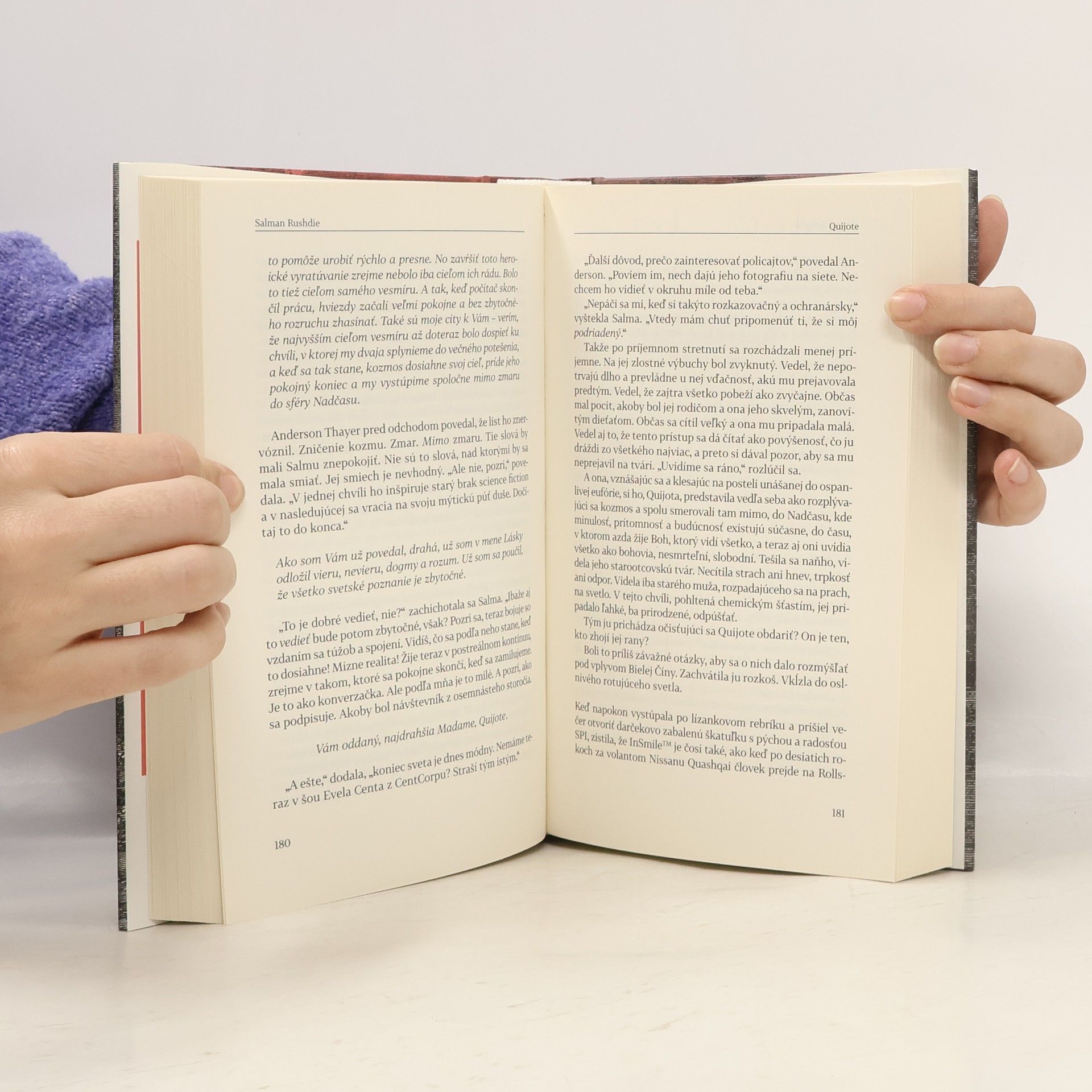 Najnovší román Salmana Rushdieho je románom v románe. Priemerný autor špionážnych románov Sam Du Champ, inšpirovaný Cervantesovým klasickým dielom, stvorí Quijota - popleteného obchodného cestujúceho, ktorý je posadnutý televíziou. Keď sa Quijote zaľúbi do televíznej hviezdy, spolu so svojím (vymysleným) synom Sanchom sa vydá na dobrodružnú cestu po Amerike, aby dokázal, že je hoden jej ruky. Statočne zdoláva tragikomické nástrahy „veku, keď sa môže stať hocičo".