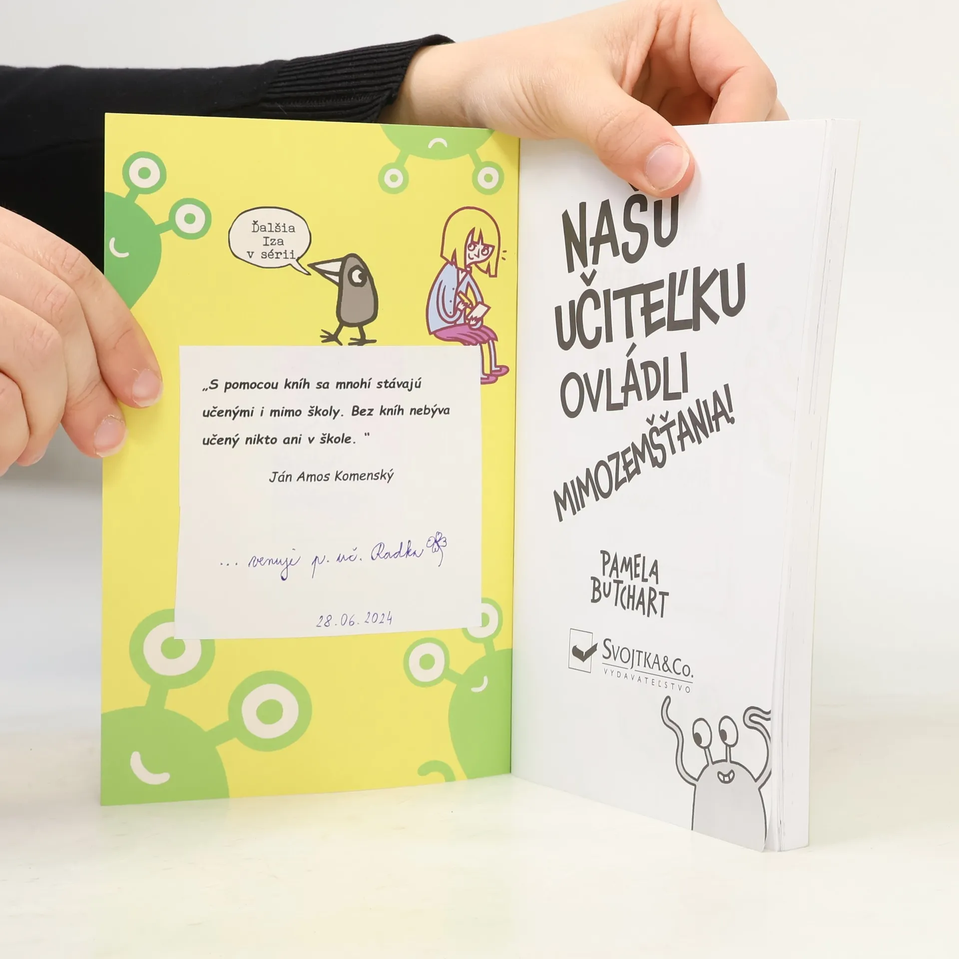 Tretiačke Líze a jej trom kamarátom je naozaj divné, že na nich začala byť ich triedna učiteľka milá!. A čo sa preboha chystá urobiť s tým zákerne sa tváriacim plyšovým medveďom? Pani učiteľka nie je ten typ človeka, čo by mal rád medvedíky. Je to skôr ten typ, čo neznáša šteniatka a štíti sa mačiatok. Existuje jediné možné vysvetlenie: pani učiteľku ovládli mimozemšťania! Humorný príbeh zo školského prostredia rozpráva jeho hlavná protagonistka Líza, ktorá si neberie servítky a všetko komentuje s úprimnosťou a bezprostrednosťou sebe vlastnou. Kniha pobaví deti od siedmich rokov, aj ich rodičov. A že všetko bude nakoniec úplne inak, než sa zdá? To zistíme. Snáď nebudeme úplne mimo, keď povieme, že sa pri tom mimozemsky krutopísne nasmejete.