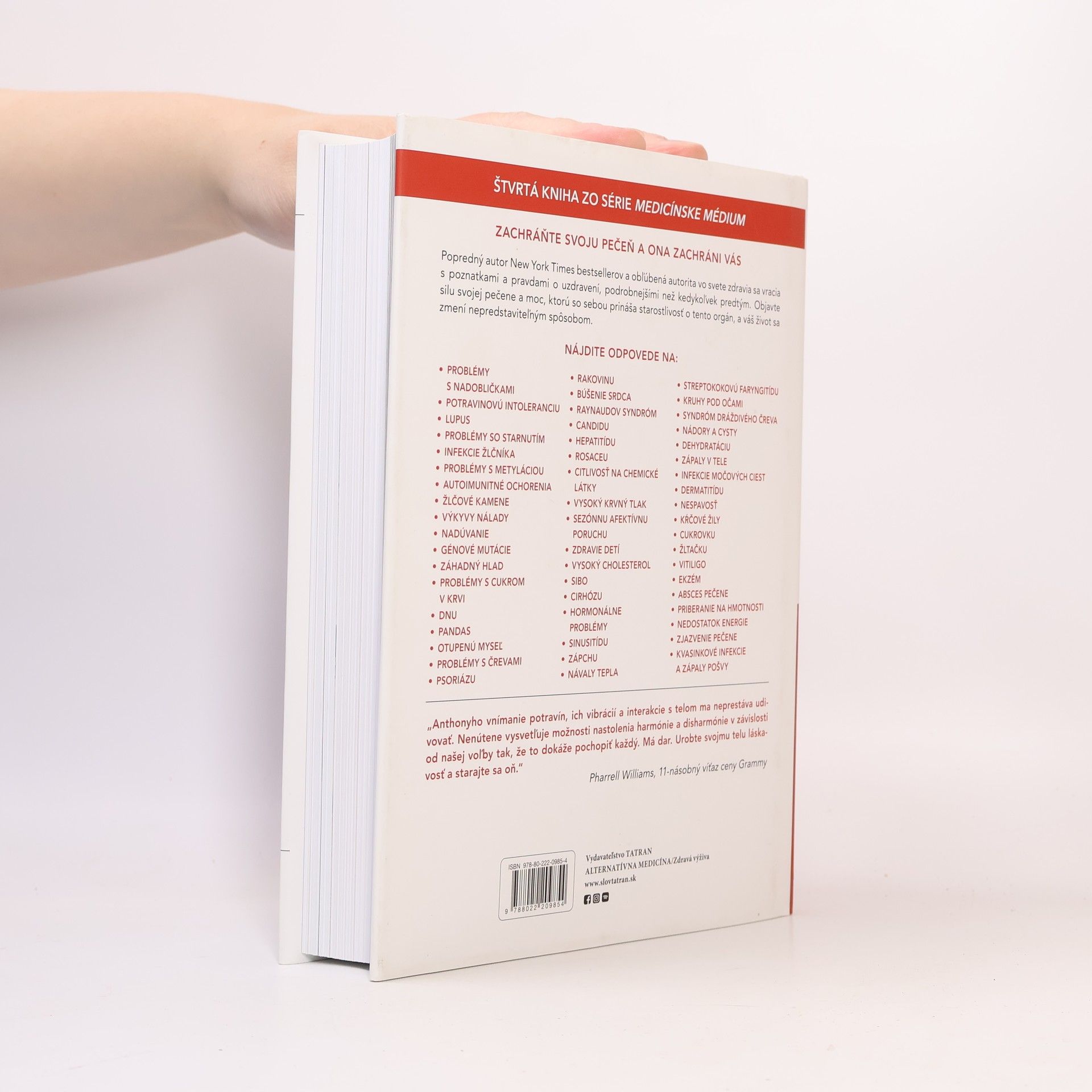 Táto kniha doslova kraľuje medzi publikáciami Anthonyho Williama. Z každej vety sa nám prihovára pravda. Dozvieme sa nové a netradičné informácie, ktoré nikde inde nenájdeme. Navyše je veľmi zrozumiteľná. Kniha Medicínske médium: Záchrana pečene ponúka odpovede, ktoré ste mali poznať už veľmi dávno. Medicínske médium Anthony William s typickým zanietením prináša jedinečný pohľad na doposiaľ neobjavené funkcie tohto životodarného orgánu, vysvetľuje, čo sa skrýva za desiatkami zdravotných problémov, ktoré nám strpčujú život, a ponúka detailný návod, ako máme postupovať, aby sme ho prežili čo najlepšie. Sami zistíte, čo so sebou prináša takáto záchrana pečene – budete rozvážnejší, pokojnejší, šťastnejší a schopnejší prispôsobiť sa dnešnej hektickej dobe. Dozviete sa, ako zlepšiť spánok, nastoliť rovnováhu cukru v krvi, znížiť krvný tlak, schudnúť či vyzerať a cítiť sa mladšie. Zdravá pečeň vás zbaví stresu, bude to váš spojenec v boji.