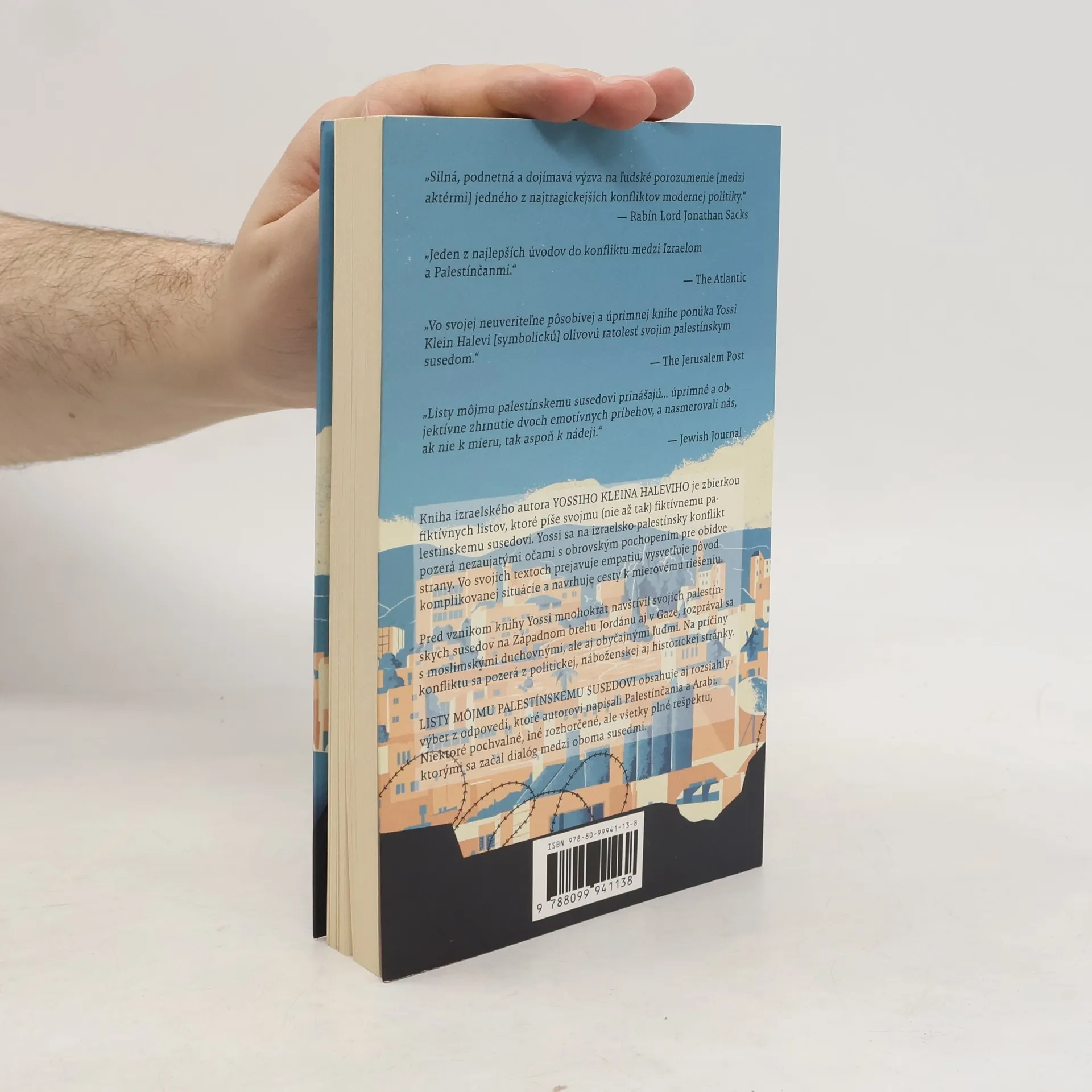 Kniha izraelského autora YOSSIHO KLEINA HALEVIHO je zbierkou fiktívnych listov, ktoré píše svojmu (nie až tak) fiktívnemu palestínskemu susedovi. Yossi sa na izraelsko-palestínsky konflikt pozerá nezaujatými očami s obrovským pochopením pre obidve strany. Vo svojich textoch prejavuje empatiu, vysvetľuje pôvod komplikovanej situácie a navrhuje cesty k mierovému riešeniu. Pred vznikom knihy Yossi mnohokrát navštívil svojich palestínskych susedov na Západnom brehu Jordánu aj v Gaze, rozprával sa s moslimskými duchovnými, ale aj obyčajnými ľuďmi. Na príčiny konfliktu sa pozerá z politickej, náboženskej aj historickej stránky. LISTY MÔJMU PALESTÍNSKEMU SUSEDOVI obsahuje aj rozsiahly výber z odpovedí, ktoré autorovi napísali Palestínčania a Arabi. Niektoré pochvalné, iné rozhorčené, ale všetky plné rešpektu, ktorými sa začal dialóg medzi oboma susedmi.