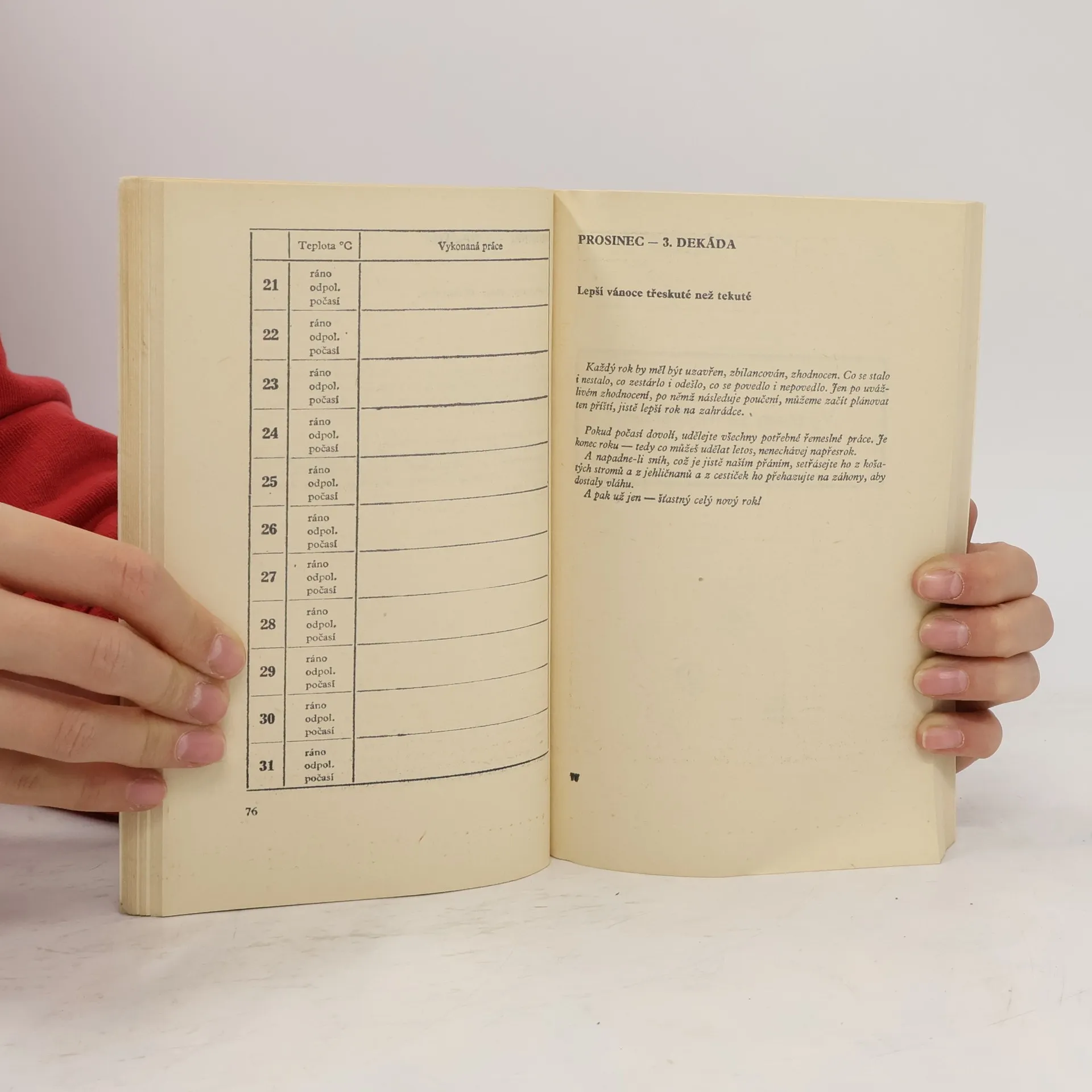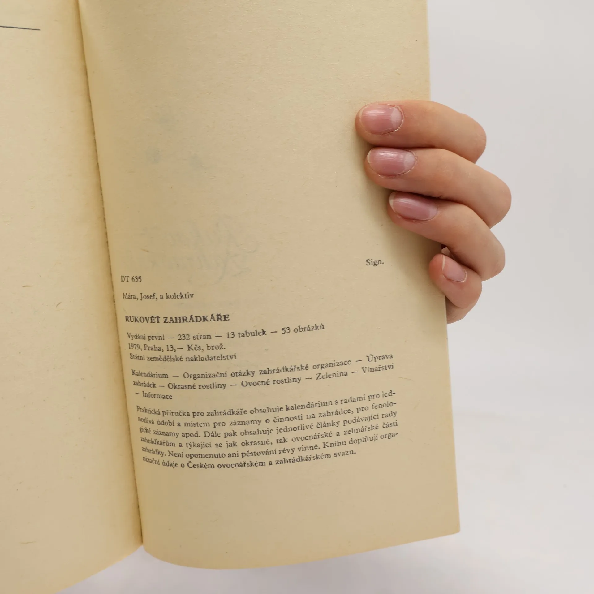 Praktická příručka je určena nejširší zahrádkářské veřejnosti. Úvodní část, kalendárium, umožňuje vpisovat poznámky o činnosti na zahrádce apod. Hlavní část obsahuje kapitoly z právních předpisů, ovocnářství, zelinářství, květinářství a sadovnictví. Závěrem knihy jsou uvedeny všeobecné rady pro zahrádkáře.
