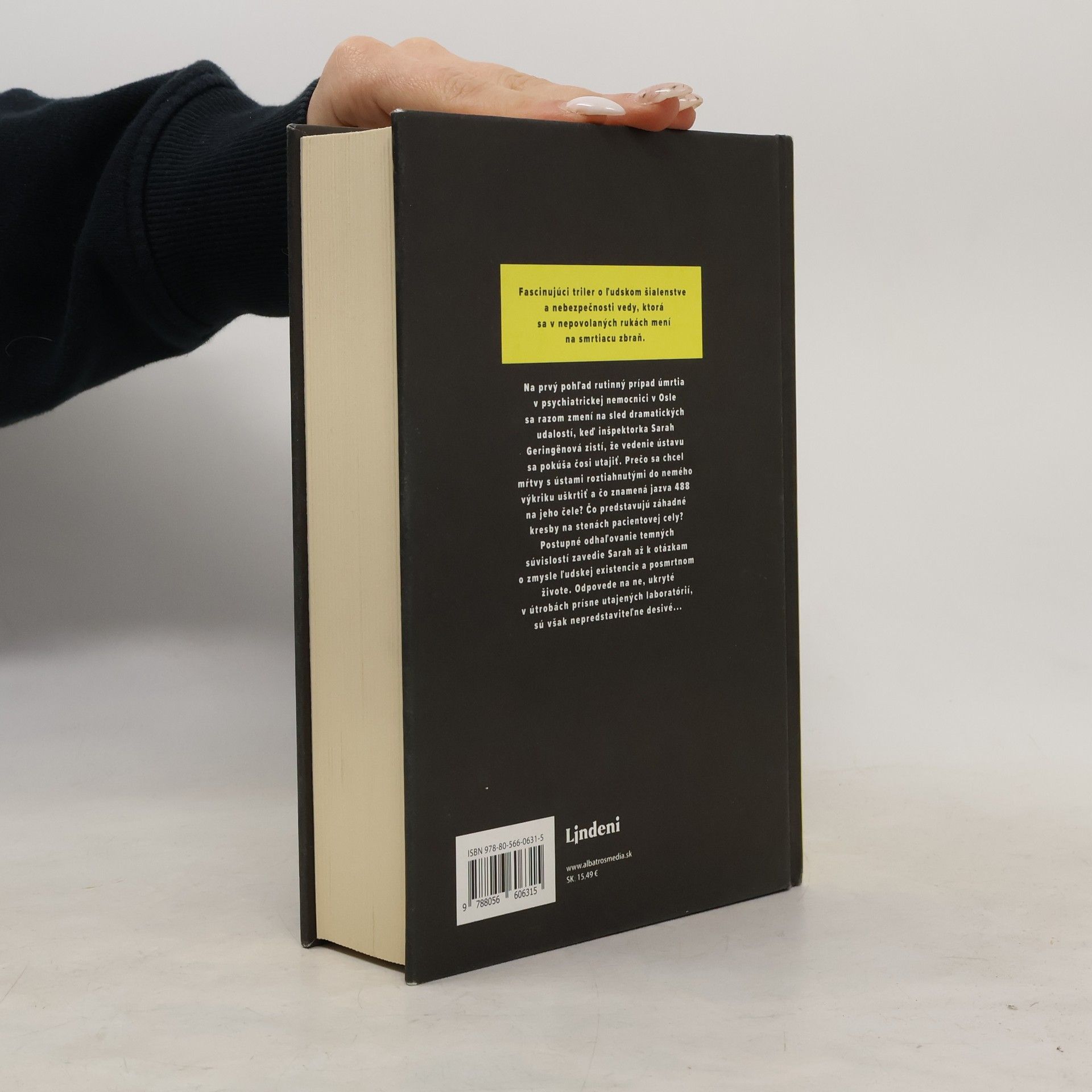 Fascinujúci triler o ľudskom šialenstve a nebezpečnosti vedy, ktorá sa v nepovolaných rukách mení na smrtiacu zbraň Na prvý pohľad rutinný prípad úmrtia v psychiatrickej nemocnici v Osle sa razom zmení na sled dramatických udalostí, keď inšpektorka Sarah Geringënová zistí, že vedenie ústavu sa pokúša čosi utajiť. Prečo sa chcel mŕtvy s ústami roztiahnutými do nemého výkriku uškrtiť a čo znamená jazva 488 na jeho čele? Čo predstavujú záhadné kresby na stenách pacientovej cely? Postupné odhaľovanie temných súvislostí zavedie Sarah až k otázkam o zmysle ľudskej existencie a posmrtnom živote. Odpovede na ne, ukryté v útrobách prísne utajených laboratórií, sú však nepredstaviteľne desivé. ..