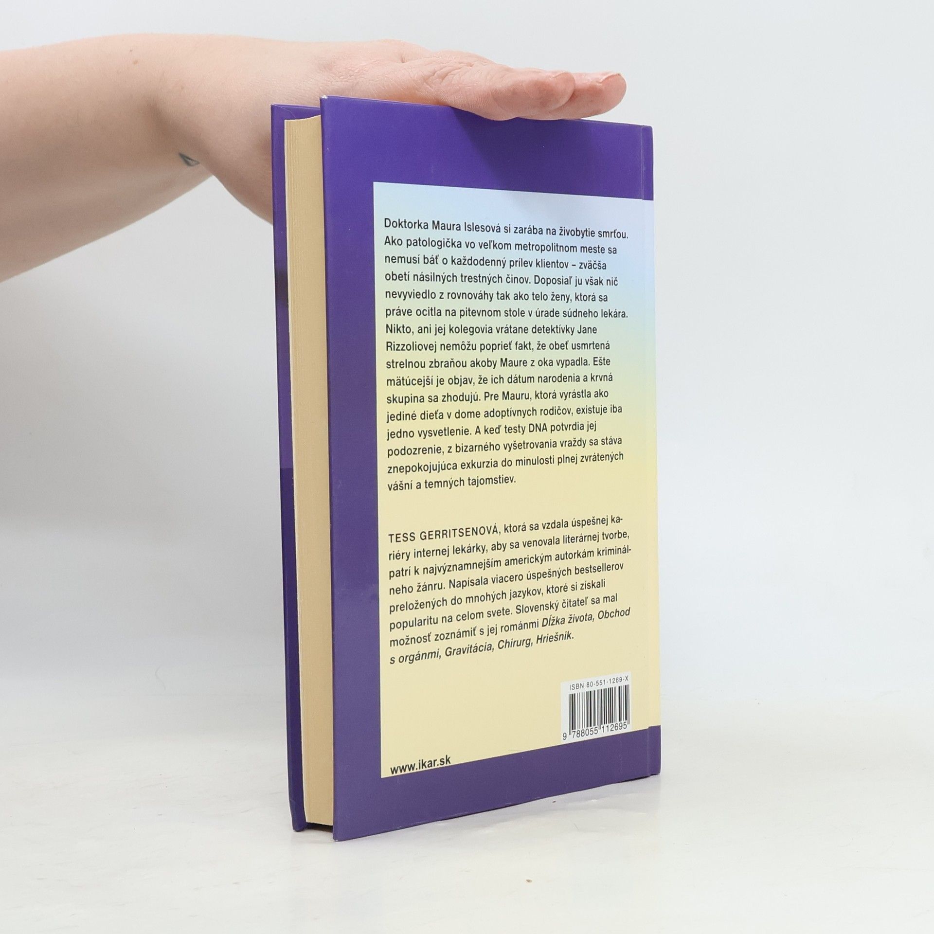 Doktorka Maura Islesová si zarába na živobytie smrťou. Ako patologička vo veľkom metropolitnom meste sa nemusí báť o každodenný prílev klientov – zväčša obetí násilných trestných činov. Nikdy doposiaľ ju však nič nevyviedlo z rovnováhy tak ako telo ženy, ktorá sa práve ocitla na pitevnom stole v úrade súdneho lekára. Nikto, ani jej kolegovia vrátane detektívky Jane Rizzoliovej nemôžu poprieť fakt, že obeť usmrtená strelnou zbraňou akoby Maure z oka vypadla. Ešte mätúcejší je objav, že ich dátum narodenia a krvná skupina sa zhodujú. Pre Mauru, ktorá vyrástla ako jediné dieťa v dome adoptívnych rodičov, existuje iba jedno vysvetlenie. A keď testy DNA potvrdia jej podozrenie, z bizarného vyšetrovania vraždy sa stáva znepokojujúca exkurzia do minulosti plnej zvrátených vášní a temných tajomstiev. Najznepokojujúcejšia je však obava, že človek, ktorý Maure zrejme daroval život, môže jej ho aj vziať.