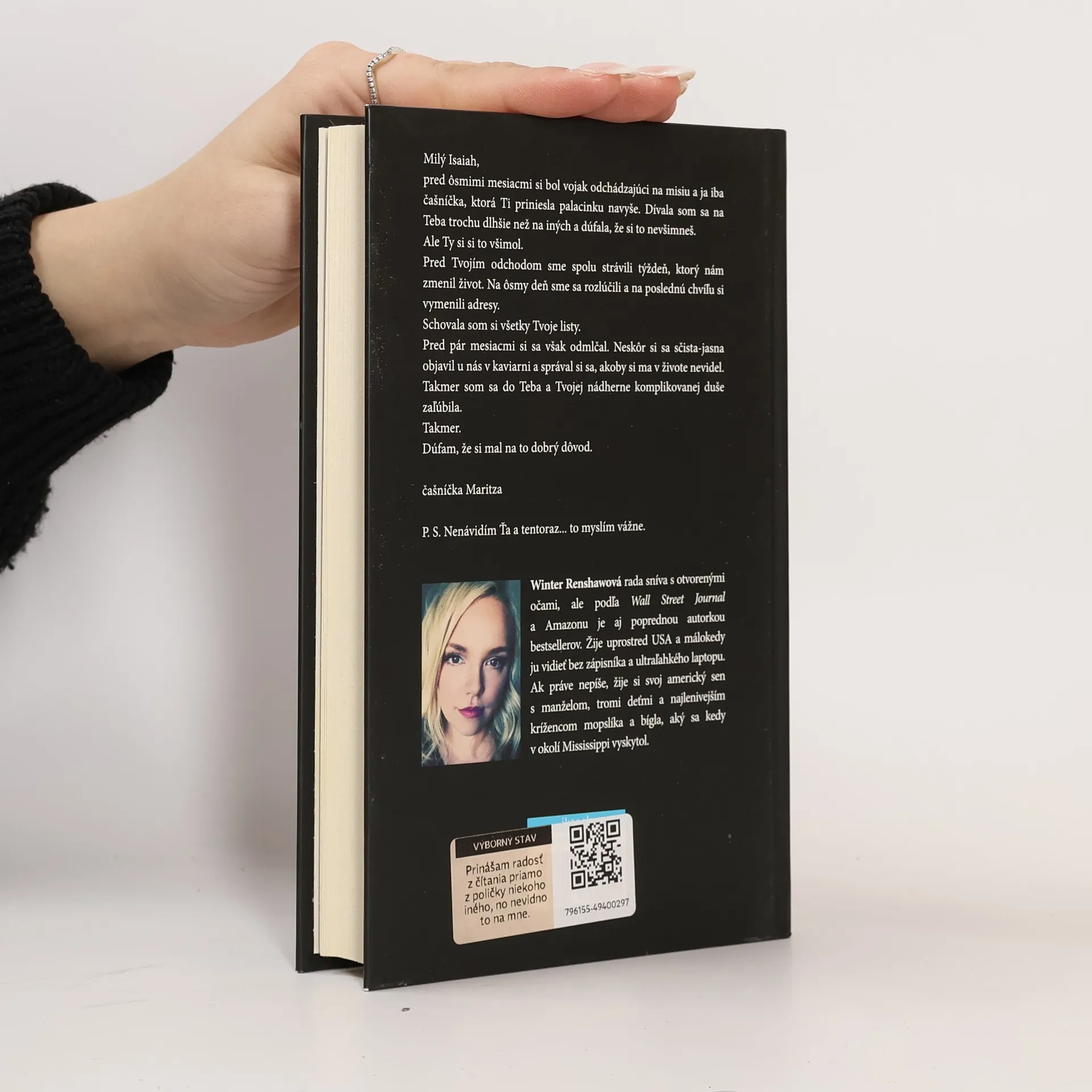 Milý Isaiah, pred ôsmimi mesiacmi si bol vojak odchádzajúci na misiu a ja iba čašníčka, ktorá Ti priniesla palacinku navyše. Dívala som sa na Teba trochu dlhšie než na iných a dúfala, že si to nevšimneš. Ale Ty si si to všimol. Pred Tvojím odchodom sme spolu strávili týždeň, ktorý nám zmenil život. Na ôsmy deň sme sa rozlúčili a na poslednú chvíľu si vymenili adresy. Schovala som si všetky Tvoje listy. Pred pár mesiacmi si sa však odmlčal. Neskôr si sa sčista-jasna objavil u nás v kaviarni a správal si sa, akoby si ma v živote nevidel. Takmer som sa do Teba a Tvojej nádherne komplikovanej duše zaľúbila. Takmer. Dúfam, že si mal na to dobrý dôvod. čašníčka Maritza P.S. Nenávidím Ťa a tentoraz... to myslím vážne.