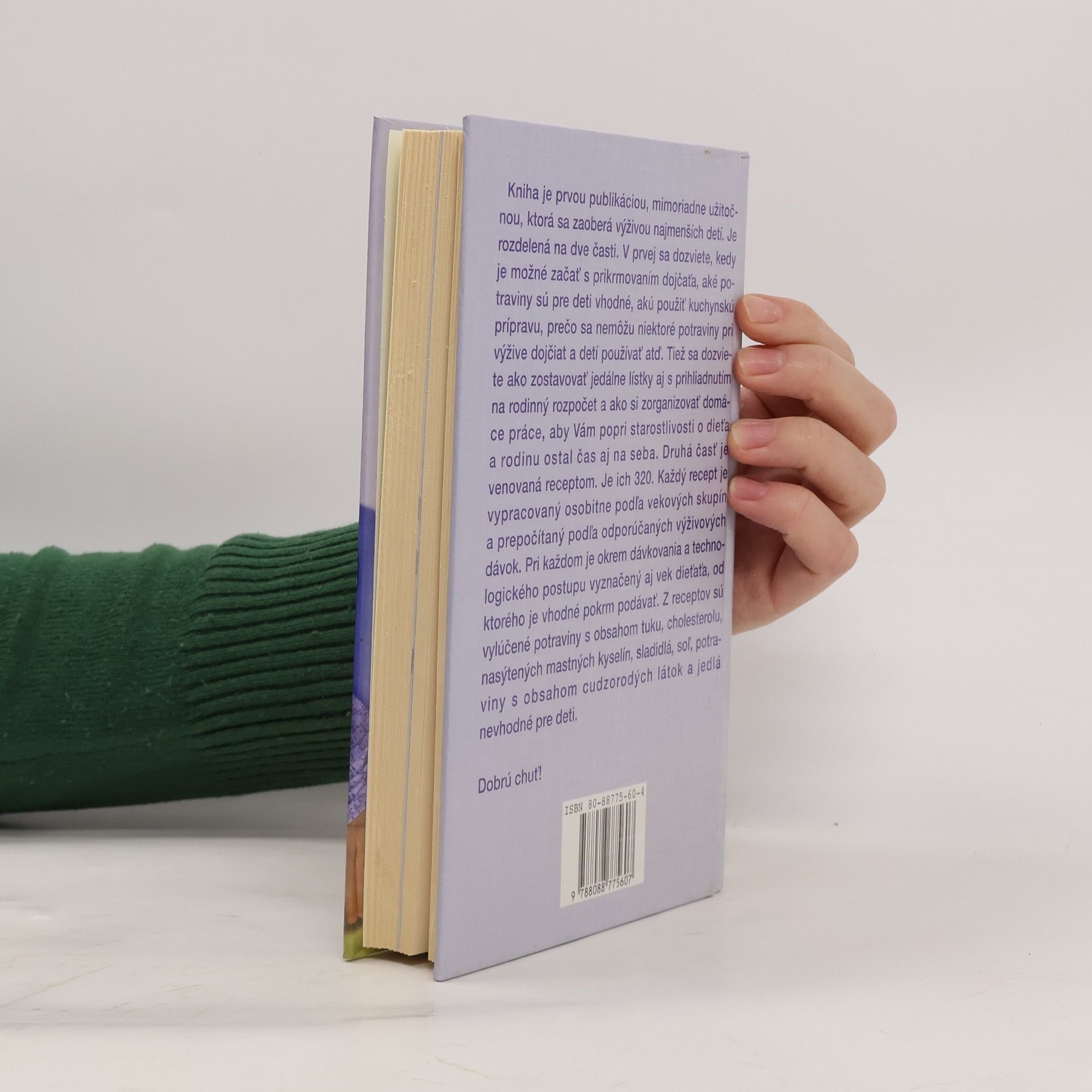 Pomôcka pre mladé mamičky, ktoré v knihe nájdu okrem receptúr aj konkrétne praktické rady, ako svoje dieťa stravovať čo najzdravšie. Kniha je prvou publikáciou, mimoriadne užitočnou, ktorá sa zaoberá výživou najmenších detí. Je rozdelená na dve časti. V prvej sa dozviete, kedy je možné začať s prikrmovaním dojčaťa, aké potraviny sú pre deti vhodné, akú použiť kuchynskú prípravu, prečo sa nemôžu niektoré potraviny pri výžive dojčiat a detí používať atď. Tiež sa dozviete ako zostavovať jedálne lístky aj s prihliadnutím na rodinný rozpočet a ako si zorganizovať domáce práce. Druhá časť je venovaná receptom. Je ich 320. Každý recept je vypracovaný osobitne podľa vekový skupín a prepočítaný podľa odporúčaných výživových dávok. Pri každom je okrem dávkovania a technologického postupu vyznačený aj vek dieťaťa, od ktorého je vhodné pokrm podávať. Z receptov sú vylúčené potraviny s obsahom tuku, cholesterolu, nasýtených mastných kyselín, sladidlá, soľ, potraviny s obsahom cudzorodých látok a jedlá nevhodné pre deti. Piate vydanie.
