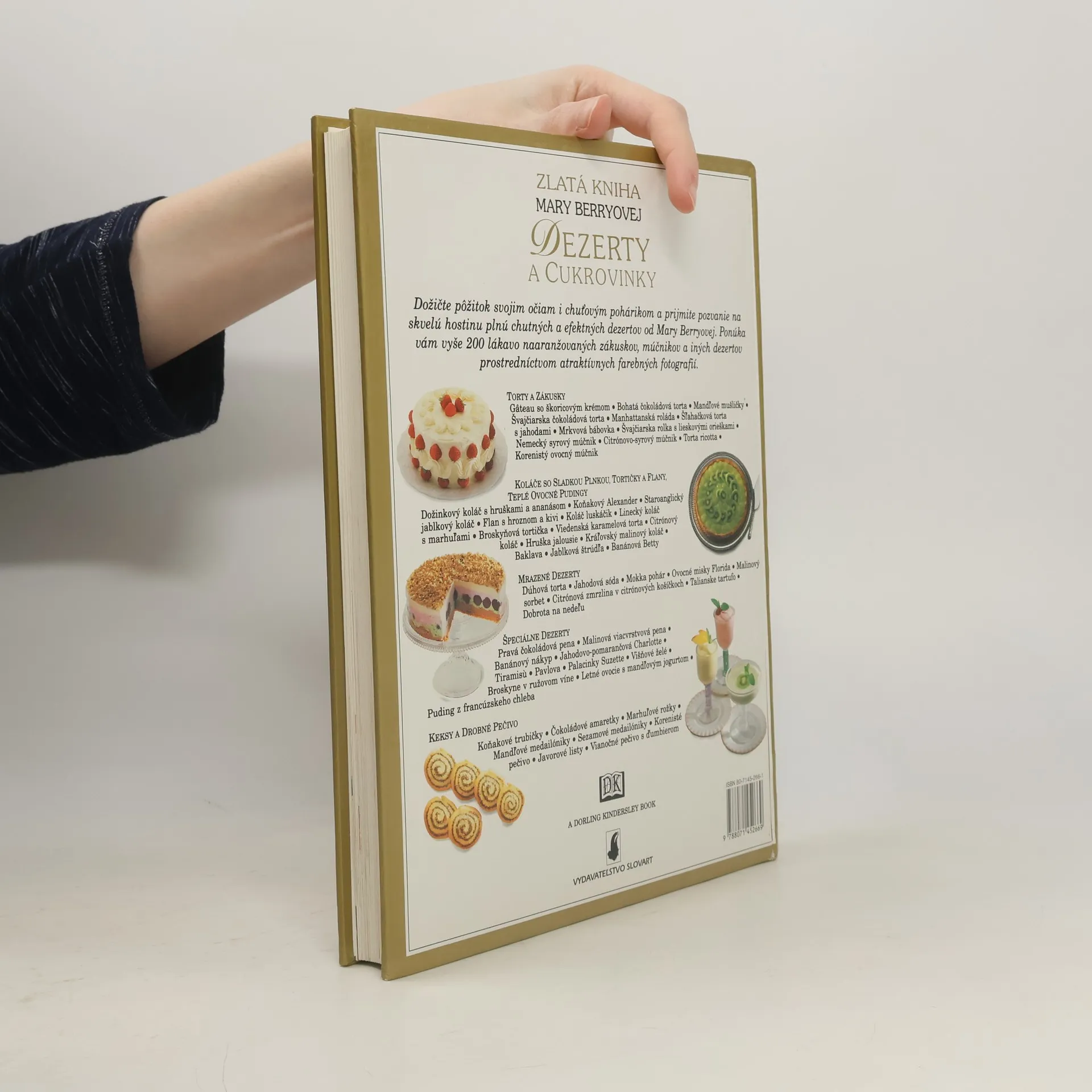 Vyše 200 názorných receptov na každú príležitosť v kapitolách: Špeciálne dezerty, Zákusky, Koláče plnené ovocím, Múčniky z krehkého cesta, Múčniky z maslového cesta a ovocné pudingy, Keksy a drobné pečivo, Mrazené dezerty, Užitočné informácie a základné recepty. Tretie slovenské vydanie.