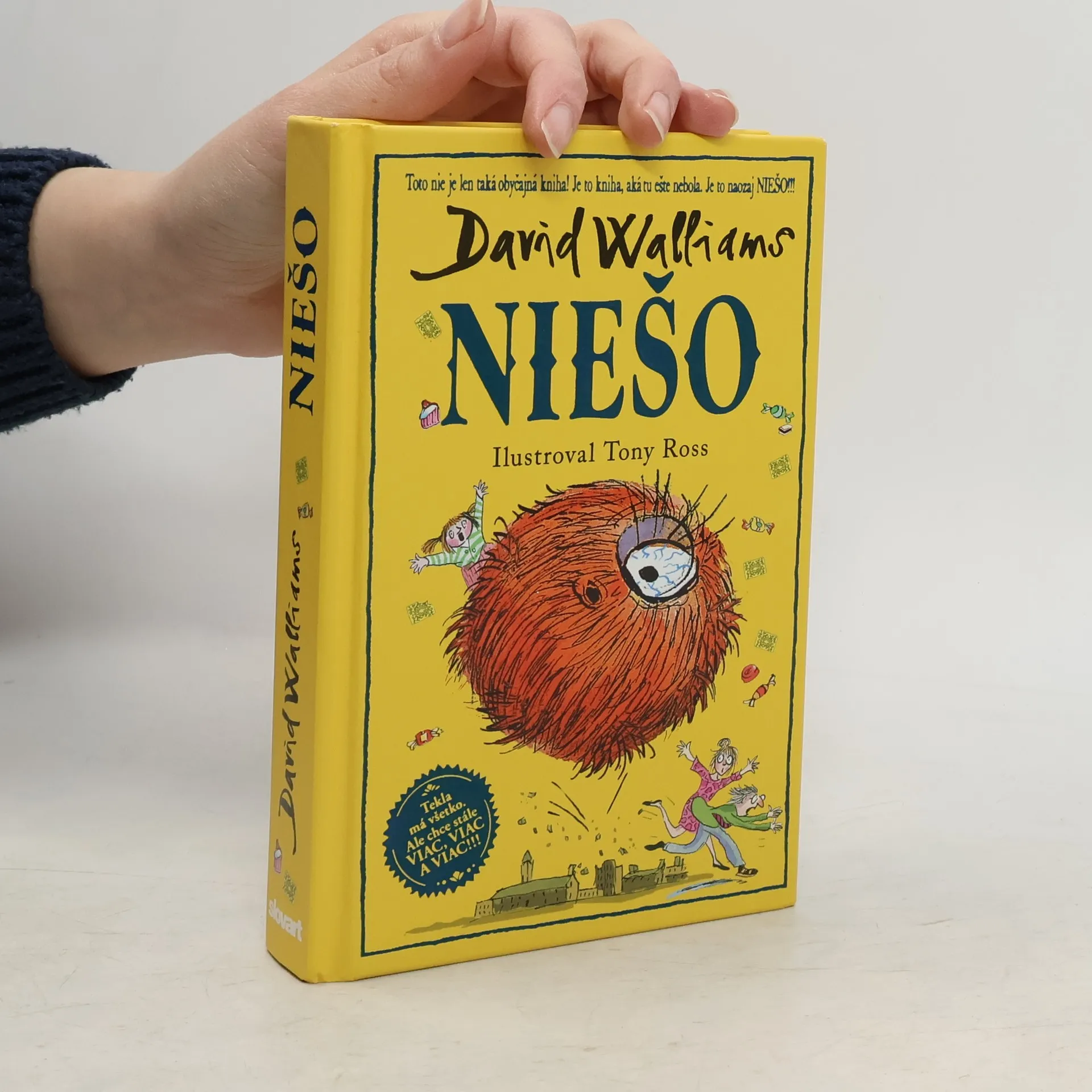 Svetoznámy britský komik a autor detských bestsellerov David Walliams už napísal množstvo skvelých kníh o neposlušných, zlostných, papuľnatých, drzých, nadutých a rozmaznaných deťoch, dokonca aj o tých, čo sú fakt najhoršie na svete. Ale toto tu ešte nebolo! Vymyslel príbeh decka, ktoré má absolútne všetko. Všetko, na čo len pomyslí, mu okamžite zabezpečia jeho láskaví a dobroprajní rodičia. No ono aj tak chce viac. Viac a viac, a viac! Skrátka – strašne chce, ale fakt strašne chce ešte NIEŠO! Rodičia sú zúfalí. Čo je to NIEŠO? Pátranie ich zavedie do tajných trezorov knižnice, kde nájdu Netvoropédiu, i do tých najodľahlejších končín džungle. A čo nájdu? Všetko možné. Tak to poďte hľadať s nimi. Len pozor, aby ste pritom neexplodovali od smiechu!