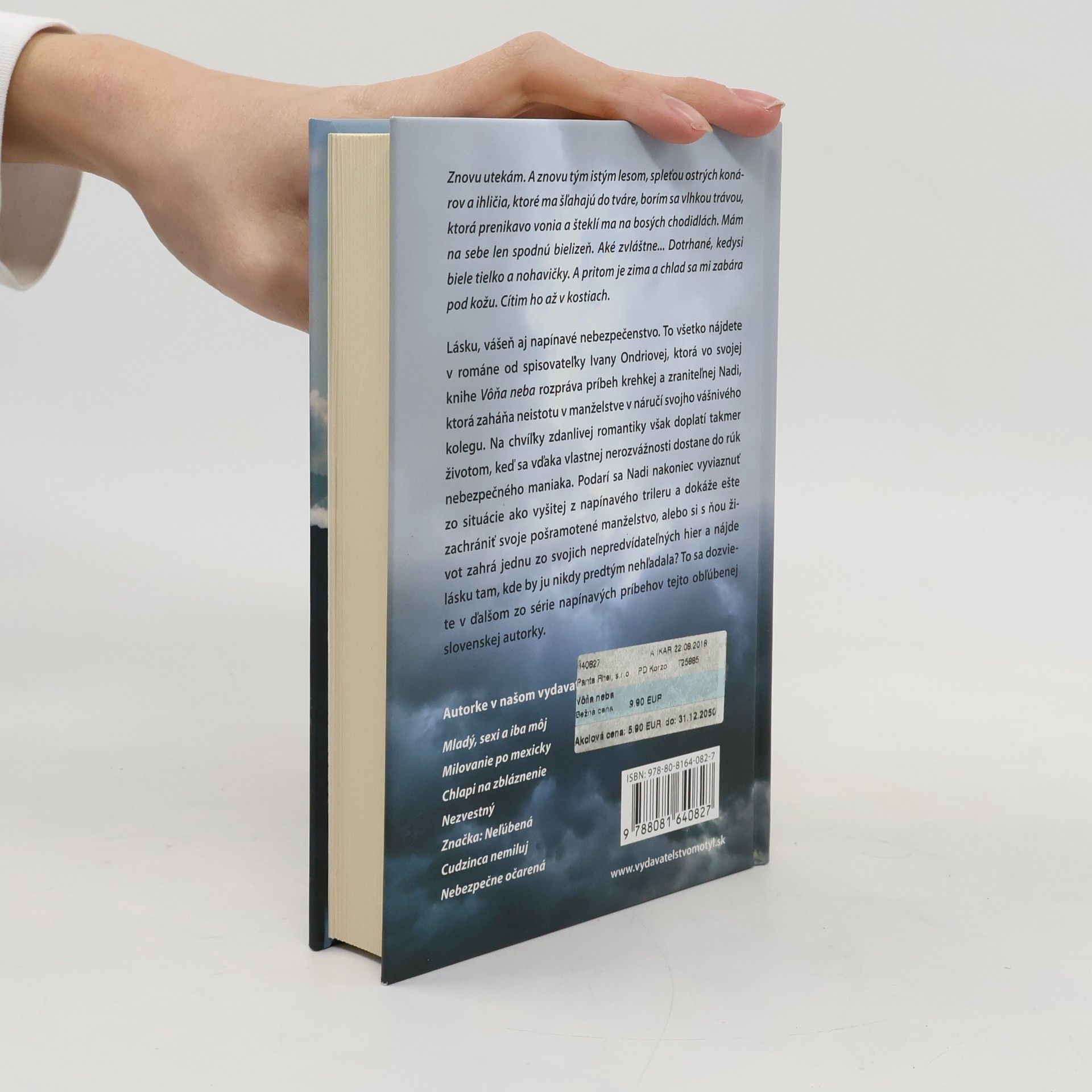 Lásku, vášeň aj napínavé nebezpečenstvo. To všetko nájdete v románe od spisovateľky Ivany Ondriovej, ktorá vo svojej knihe Vôňa neba rozpráva príbeh krehkej a zraniteľnej Nadi, ktorá zaháňa neistotu v manželstve v náručí svojho vášnivého kolegu. Na chvíľky zdanlivej romantiky však doplatí takmer životom, keď sa vďaka vlastnej nerozvážnosti dostane do rúk nebezpečného maniaka. Podarí sa Nadi nakoniec vyviaznuť zo situácie ako vyšitej z napínavého trileru a dokáže ešte zachrániť svoje pošramotené manželstvo, alebo si s ňou život zahrá jednu zo svojich nepredvídateľných hier a nájde lásku tam, kde by ju nikdy predtým nehľadala? To sa dozviete v ďalšom zo série napínavých príbehov tejto obľúbenej slovenskej autorky.