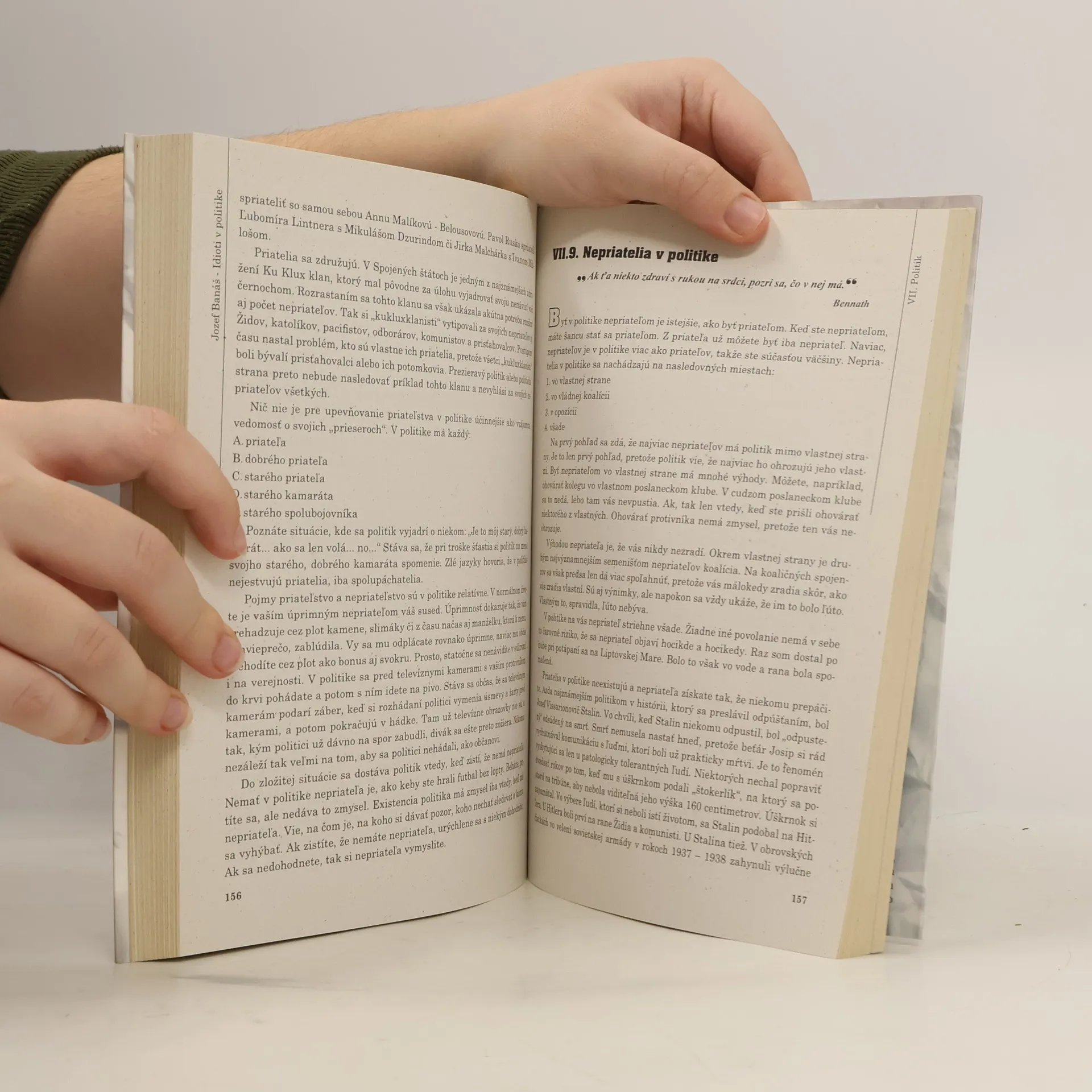 Zásadový politik je taký, ktorý keď sa rozhodne prestupovať zo strany do strany už s tým neprestane, keď začne intrigovať, klamať a neplniť sľuby, bude v tom pokračovať, keď vezme úplatok, nesmie s tým prestať. Zásadový politik keď berie, tak berie. Ak by s tým skončil, stal by sa nedôveryhodným. Mať v politike názor je cesta do pekla. Najistejší spôsob ako v politike dosiahnuť úspech, je nemať žiadny názor. Ak názor nemáte, neriskujete, že by ste mohli mať názor nesprávny. Nesprávny názor je každý, ktorý sa líši od názoru predsedovho. Nenadávajte na Dzurindu, Mečiara či Fica, že to zavinili oni. Mohli ste si zvoliť iného. Napríklad mňa. Jozef Banáš