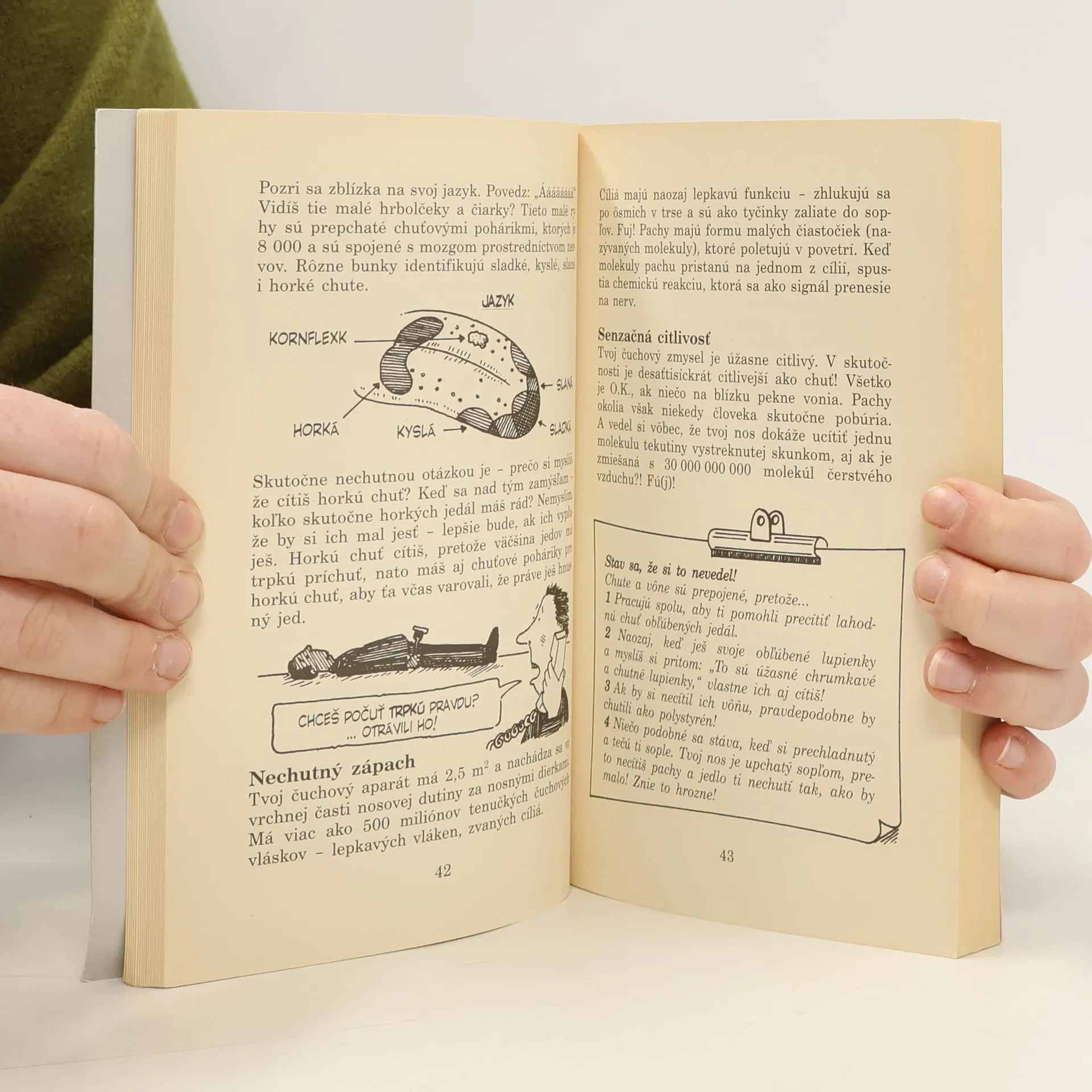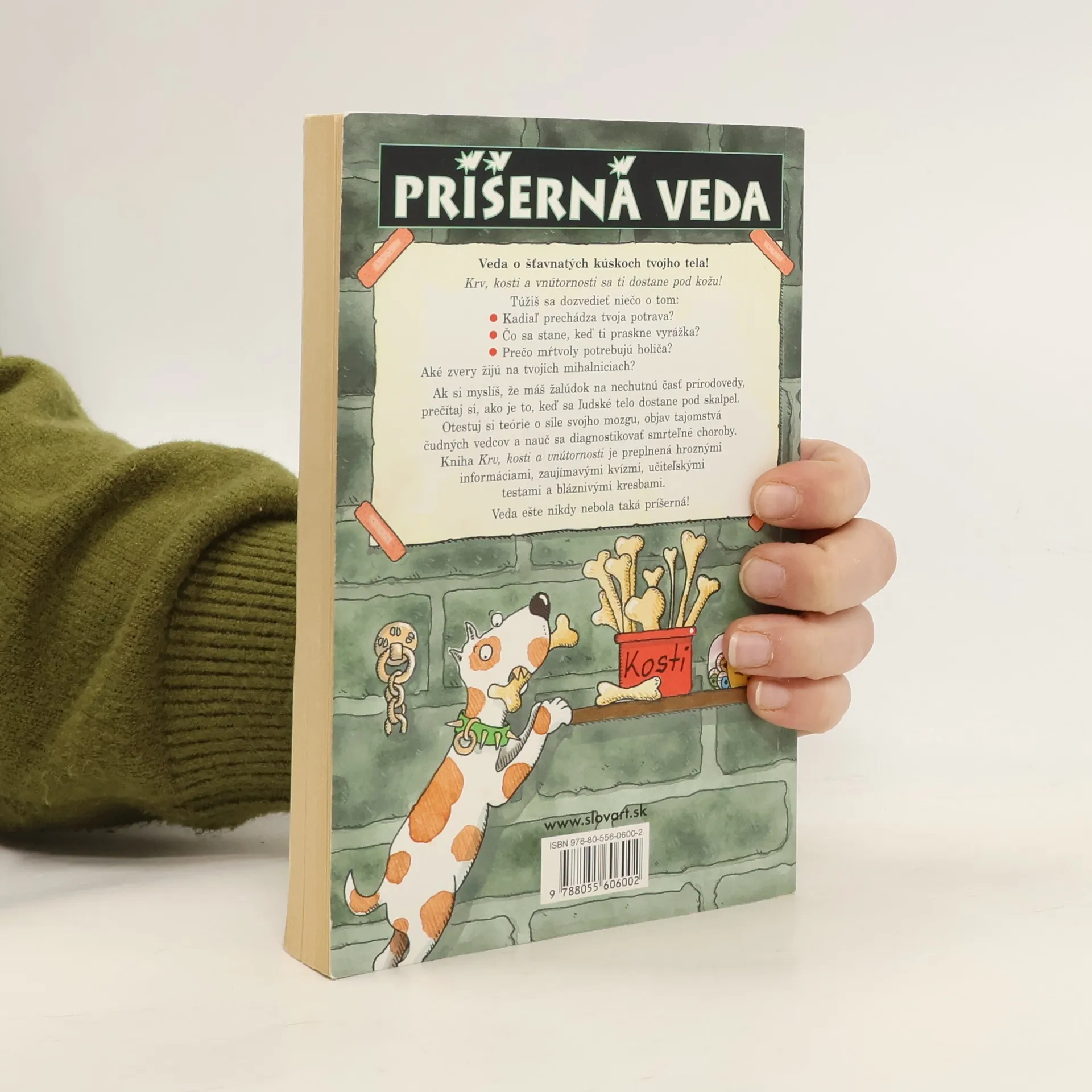 Kniha s podtitulom Veda o šťavnatých kúskoch tvojho tela ťa prevedie po miestach, cez ktoré prechádza tvoja potrava, dozvieš sa prečo mŕtvoly potrebujú holiča a aké zvery žijú na tvojich mihalniciach… Otestuješ si teórie o sile svojho mozgu, objavíš tajomstvá čudných vedcov a naučíš sa diagnostikovať smrteľné choroby. Kniha je preplnená hroznými informáciami, zaujímavými kvízmi, učiteľskými testami a bláznivými kresbami.
