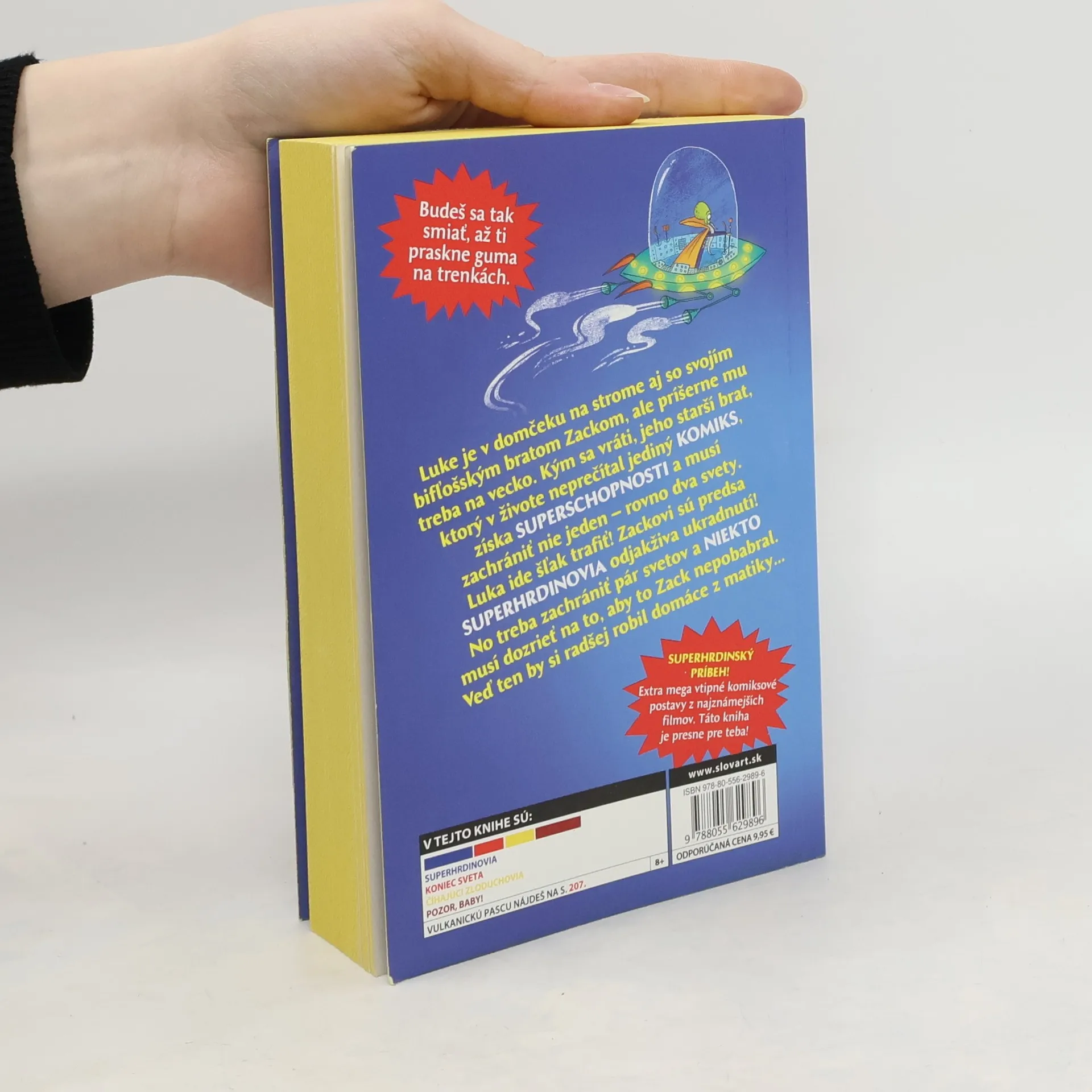 Ak miluješ superhrdinov tak ako Luke, pri čítaní tejto knihy nebudeš veriť tomu, ako s ním vesmír vybabral. Luke bol jedného večera v domčeku na strome spolu so starším bratom Zackom, no musel si odskočiť. Keď sa vrátil, jeho brat, ktorý v živote neprečítal jediný komiks, mal zrazu superschopnosti a poslanie zachrániť nie jeden, ale rovno dva svety! Luka to poriadne ROZČÚLILO! Veď Zack vôbec NEMÁ RÁD komiksy! No pár svetov je v ohrození a NIEKTO musí dozrieť na to, aby to Zack nepobabral. Najmä keď ani nechce nosiť plášť, ako sa na správneho superhrdinu patrí!