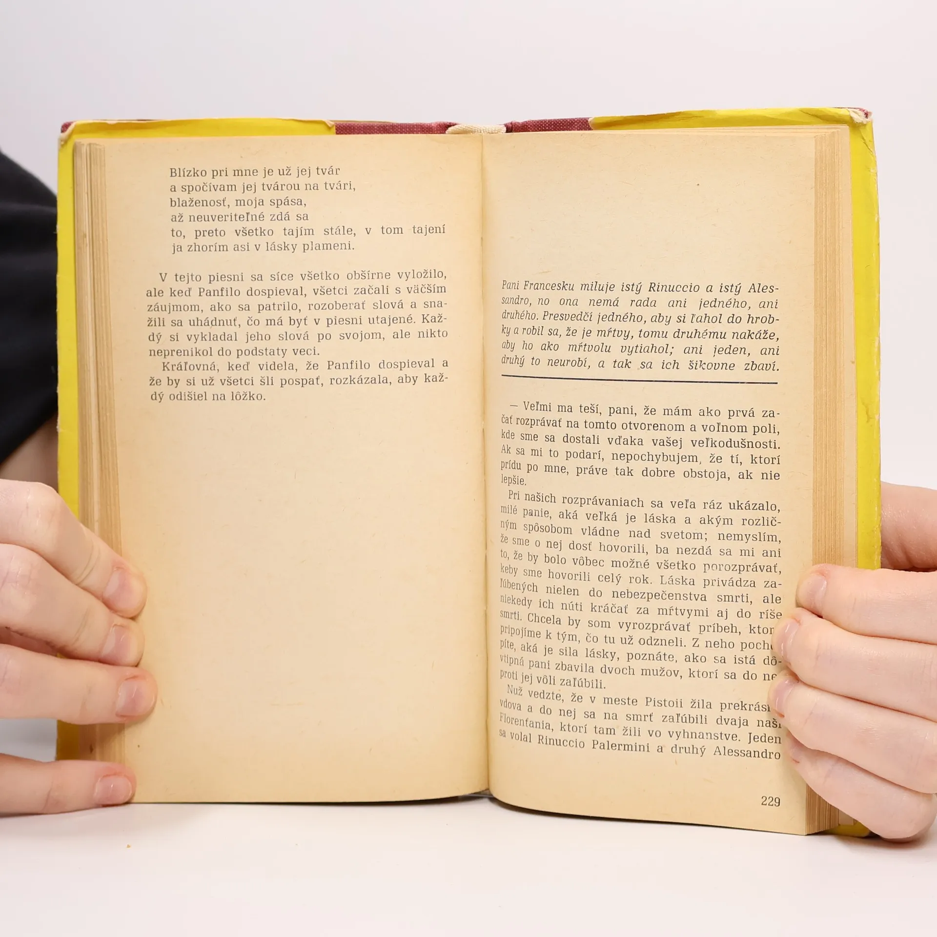 Vrcholné dielo talianskej novelistickej tvorby. V novelách autor prináša nezvyčajné príbehy a kresby charakterov. Mnohé z príbehov Dekameronu sa neskôr stali podkladom pre ďalšie spracovanie. Vyšlo v edícii Čítanie študujúcej mládeže. Preklad, doslov a poznámky: Mikuláš Pažitka. Veršeprebásnil Ivan Štrpka.