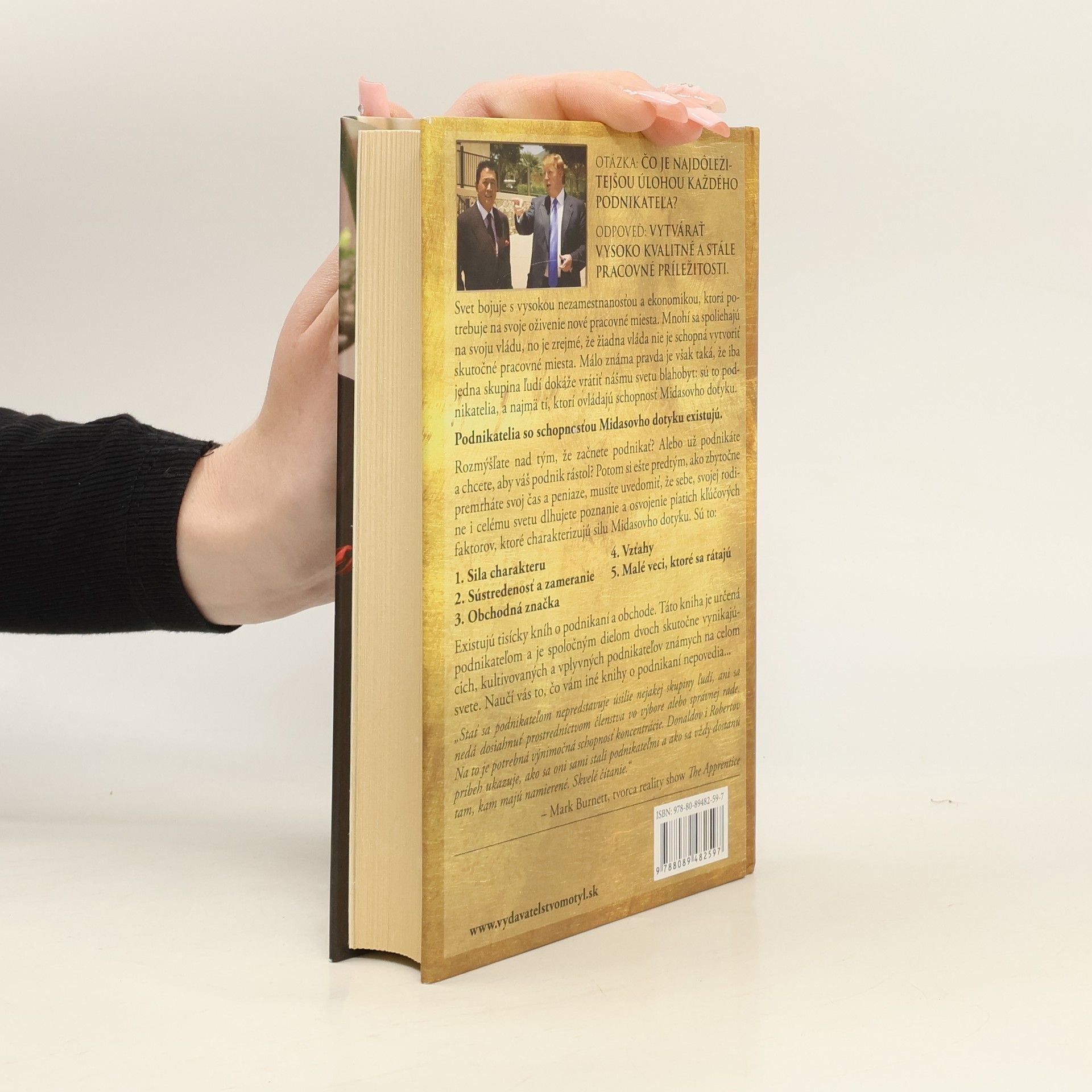 Svet bojuje s vysokou nezamestnanosťou a ekonomikou, ktorá potrebuje na svoje oživenie nové pracovné miesta. Mnohí sa spoliehajú na svoju vládu, no je zrejmé, že žiadna vláda nie je schopná vytvoriť skutočné pracovné miesta. Málo známa pravda je však taká, že iba jedna skupina ľudí dokáže vrátiť nášmu svetu blahobyt: sú to podnikatelia, a najmä tí, ktorí ovládajú schopnosť Midasovho dotyku. Podnikatelia so schopnosťou Midasovho dotyku existujú. Rozmýšľate nad tým, že začnete podnikať? Alebo už podnikáte a chcete, aby váš podnik rástol? Potom si ešte predtým, ako zbytočne premrháte svoj čas a peniaze, musíte uvedomiť, že sebe, svojej rodine i celému svetu dlhujete poznanie a osvojenie piatich kľúčových faktorov, ktoré charakterizujú silu Midasovho dotyku. Sú to: Sila charakteru Sústredenosť a zameranie Obchodná značka Vzťahy Malé veci, ktoré sa rátajú Existujú tisícky kníh o podnikaní a obchode. Táto kniha je určená podnikateľom a je spoločným dielom dvoch skutočne vynikajúcich, kultivovaných a vplyvných podnikateľov známych na celom svete. Naučí vás to, čo vám iné knihy o podnikaní nepovedia...