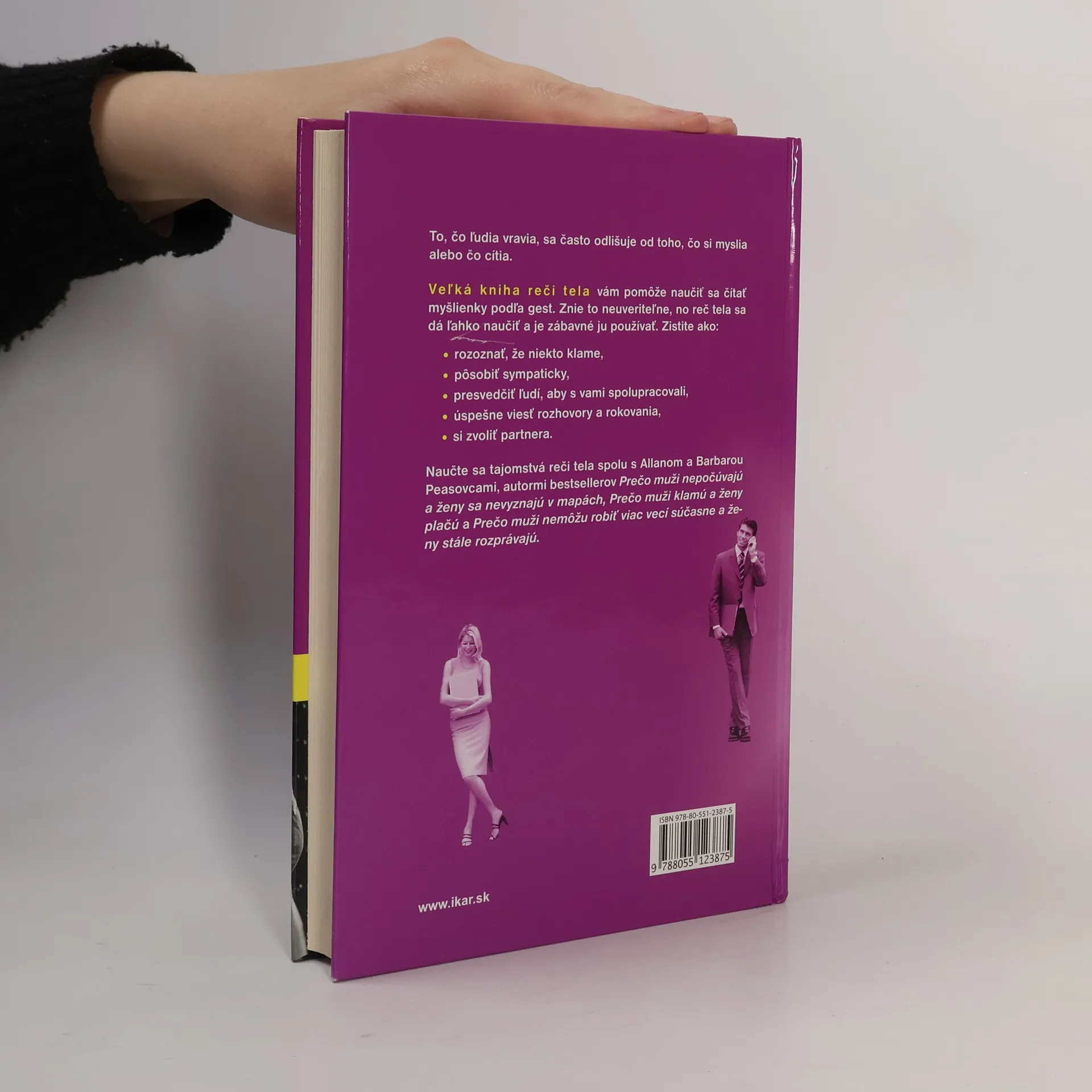 Veľká kniha reči tela vám pomôže naučiť sa čítať myšlienky iných podľa ich gest. Znie to neuveriteľne, no reč tela sa dá ľahko naučiť a je zábavné ju používať. Zistite ako: -rozoznať, že niekto klame, -pôsobiť sympaticky, -presvedčiť ľudí, aby s vami spolupracovali, -úspešne viesť rozhovory a rokovania, -si zvoliť partnera. Naučte sa tajomstvá reči tela spolu s Allanom a Barbarou Peasovcami, autormi bestsellerov Prečo muži nepočúvajú a ženy sa nevyznajú v mapách, Prečo muži klamú a ženy plačú a Prečo muži nemôžu robiť viac vecí súčasne a ženy stále rozprávajú.