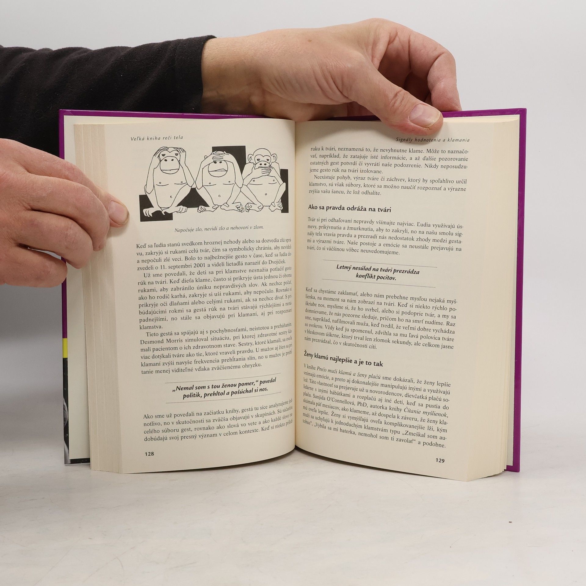 Veľká kniha reči tela vám pomôže naučiť sa čítať myšlienky iných podľa ich gest. Znie to neuveriteľne, no reč tela sa dá ľahko naučiť a je zábavné ju používať. Zistite ako: -rozoznať, že niekto klame, -pôsobiť sympaticky, -presvedčiť ľudí, aby s vami spolupracovali, -úspešne viesť rozhovory a rokovania, -si zvoliť partnera. Naučte sa tajomstvá reči tela spolu s Allanom a Barbarou Peasovcami, autormi bestsellerov Prečo muži nepočúvajú a ženy sa nevyznajú v mapách, Prečo muži klamú a ženy plačú a Prečo muži nemôžu robiť viac vecí súčasne a ženy stále rozprávajú.