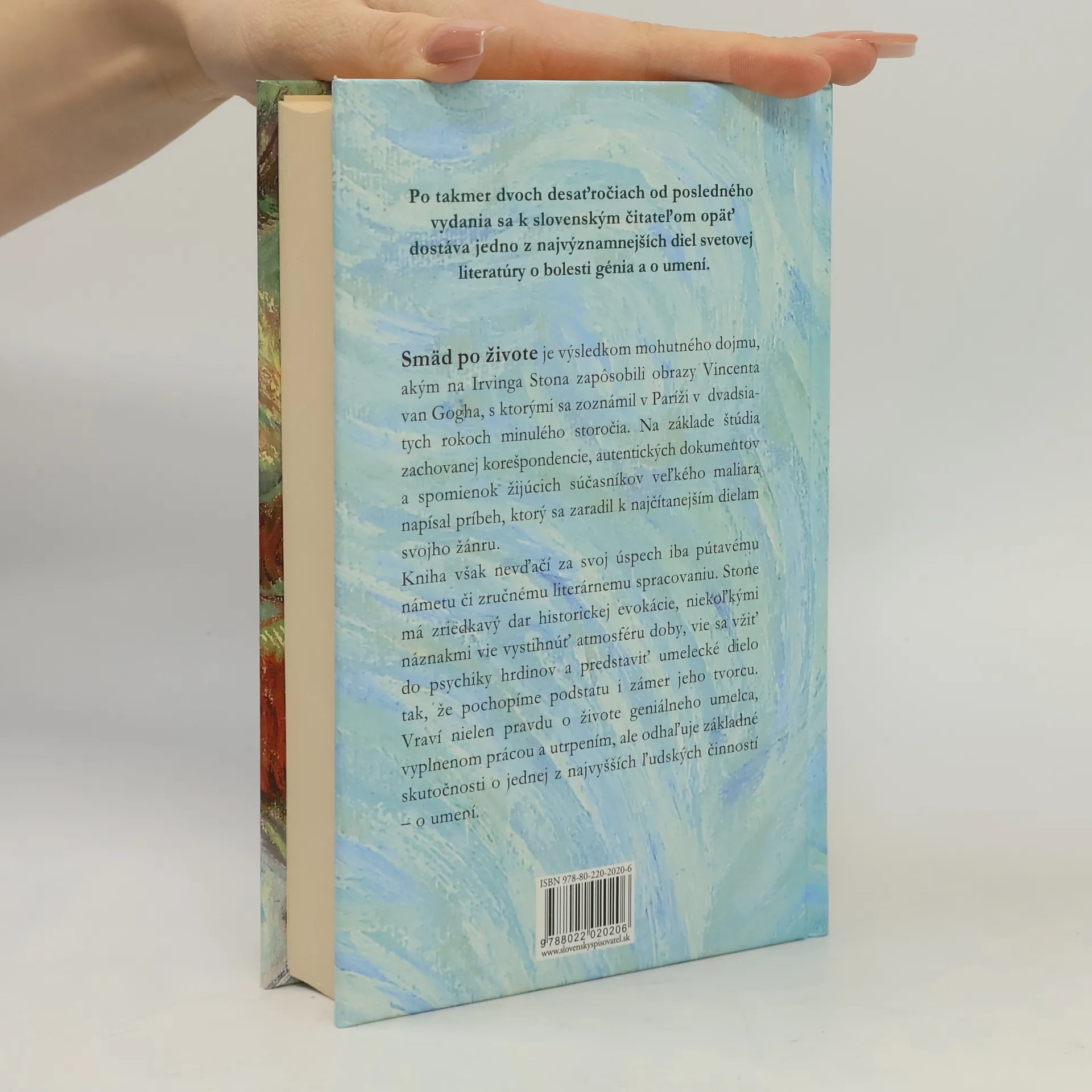 Jedno z najvýznamnejších diel svetovej literatúry vychádza v novom vydaní takmer po dvoch desaťročiach. Je výsledkom mohutného dojmu, akým na Irvinga Stona zapôsobili obrazy Vincenta van Gogha, s ktorým sa zoznámil v Paríži v 20. rokoch minulého storočia. Na základe štúdia zachovanej korešpondencie, autentických dokumentov a spomienok žijúcich súčasníkov veľkého maliara napísal príbeh, ktorý sa zaradil k najčítanejším dielam svojho žánru. Smäd po živote vraví nielen pravdu o živote geniálneho umelca, vyplnenom prácou a utrpením, ale zároveň odhaľuje základné skutočnosti o jednej z najvyšších ľudských činností – o umení.
