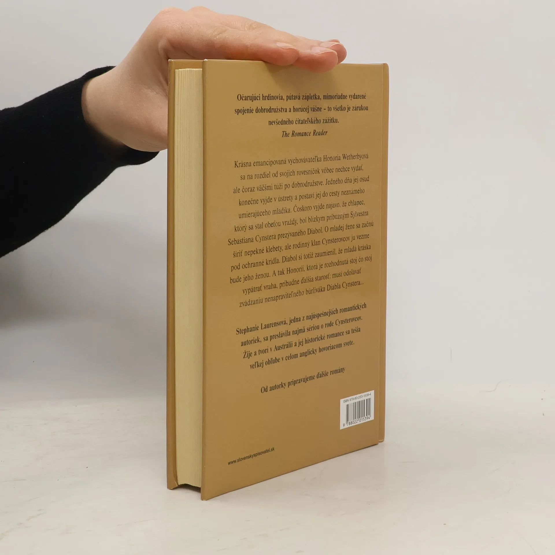 Krásna emancipovaná vychovávateľka Honoria Wetherbyová sa na rozdiel od svojich rovesníčok vôbec nechce vydať, ale čoraz väčšmi túži po dobrodružstve. Jedného dňa jej osud konečne vyjde v ústrety a postaví jej do cesty neznámeho umierajúceho mladíka. Čoskoro vyjde najavo, že chlapec, ktorý sa stal obeťou vraždy, bol blízkym príbuzným Sylvestra Sebastiana Cynstera prezývaného Diabol. O mladej žene sa začnú šíriť nepekné klebety, ale rodinný klan Cynsterovcov ju vezme pod ochranné krídla. Diabol si totiž zaumienil, že mladá kráska bude jeho ženou. A tak Honorii, ktorá je rozhodnutá stoj čo stoj vypátrať vraha, pribudne ďalšia starosť: musí odolávať zvádzaniu nenapraviteľného búrliváka Diabla Cynstera... Stephanie Laurensová, jedna z najúspešnejších romantických autoriek, sa preslávila najmä sériou o rode Cynsterovcov. Žije a tvorí v Austrálii a jej historické romance sa tešia veľkej obľube v celom anglicky hovoriacom svete.