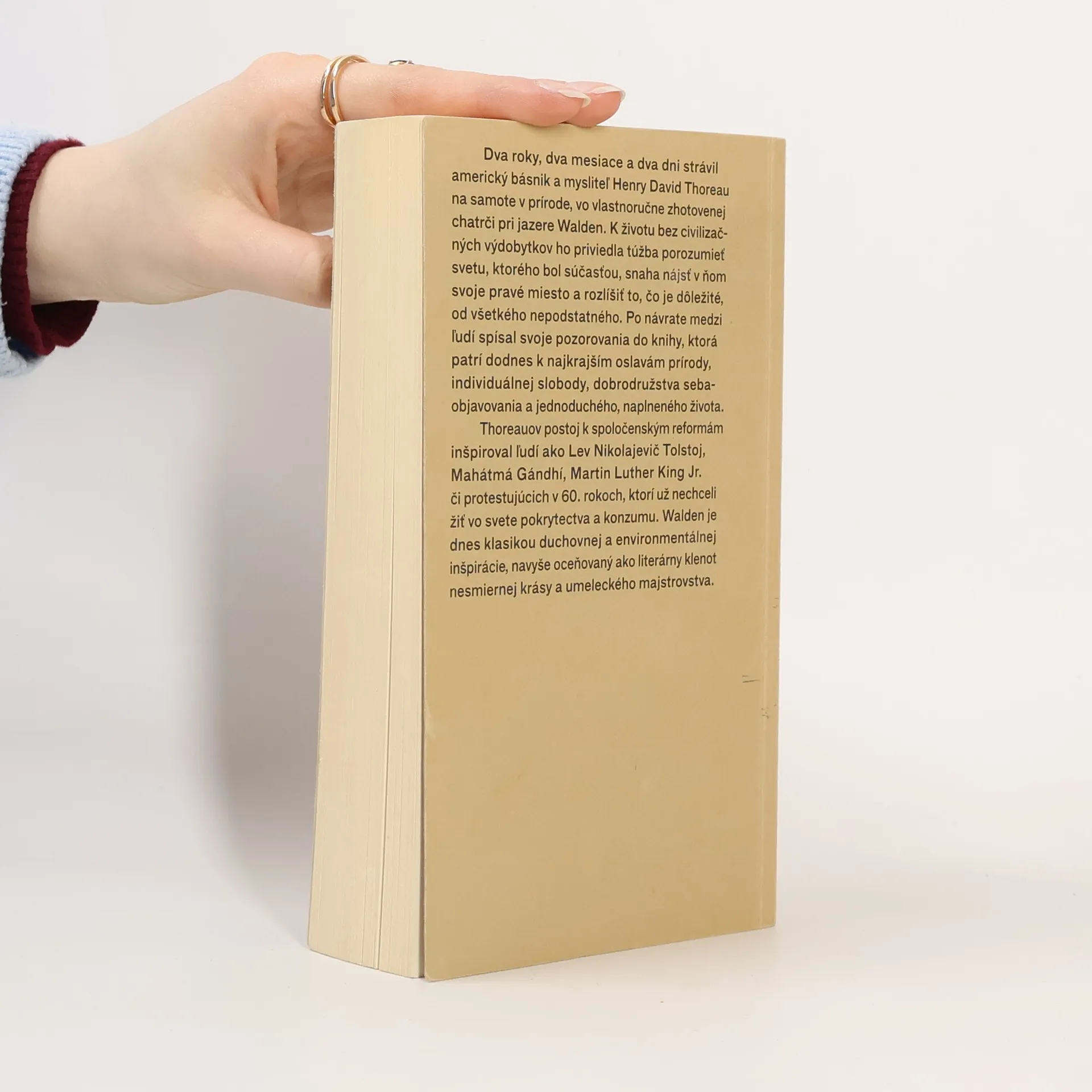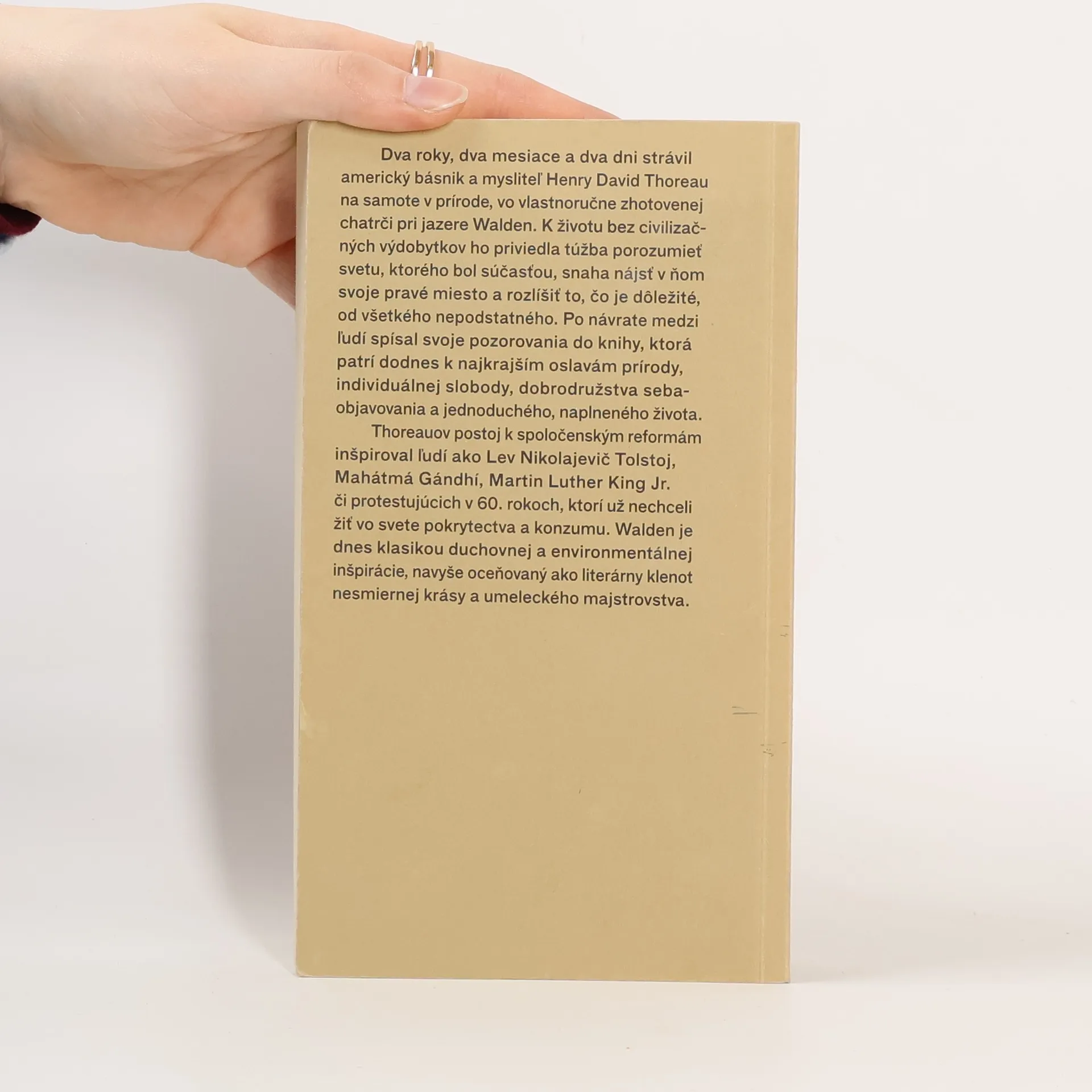 Dva roky, dva mesiace a dva dni strávil americký básnik a mysliteľ H. D. Thoreau na samote v prírode, vo vlastnoručne zhotovenej chatrči pri jazere Walden Pond. K životu bez civilizačných výdobytkov ho priviedla túžba porozumieť svetu, ktorého bol súčasťou, snaha nájsť v ňom svoje pravé miesto a rozlíšiť to, čo je dôležité od všetkého nepodstatného. Po návrate medzi ľudí spísal svoje pozorovania do knihy, ktorá patrí dodnes k najkrajším oslavám prírody, individuálnej slobody, dobrodružstva sebaobjavovania a jednoduchého, naplneného života. Dvesto rokov od narodenia autora ju v rukách konečne drží aj slovenský čitateľ.