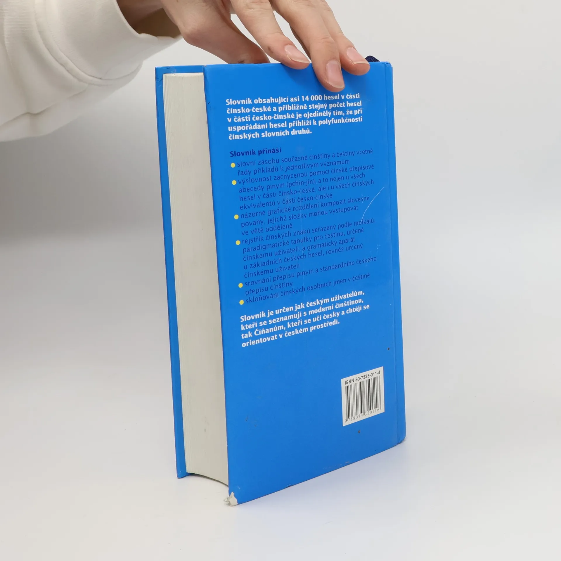 Slovník obsahující asi 14 000 hesel v části čínsko-české a přibližně stejný počet hesel v části česko-čínské je ojedinělý tím, že při uspořádání hesel přihlíží k polyfunkčnosti čínských slovních druhů. Slovník přináší: - slovní zásobu současné čínštiny a češtiny včetně řady příkladů k jednotlivým významům - výslovnost zachycenou pomocí čínské přepisové abecedy pinyin (pchin-jin), a to nejen u všech hesel v části čínsko-české, ale i u všech čínských ekvivalentů v části česko-čínské - názorné grafické rozdělení kompozit slovesné povahy, jejichž složky mohou vystupovat ve větě odděleně - rejstřík čínských znaků seřazený podle radikálů - paradigmatické tabulky pro češtinu, určené čínskému uživateli, a gramatický aparát u základních českých hesel, rovněž určený čínskému uživateli - srovnání přepisu pinyin a standardního českého přepisu čínštiny - skloňování čínských osobních jmen v češtině Slovník je určen jak českým uživatelům, kteří se seznamují s moderní čínštinou, tak čínským uživatelům, kteří se učí česky a chtějí se orientovat v českém prostředí.
