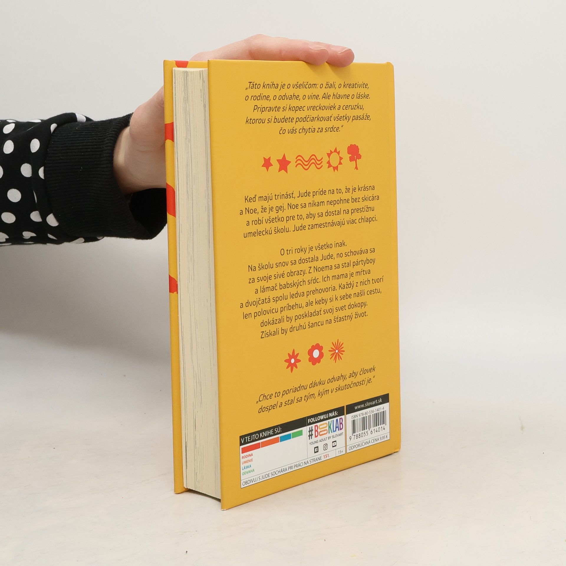 Výnimočný príbeh od autorky románu Nebo na dosah. To pravé pre nedočkavých fanúšikov Johna Greena, Gayle Forman a Rainbow Rowell. Dvojčatá Jude a Noe znamenajú jeden pre druhého všetko. Keď majú trinásť, Jude príde na to, že je krásna a Noe, že je gej. Noe miluje okrem sestry už len kreslenie a robí všetko pre to, aby sa dostal na prestížnu umeleckú školu. Jude zamestnávajú viac chlapci. O tri roky je všetko inak. Na školu snov sa dostala Jude, ale je z nej utiahnutá sivá myška, čo sa skrýva za svoje obrazy. Z Noema sa stal pártyboy a lámač babských sŕdc. A ich mama je mŕtva. Dvojčatá spolu ledva prehovoria a ani jeden vlastne nevie prečo. Neuvedomujú si, že každý z nich tvorí len polovicu príbehu, a keby si k sebe našli cestu, dokázali by poskladať svoj svet dokopy, získali by druhú šancu na šťastný život.