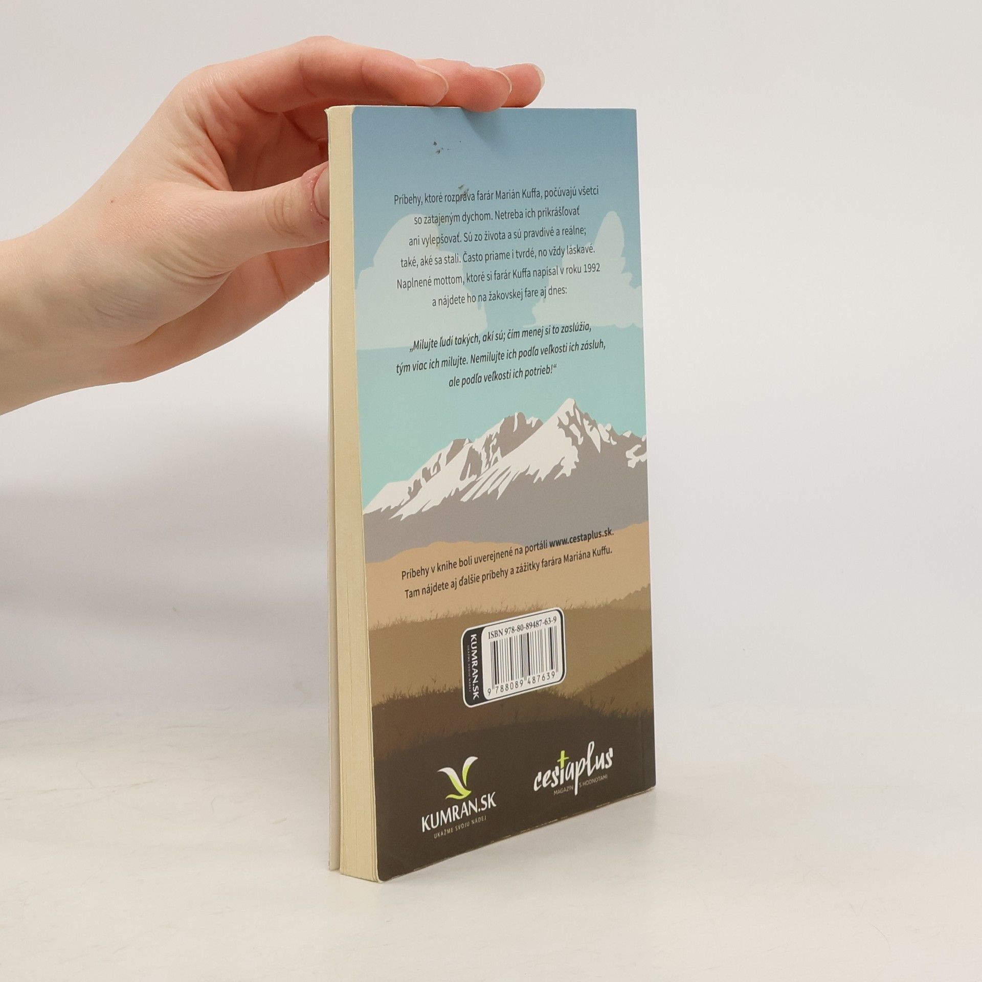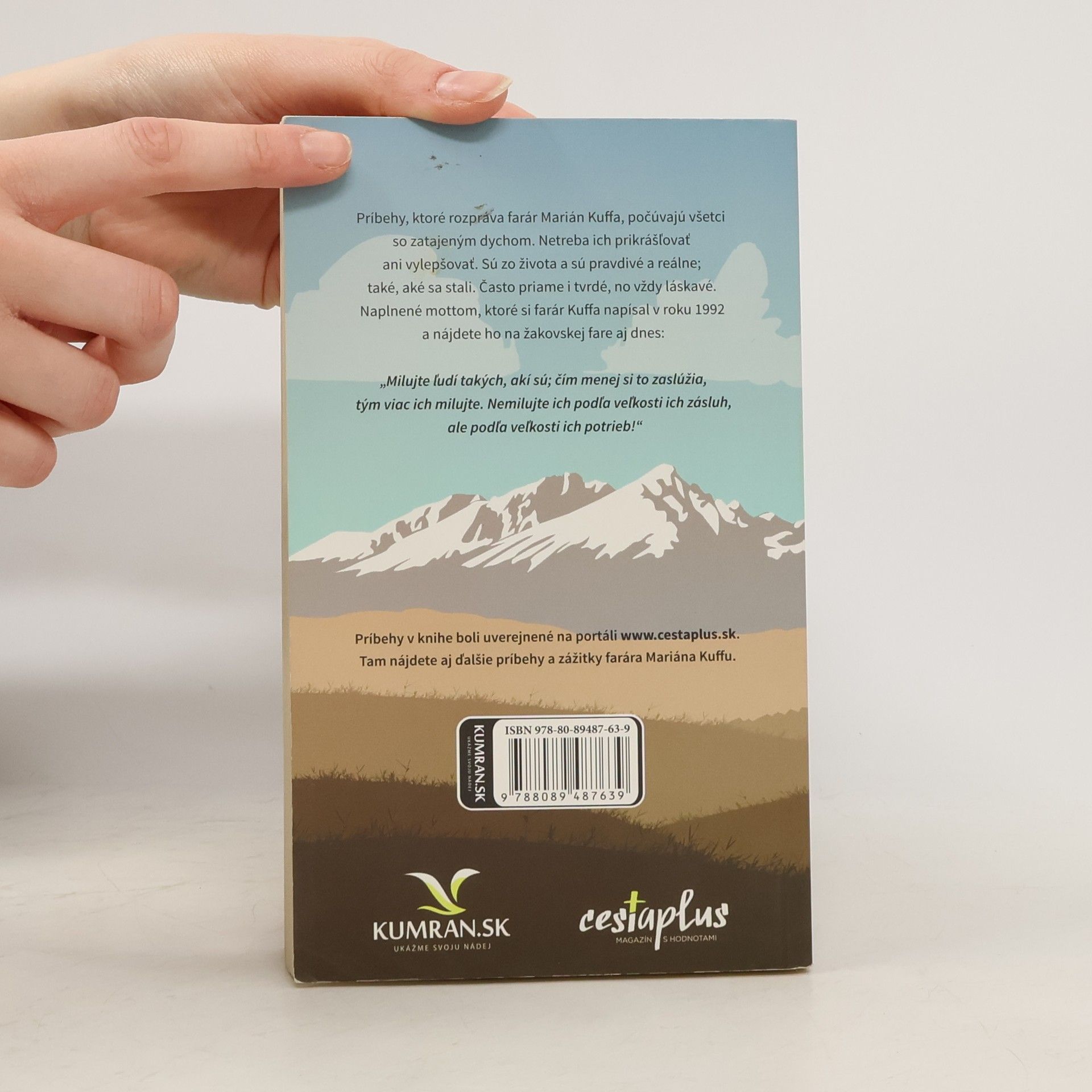 alebo V nebi nájdeš prostitútky, vrahov aj zlodejov Príbehy, ktoré rozpráva farár Marián Kuffa, počúvajú všetci so zatajeným dychom. Netreba ich prikrášľovať ani vylepšovať. Sú zo života a sú pravdivé a reálne; také, aké sa stali. Často priame i tvrdé, no vždy láskavé. Naplnené mottom, ktoré si farár Kuffa napísal v roku 1992 a nájdete ho na žakovskej fare aj dnes: „Milujte ľudí takých, akí sú; čím menej si to zaslúžia, tým viac ich milujte. Nemilujte ich podľa veľkosti ich zásluh, ale podľa veľkosti ich potrieb!“