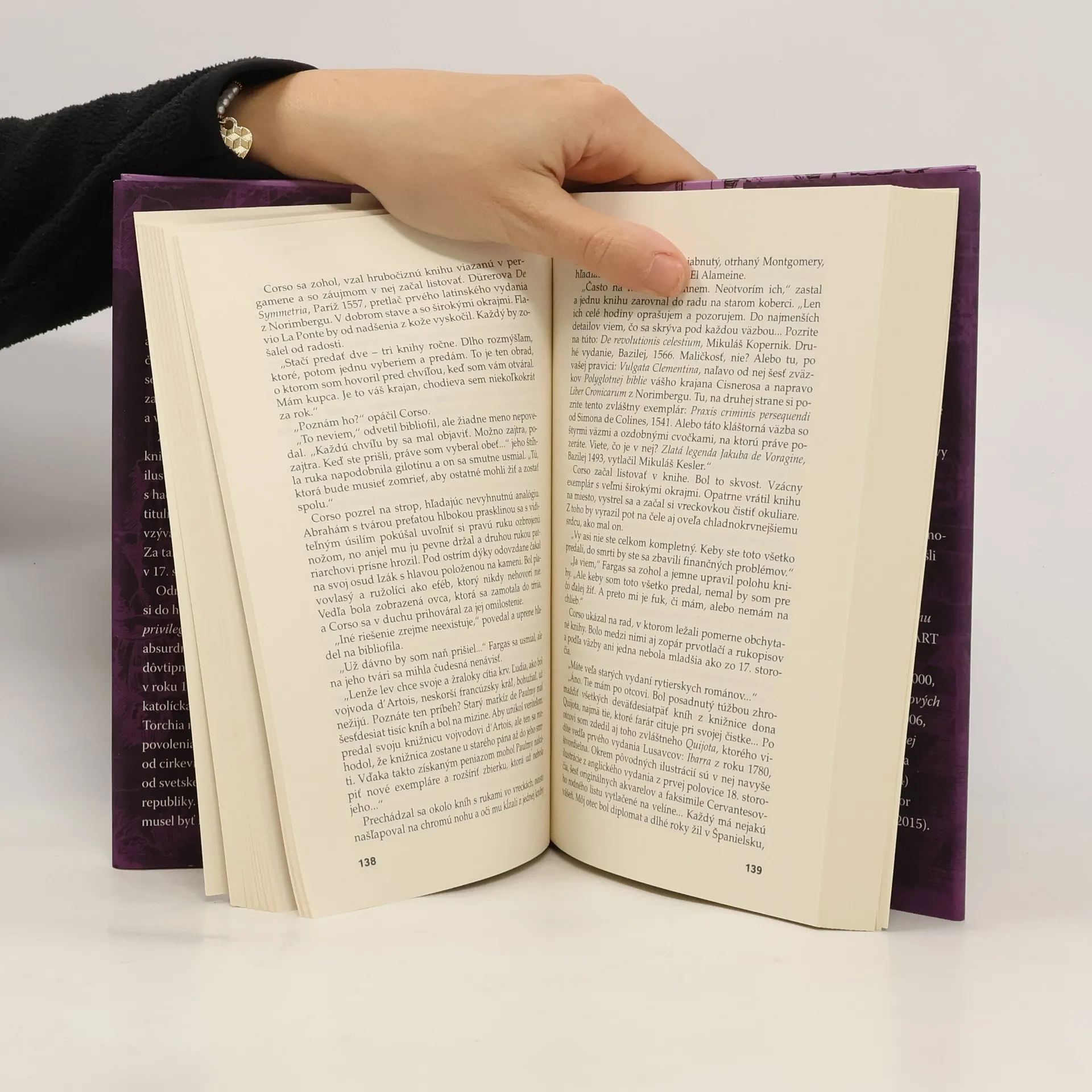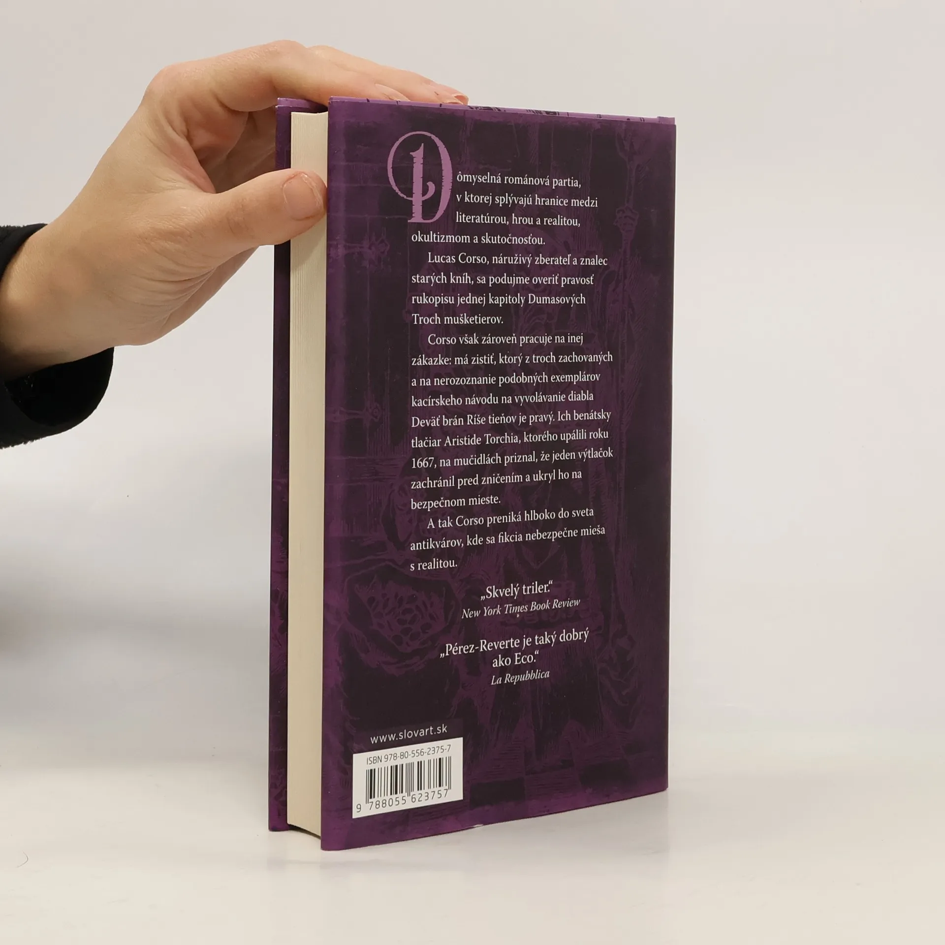 Arturo Pérez-Reverte, najčítanejší a najprekladanejší španielsky prozaik, v knihe Dumasov klub rozohráva dômyselnú intelektuálnu partiu, ktorá zamieňa hranice medzi literatúrou, hrou a realitou, okultizmom a skutočnosťou. Príbeh sa točí okolo padlých anjelov, satanských praktík a fascinácie dielami Raphaela Sabatiniho a Alexandra Dumasa, pričom sa odohráva vo svete antikvárnikov a kníhkupcov. Začína sa samovraždou zberateľa Enriqua Taillefera, objavením originálneho rukopisu z Troch mušketierov a návodom na vyvolávanie diabla. Hlavný hrdina, Lucas Corso, „nájomný lovec kníh“, sa z priateľstva k bohatému bibliofilovi Varovi Borjovi podujme overiť pravosť rukopisu. Zároveň sa snaží identifikovať pravý exemplár kacírskeho návodu na vyvolávanie diabla Deväť brán Ríše tieňov. Tieto výtlačky sú na nerozoznanie podobné a ich benátsky tlačiar Aristide Torchia, upálený v roku 1667, priznal, že jeden z nich zachránil a ukryl. Lucas Corso, sympatický a ambiciózny zberateľ starých kníh, spočiatku profesionálne sleduje svoj cieľ, no čoskoro sa fikcia začne nebezpečne miešať so skutočnosťou, pričom rozsieva smrť.