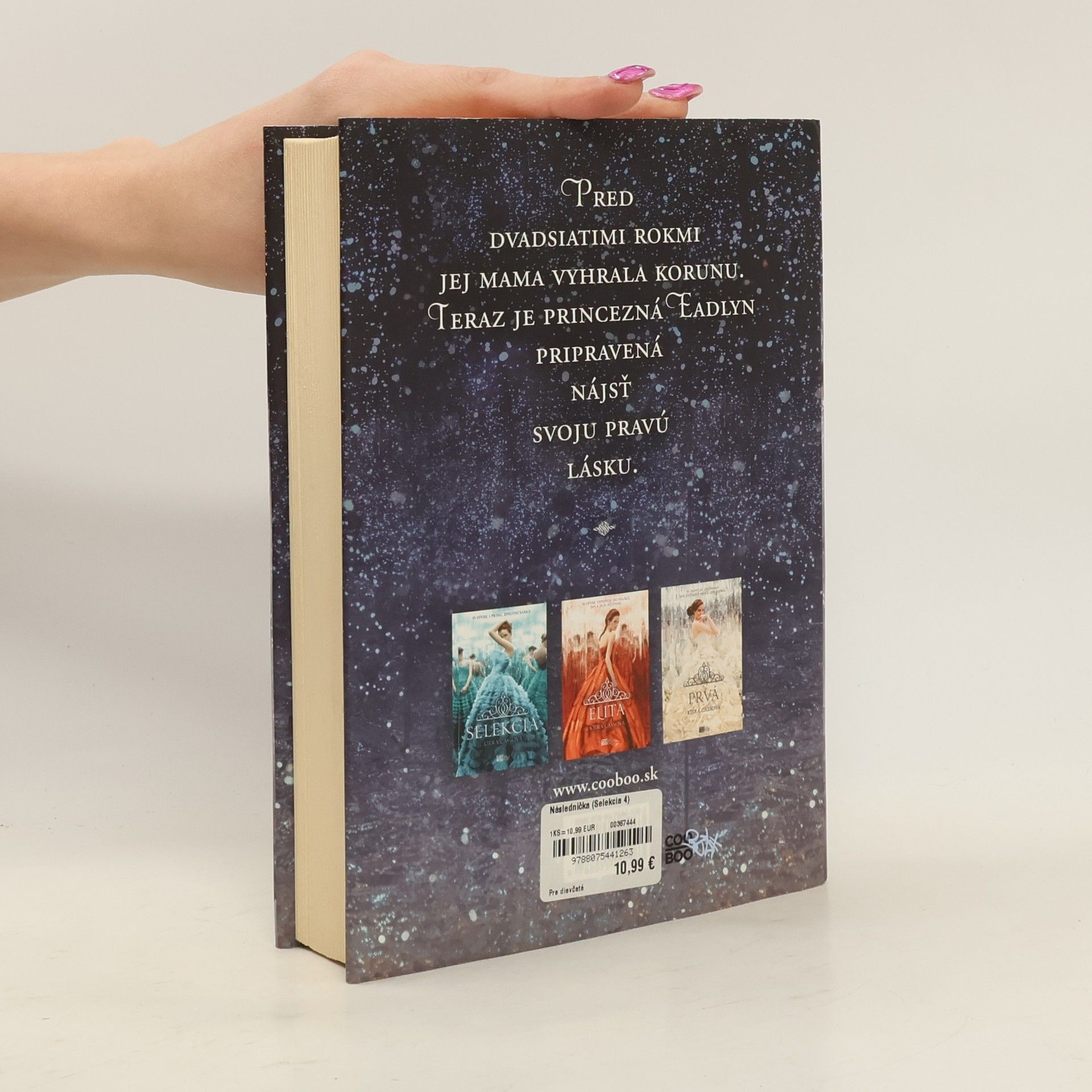 Princezná Eadlyn už odmalička počúvala nekonečný príbeh o tom, ako sa jej mama s ockom zoznámili. Pred dvadsiatimi rokmi sa America Singerová zúčastnila Selekcie a získala si srdce princa Maxona. Odvtedy žili spolu šťastne... Pre Eadlyn bol ich romantický príbeh len rozprávkou. Netúžila ho napodobniť. Ako princezná si však nemôže robiť, čo chce. Neutečie pred vlastnou Selekciou – aj keď urputne namieta. Nečaká, že sa jej príbeh skončí romanticky. Možno sa však jednému mužovi podarí zmocniť sa jej srdca... a možno zistí, že jej „šťastne a naveky“ nie je len tajným želaním.