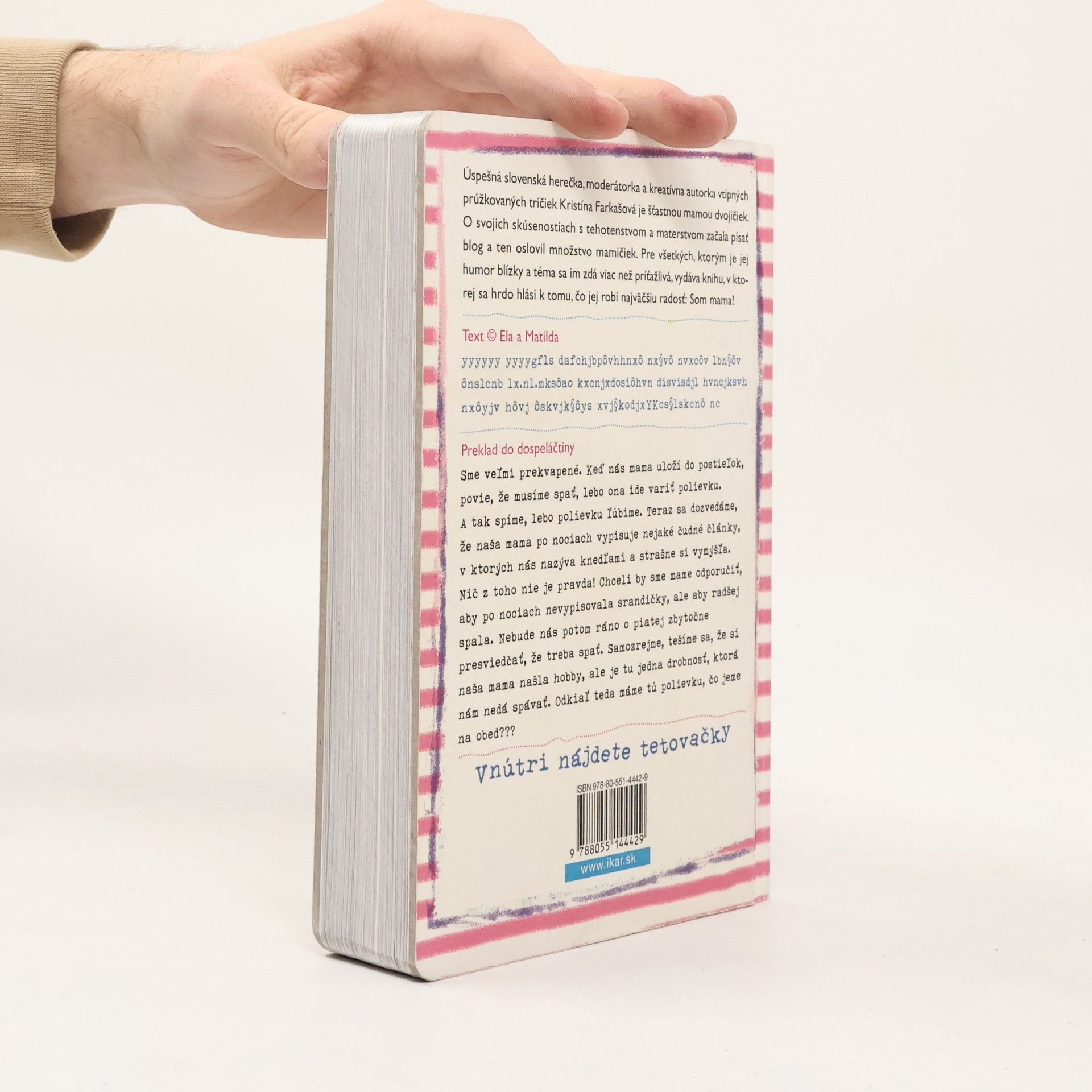 Úspešná slovenská herečka, moderátorka a kreatívna autorka vtipných prúžkovaných tričiek Kristína Farkašová je šťastnou mamou dvojičiek Ely a Matildy. O svojich skúsenostiach a zážitkoch s tehotenstvom a materstvom začala písať vtipný blog a ten oslovil množstvo mamičiek. Pre všetkých, ktorým je jej humor blízky a téma sa im zdá viac než príťažlivá, vydáva knihu, v ktorej sa hrdo hlási k tomu, čo jej robí najväčšiu radosť: Som mama! Ilustroval Boris Farkaš.