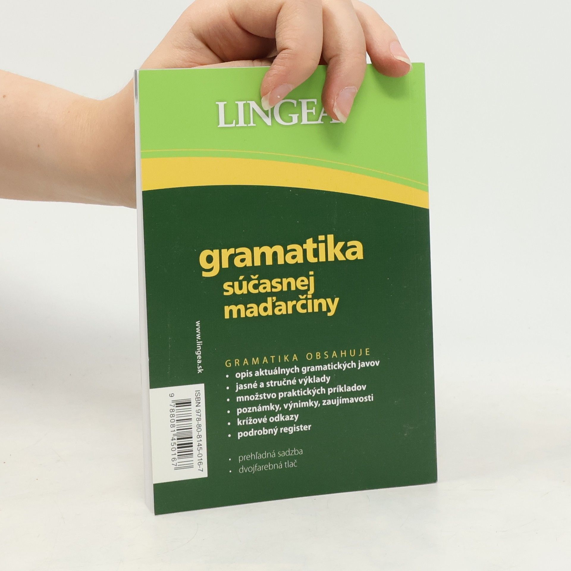 Nová autorská gramatika súčasnej maďarčiny. Obsahuje všetky bežné gramatické javy v prehľadnej grafickej úprave, bez nadmerného používania odbornej terminológie. Každý gramatický jav vysvetľuje jednoduchou poučkou a približuje ho množstvom praktických príkladov. Táto stručná príručka nie je vyčerpávajúcou teoretickou rozpravou o všetkých gramatických javoch, ale je praktickým pomocníkom bežného používateľa pri štúdiu maďarčiny. Používateľ preto nemusí mať znalosti z jazykovednej terminológie, ani čítať mnohostránkové úvody k danej problematike. Okrem stručných poučiek a príkladov obsahuje prehľadné tabuľky a množstvo praktických poznámok upozorňujúcich na výnimky, zaujímavosti či hovorové použitie jednotlivých javov. Publikácia obsahuje aj prehľad dialektov maďarčiny, okrem toho aj zoznam skratiek.