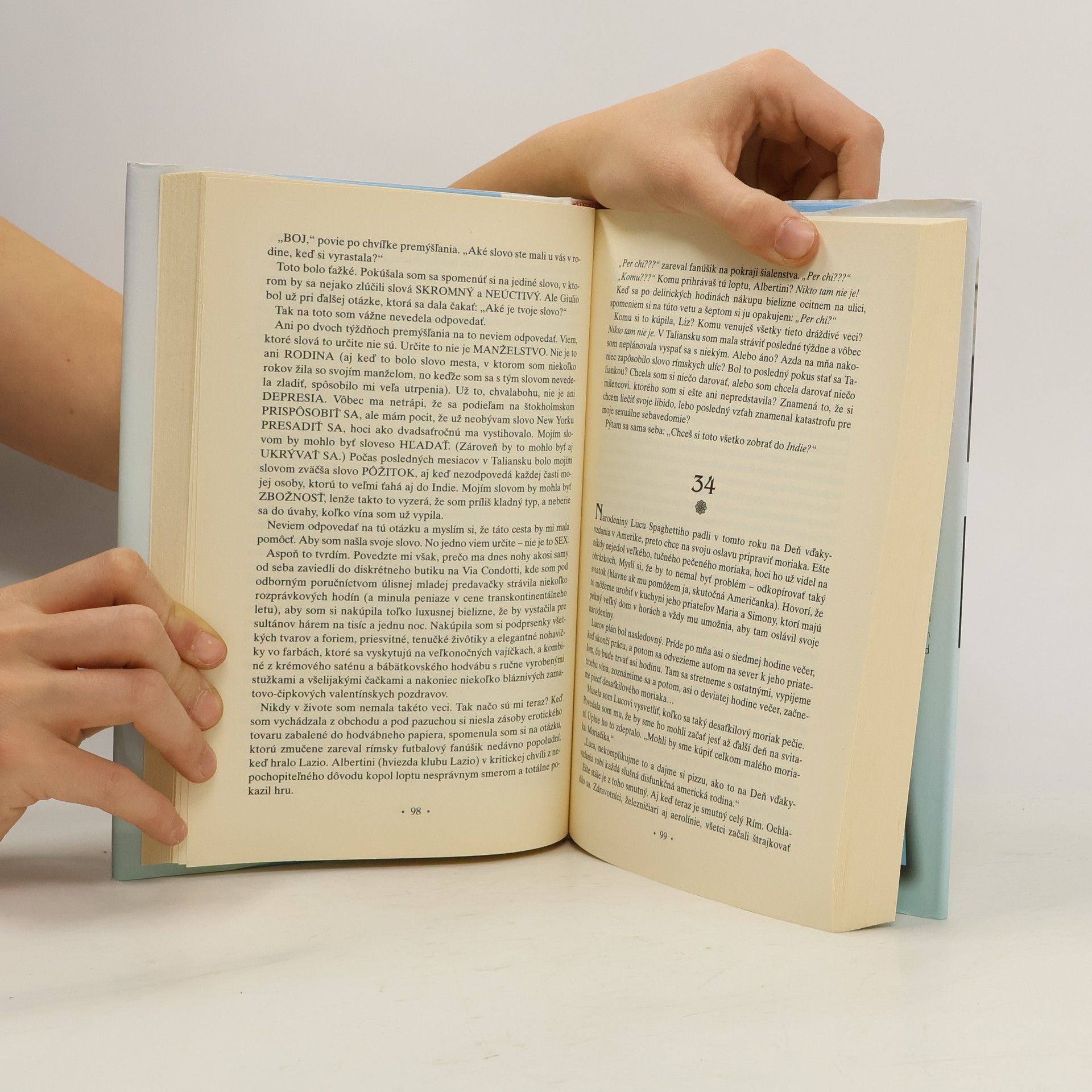 O žene, ktorá sa vybrala do Talianska, Indie a Indonézie, aby tam našla všetko... Krátko po tridsiatke mala Elizabeth Gilbertová všetko, po čom túži zvyčajne moderná Američanka – manžela, dom na vidieku, kariéru –, ale namiesto pocitov šťastia a naplnenia sa jej zmocnil panický strach a zmätok. Táto múdra a strhujúca kniha je príbehom o tom, ako zanechala všetky vonkajšie znaky úspešného života, aj o tom, čím ich nahradila. Po rozvode a zdrvujúcej depresii sa rozhodla preskúmať tri stránky svojho charakteru na scéne troch kultúr: v Taliansku hľadala pôžitok, v Indii zbožnosť a na indonézskom ostrove Bali rovnováhu medzi svetskými radosťami a božskou transcendenciou. Pôvabný, inteligentný a mimoriadne zábavný príbeh rozpráva autorka s vervou, humorom a prenikavým pohľadom, ktorým priťahuje ľudí ako magnet. Je to zarytá cestovateľka, skvelá rozprávačka, pričom terčom jej jedovatého humoru je často ona sama.