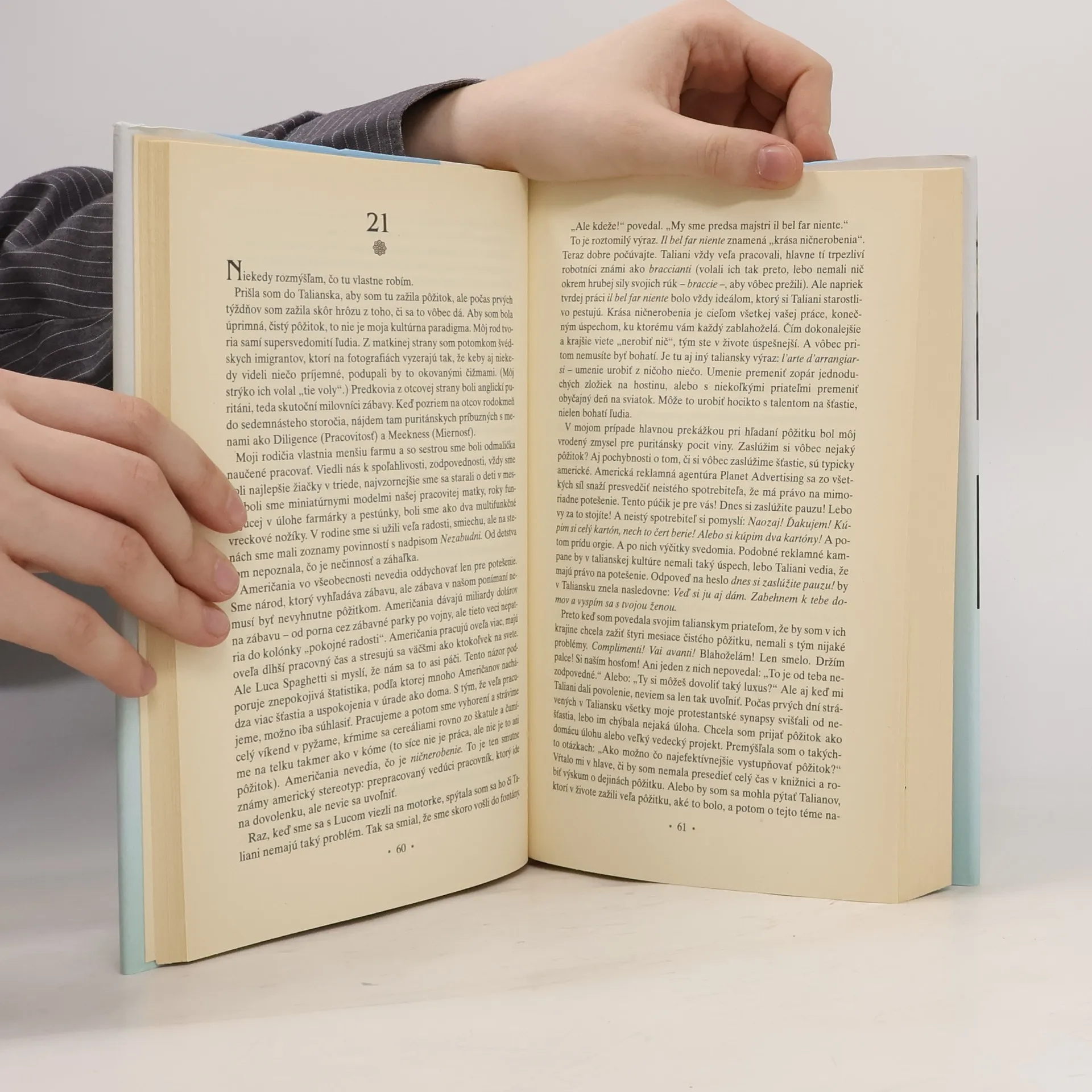 O žene, ktorá sa vybrala do Talianska, Indie a Indonézie, aby tam našla všetko... Krátko po tridsiatke mala Elizabeth Gilbertová všetko, po čom túži zvyčajne moderná Američanka – manžela, dom na vidieku, kariéru –, ale namiesto pocitov šťastia a naplnenia sa jej zmocnil panický strach a zmätok. Táto múdra a strhujúca kniha je príbehom o tom, ako zanechala všetky vonkajšie znaky úspešného života, aj o tom, čím ich nahradila. Po rozvode a zdrvujúcej depresii sa rozhodla preskúmať tri stránky svojho charakteru na scéne troch kultúr: v Taliansku hľadala pôžitok, v Indii zbožnosť a na indonézskom ostrove Bali rovnováhu medzi svetskými radosťami a božskou transcendenciou. Pôvabný, inteligentný a mimoriadne zábavný príbeh rozpráva autorka s vervou, humorom a prenikavým pohľadom, ktorým priťahuje ľudí ako magnet. Je to zarytá cestovateľka, skvelá rozprávačka, pričom terčom jej jedovatého humoru je často ona sama.