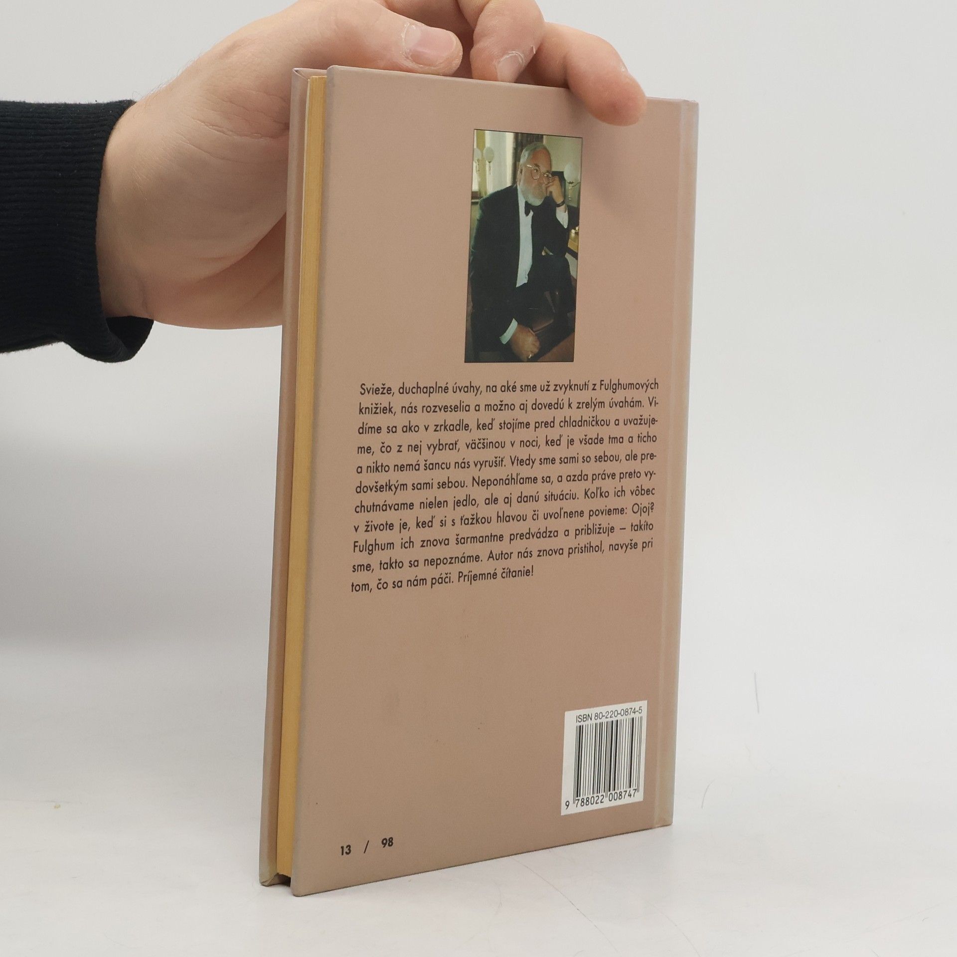 Niekoľko postrehov z oboch strán dvier chladničky. Svieže, duchaplné úvahy, na aké sme už zvyknutí z Fulghumových knižiek, nás rozveselia a možno aj doedú k zrelým úvahám.Vidíme sa ako v zrkadle. keď stojíme pred chladničkou a uvažujeme, čo z nej vybrať, väčšinou v noci, keď je všade tma a ticho a nikto nemá šancu nás vyrušiť. Vtedy sme sami sebou. Vchutnávame si nielen jedlo, ale aj danú situáciu. Koľko ich vôbec v živote je?: Ojoj? Fulghum ich znova šarmantne predvádza a približuje - takíto sme a takto sa nepoznáme.