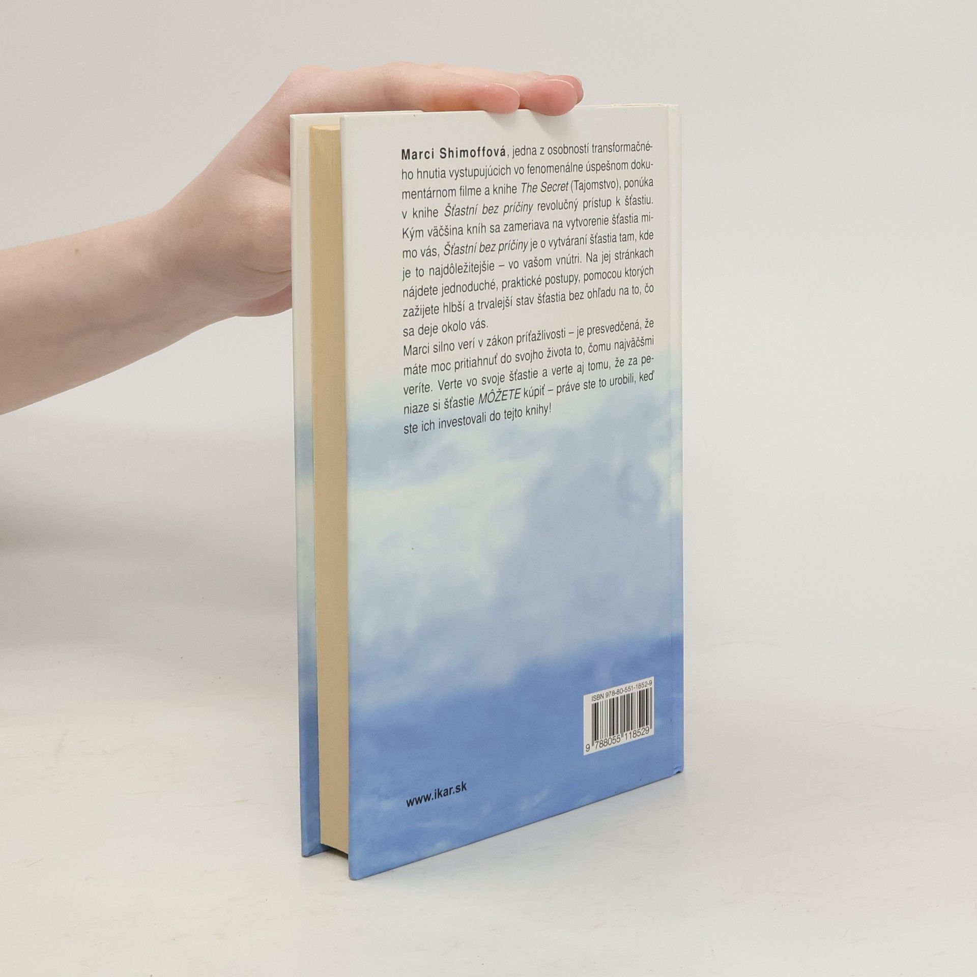Marci Shimoffová, jedna z osobností transformačného hnutia vystupujúcich vo fenomenálne úspešnom dokumentárnom filme a knihe The Secret (Tajomstvo), ponúka v knihe Šťastní bez príčiny revolučný prístup k šťastiu. Kým väčšina kníh sa zameriava na vytvorenie šťastia mimo vás, Šťastní bez príčiny je o vytváraní šťastia tam, kde je to najdôležitejšie - vo vašom vnútri. Na jej stránkach nájdete jednoduché, praktické postupy, pomocou ktorých zažijete hlbší a trvalejší stav šťastia bez ohľadu na to, čo sa deje okolo vás. Marci silno verí v zákon príťažlivosti - je presvedčená, že máte moc pritiahnuť do svojho života to, čomu najväčšmi veríte. Verte vo svoje šťastie a verte aj tomu, že za peniaze si šťastie MÔŽETE kúpiť - práve ste to urobili, keď ste ich investovali do tejto knihy!