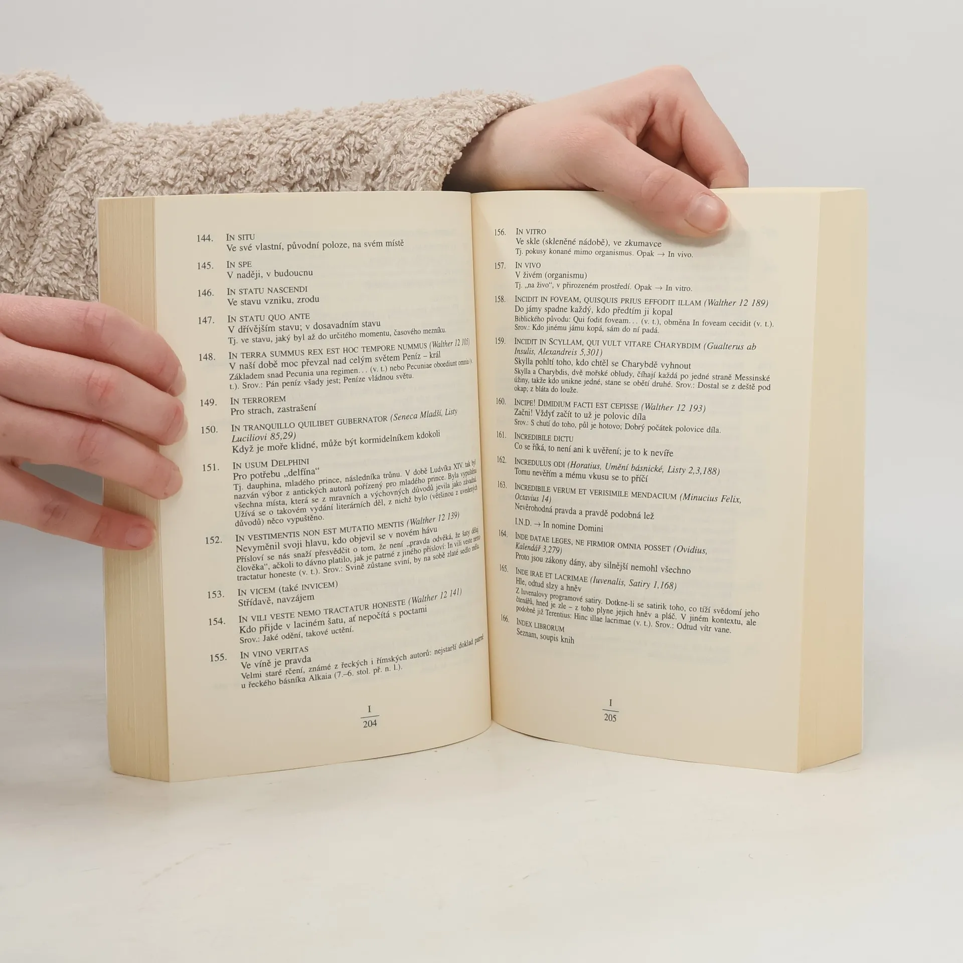 Široký výběr několika tisíc latinských starověkých, biblických i středověkých okřídlených rčení, citátů a dalších užitečných obratů, z nichž se velká část vztahuje k důvěrně známým, běžným tématům, situacím a zkušenostem. Citáty jsou vysvětleny a okomentovány, jejich hledání usnadňují rejstříky latinských i českých klíčových slov a českých paralelních přísloví a rčení, jež umožňují najít i pozapomenutý citát. Připojeno je rovněž poučení o latinské výslovnosti.