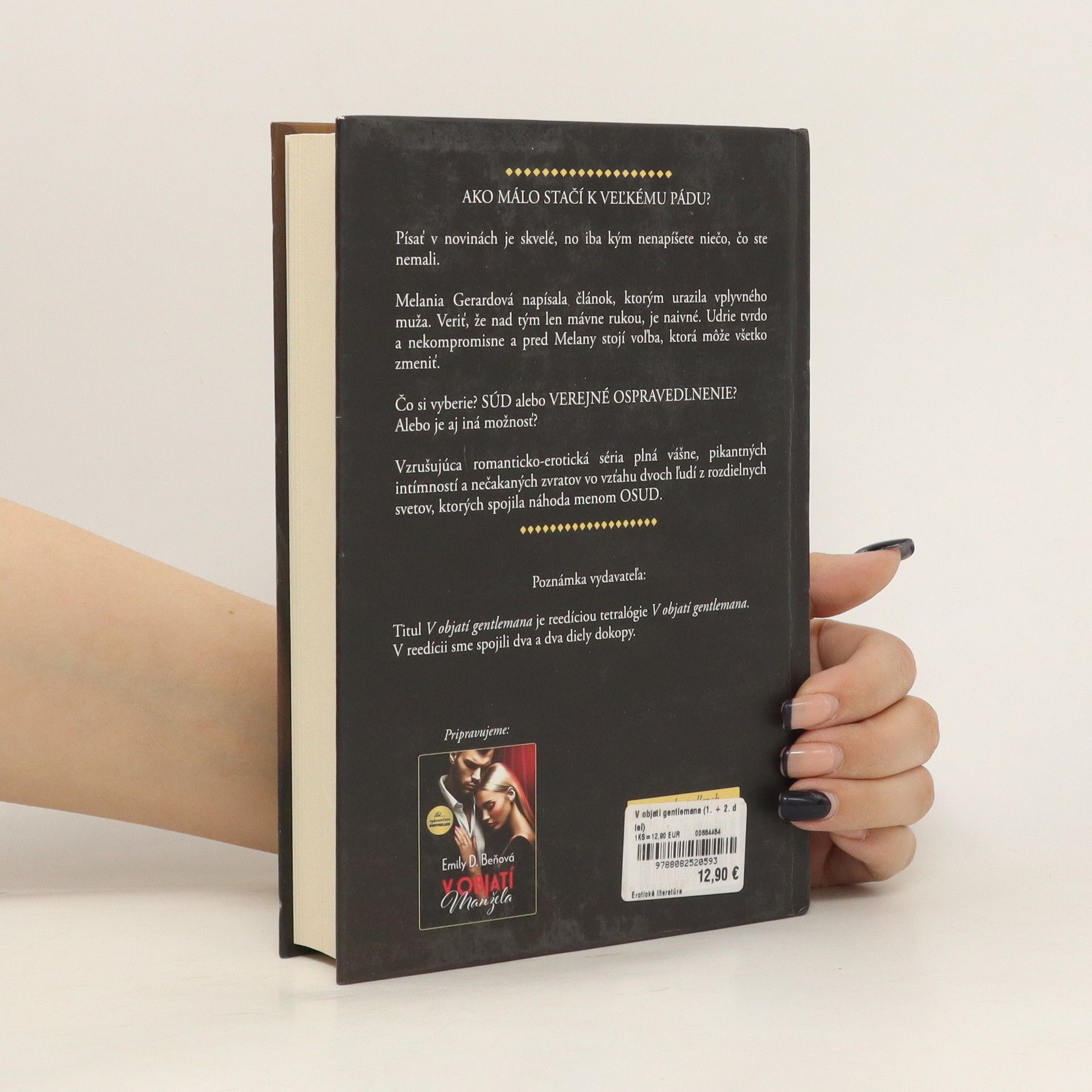 Reedícia tetralógie V objatí gentlemana. Obsahuje prvé dva diely:V objatí gentlemana + V objatí nepriateľa.AKO MÁLO STAČÍ K VEĽKÉMU PÁDU?Písať v novinách je skvelé, no iba dokým nenapíšete niečo, čo ste nemali.Melania Gerardová napísala článok, ktorým urazila vplyvného muža. Veriť, že nad tým len mávne rukou je naivné. Udrie tvrdo a nekompromisne a pred Melany stojí voľba, ktorá môže všetko zmeniť.Čo si vyberie? SÚD alebo VEREJNÉ OSPRAVEDLNENIE?Alebo je aj iná možnosť?Vzrušujúca romanticko-erotická séria plná vášne, pikantných intímností a nečakaných zvratov vzťahu dvoch ľudí z rozdielnych svetov, ktorých spojila náhoda menom OSUD.