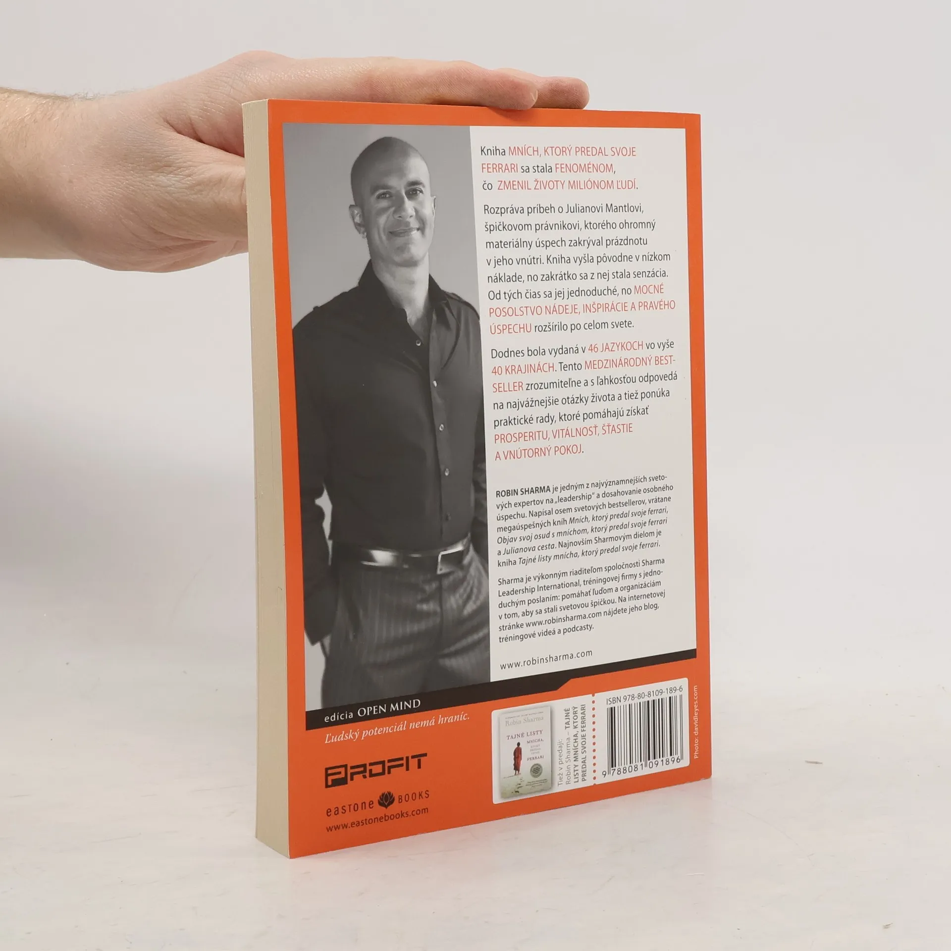 Mních, ktorý predal svoje Ferrari, je kniha, ktorá sa stala fenoménom. Vyšla pred desiatimi rokmi a odvtedy zmenila miliónom ľudí život. Rozpráva príbeh o Julianovi Mantlovi, špičkovom právnikovi, ktorého ohromný materiálny úspech zakrýval prázdnotu v jeho vnútri. Kniha vyšla pôvodne v nízkom náklade, no zakrátko sa z nej stala senzácia. Od tých čias sa jej jednoduché, no mocné posolstvo nádeje, inšpirácie a pravého úspechu rozšírilo po celom svete. Dodnes bola vydaná v 46 jazykoch vo vyše 40 krajinách. Tento medzinárodný bestseller zrozumiteľne a s ľahkosťou odpovedá na najvážnejšie otázky života a tiež ponúka praktické rady, ktoré pomáhajú získať prosperitu, vitálnosť, šťastie a vnútorný pokoj.